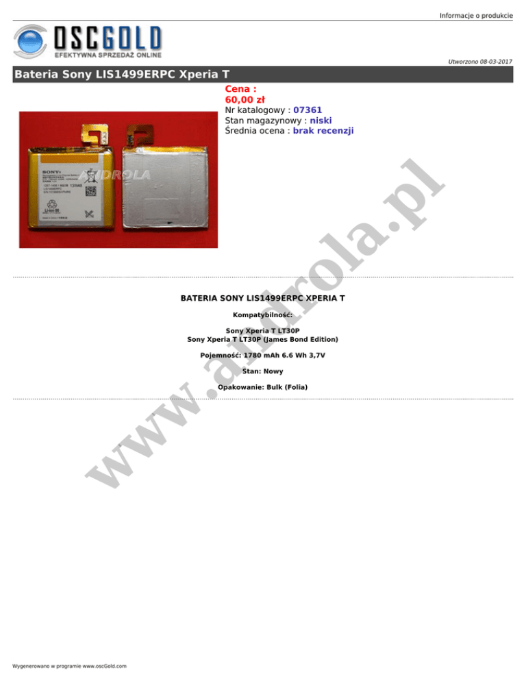 Informacje o produkcie Utworzono 08-03-2017 Bateria Sony LIS1499ERPC Xperia T Cena : 60,00 zł ro la .p l Nr katalogowy : 07361 Stan magazynowy : niski Średnia ocena : brak recenzji BATERIA SONY LIS1499ERPC XPERIA T nd Kompatybilność: Sony Xperia T LT30P Sony Xperia T LT30P (James Bond Edition) w .a Pojemność: 1780 mAh 6.6 Wh 3,7V Stan: Nowy w w Opakowanie: Bulk (Folia) Wygenerowano w programie www.oscGold.com