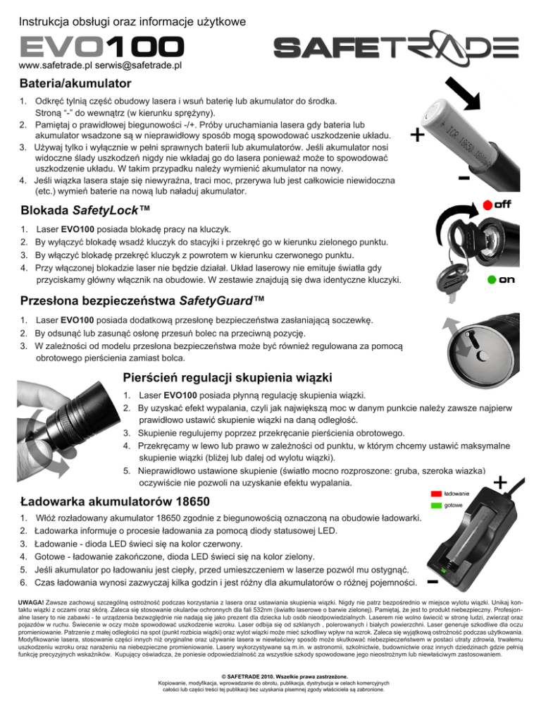 Instrukcja obsługi oraz informacje użytkowe EVO100 www.safetrade.pl [email protected] Bateria/akumulator 1. Odkręć tylnią część obudowy lasera i wsuń baterię lub akumulator do środka. Stroną “-” do wewnątrz (w kierunku sprężyny). 2. Pamiętaj o prawidłowej biegunowości -/+. Próby uruchamiania lasera gdy bateria lub akumulator wsadzone są w nieprawidłowy sposób mogą spowodować uszkodzenie układu. 3. Używaj tylko i wyłącznie w pełni sprawnych baterii lub akumulatorów. Jeśli akumulator nosi widoczne ślady uszkodzeń nigdy nie wkładaj go do lasera ponieważ może to spowodować uszkodzenie układu. W takim przypadku należy wymienić akumulator na nowy. 4. Jeśli wiązka lasera staje się niewyraźna, traci moc, przerywa lub jest całkowicie niewidoczna (etc.) wymień baterie na nową lub naładuj akumulator. Blokada SafetyLock™ 1. 2. 3. 4. Laser EVO100 posiada blokadę pracy na kluczyk. By wyłączyć blokadę wsadź kluczyk do stacyjki i przekręć go w kierunku zielonego punktu. By włączyć blokadę przekręć kluczyk z powrotem w kierunku czerwonego punktu. Przy włączonej blokadzie laser nie będzie działał. Układ laserowy nie emituje światła gdy przyciskamy główny włącznik na obudowie. W zestawie znajdują się dwa identyczne kluczyki. Przesłona bezpieczeństwa SafetyGuard™ 1. Laser EVO100 posiada dodatkową przesłonę bezpieczeństwa zasłaniającą soczewkę. 2. By odsunąć lub zasunąć osłonę przesuń bolec na przeciwną pozycję. 3. W zależności od modelu przesłona bezpieczeństwa może być również regulowana za pomocą obrotowego pierścienia zamiast bolca. Pierścień regulacji skupienia wiązki 1. Laser EVO100 posiada płynną regulację skupienia wiązki. 2. By uzyskać efekt wypalania, czyli jak największą moc w danym punkcie należy zawsze najpierw prawidłowo ustawić skupienie wiązki na daną odległość. 3. Skupienie regulujemy poprzez przekręcanie pierścienia obrotowego. 4. Przekręcamy w lewo lub prawo w zależności od punktu, w którym chcemy ustawić maksymalne skupienie wiązki (bliżej lub dalej od wylotu wiązki). 5. Nieprawidłowo ustawione skupienie (światło mocno rozproszone: gruba, szeroka wiązka) oczywiście nie pozwoli na uzyskanie efektu wypalania. Ładowarka akumulatorów 18650 1. 2. 3. 4. 5. 6. Włóż rozładowany akumulator 18650 zgodnie z biegunowością oznaczoną na obudowie ładowarki.. Ładowarka informuje o procesie ładowania za pomocą diody statusowej LED. Ładowanie - dioda LED świeci się na kolor czerwony. Gotowe - ładowanie zakończone, dioda LED świeci się na kolor zielony. Jeśli akumulator po ładowaniu jest ciepły, przed umieszczeniem w laserze pozwól mu ostygnąć. Czas ładowania wynosi zazwyczaj kilka godzin i jest różny dla akumulatorów o różnej pojemności. UWAGA! Zawsze zachowuj szczególną ostrożność podczas korzystania z lasera oraz ustawiania skupienia wiązki. Nigdy nie patrz bezpośrednio w miejsce wylotu wiązki. Unikaj kontaktu wiązki z oczami oraz skórą. Zaleca się stosowanie okularów ochronnych dla fali 532nm (światło laserowe o barwie zielonej). Pamiętaj, że jest to produkt niebezpieczny. Profesjonalne lasery to nie zabawki - te urządzenia bezwzględnie nie nadają się jako prezent dla dziecka lub osób nieodpowiedzialnych. Laserem nie wolno świecić w stronę ludzi, zwierząt oraz pojazdów w ruchu. Świecenie w oczy może spowodować uszkodzenie wzroku. Laser odbija się od szklanych , polerowanych i białych powierzchni. Laser generuje szkodliwe dla oczu promieniowanie. Patrzenie z małej odległości na spot (punkt rozbicia wiązki) oraz wylot wiązki może mieć szkodliwy wpływ na wzrok. Zaleca się wyjątkową ostrożność podczas użytkowania. Modyfikowanie lasera, stosowanie części innych niż oryginalne oraz używanie lasera w niewłaściwy sposób może skutkować niebezpieczeństwem w postaci utraty zdrowia, trwałemu uszkodzeniu wzroku oraz narażeniu na niebezpieczne promieniowanie. Lasery wykorzystywane są m.in. w astronomii, szkolnictwie, budownictwie oraz innych dziedzinach gdzie pełnią funkcję precyzyjnych wskaźników. Kupujący oświadcza, że poniesie odpowiedzialność za wszystkie szkody spowodowane jego nieostrożnym lub niewłaściwym zastosowaniem. © SAFETRADE 2010. Wszelkie prawa zastrzeżone. Kopiowanie, modyfikacja, wprowadzanie do obrotu, publikacja, dystrybucja w celach komercyjnych całości lub części treści tej publikacji bez uzyskania pisemnej zgody właściciela są zabronione.