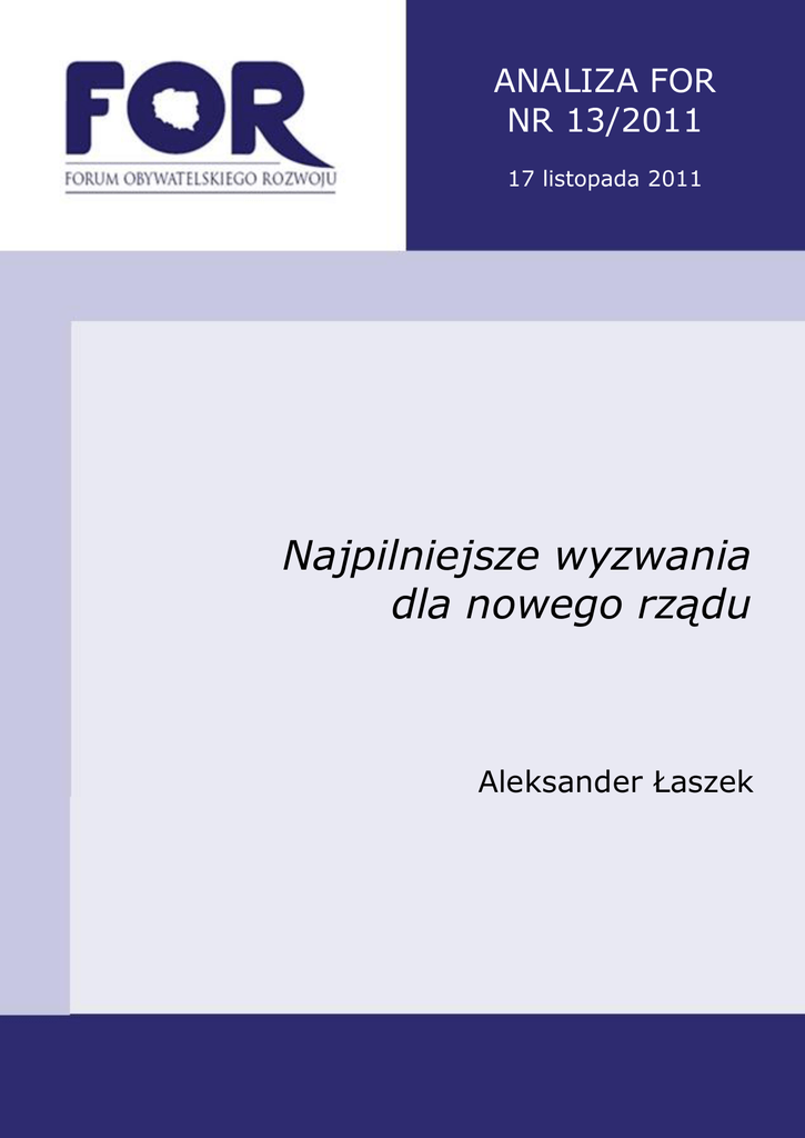 ANALIZA FOR NR 13/2011 17 listopada 2011 Najpilniejsze wyzwania dla nowego rządu Aleksander Łaszek Najpilniejsze wyzwania dla nowego rządu Synteza Najpilniejszym wyzwaniem dla nowego rządu jest naprawa finansów publicznych. Ich zły stan jest ściśle powiązany z niską aktywnością zawodową Polaków, wynikającą m.in. ze źle adresowanych wydatków socjalnych i emerytalnych przywilejów branżowych. W obliczu pogarszającej się sytuacji demograficznej Polski oraz rosnącej długości życia konieczne jest stopniowe podnoszenie wieku emerytalnego kobiet i mężczyzn do 67 lat. Należy objąć powszechnym systemem emerytalnym grupy dotychczas z niego wyłączone (służby mundurowe, górnicy, rolnicy). Oszczędności trzeba szukać także poza systemem emerytalnym, m.in. poprzez lepsze zarządzanie usługami wsparcia dla administracji publicznej czy poprzez dostosowanie liczby nauczycieli w szkołach do malejącej liczby uczniów. Konieczne jest gruntowne uproszczenie systemu podatkowego. Stawki podatku VAT należy ujednolicić. Ujednoliceniu stawki VAT na poziomie zwiększającym dochody sektora finansów publicznych powinno towarzyszyć obniżenie podatków bezpośrednich płaconych przez mniej zamożne gospodarstwa domowe utrzymujące się z pracy. Kombinacja taka zwiększy opłacalność pracy. PIT i CIT należy zastąpić podatkiem od dochodów osobistych oraz podatkiem dochodowym od prowadzenia działalności gospodarczej. Równocześnie należy zlikwidować większość obecnie istniejących, nieefektywnych ulg i preferencji podatkowych. Wciąż nie wykorzystanym źródłem wzrostu w Polsce pozostaje deregulacja. Należy ograniczyć antyrynkowe regulacje, sztucznie ograniczające konkurencję w niektórych sektorach takich jak np. zawody prawnicze. Zmiany instytucjonalne, które wymuszą poprawę jakości Oceny Skutków Regulacji mogą ograniczyć obecnie powszechną praktykę masowego tworzenia nieprzemyślanych i szkodliwych przepisów. 1. Spośród krajów Europy ŚrodkowoWschodniej wyższy dług publiczny w relacji do PKB w 2011 roku będą miały tylko pogrążone w kryzysie Węgry Finanse publiczne i aktywność zawodowa Stan polskich finansów publicznych na tle innych krajów o zbliżonym poziomie rozwoju i podobnej wiarygodności kredytowej jest zły. Spośród krajów Europy Środkowo-Wschodniej będących członkami UE wyższy dług publiczny w relacji do PKB w 2011 roku będą miały tylko pogrążone w kryzysie Węgry, a wyższy deficyt sektora finansów publicznych tylko Słowacja i Słowenia. W czasach dobrej koniunktury na świecie utrzymujący się duży deficyt sektora finansów publicznych i będący jego konsekwencją dług publiczny ograniczały tempo rozwoju polskiej gospodarki. W czasach rosnącej niepewności na świecie brak naprawy finansów publicznych zwiększałby podatność Polski na „zarażenie się” kryzysem finansowym. W czasie pierwszej fali światowego kryzysu finansowego Polska była jedynym krajem w UE, który nie odnotował recesji. Obecnie Polska stoi przed alternatywą: albo reformy i awans do grupy krajów o wysoko ocenianej polityce gospodarczej i dużej wiarygodności, albo brak reform i rosnące ryzyko zarażenia się kryzysem w przypadku jego dalszego pogłębienia się w strefie euro. Źródło: IMF WEO 2011 Do szybszej redukcji deficytu wezwał Polskę Komisarz Olli Rehn… …przy braku reform Polsce może grozić obniżenie perspektywy ratingu… Działania dotychczas podjęte przez polski rząd w celu ograniczenia deficytu sektora finansów publicznych należy uznać za niewystarczające. W jesiennej prognozie z listopada br. Komisja Europejska przewiduje, że w przyszłym roku deficyt sektora finansów publicznych w Polsce wyniesie 4% PKB, przy założeniu 2,5% wzrostu gospodarczego. Pogłębiający się kryzys w strefie euro może jednak spowodować spadek tempa wzrostu gospodarczego w Polsce, a w konsekwencji wyższy od prognozowanego deficyt sektora finansów publicznych. W świetle tych prognoz do szybszej redukcji deficytu wezwał Polskę Komisarz Olli Rehn (Polska od 2009 roku jest objęta procedurą nadmiernego deficytu i jest zobowiązana do 2012 roku ograniczyć go do 3% PKB). Również agencje ratingowe zwracają uwagę, że przy braku reform Polsce może grozić obniżenie perspektywy ratingu, co będzie wiązało się ze wzrostem kosztów obsługi długu. Przy naprawie finansów publicznych priorytetem rządu powinno być ograniczenie wydatków publicznych. Doświadczenia międzynarodowe pokazują, że programy naprawy finansów publicznych oparte o redukcję wydatków są skuteczniejsze i trwalsze od programów opartych o wzrost podatków (patrz np. OECD 2007). Ponadto, wysokie wydatki publiczne negatywnie wpływają na tempo wzrostu gospodarczego (Fisher 1993, Loayza i inni 2005), a obecnie ich udział w PKB w Polsce (45,2% w 2011) należy do najwyższych w regionie (średnia dla UE-10: 42,1%) i jest znacznie wyższy niż w dynamicznie rozwijających się krajach Azji, czy w krajach Europy Zachodniej, gdy były one na poziomie rozwoju zbliżonym do Polski. Zły stan polskich finansów publicznych jest powiązany z niską aktywnością zawodową Polaków. W 2010 roku w Polsce tylko 65,6% osób w wieku 15-64 lata było aktywnych zawodowo, przy średniej dla UE wynoszącej 71%. Nieprzemyślany system różnych przywilejów branżowych i świadczeń socjalnych z jednej strony generuje wysokie wydatki publiczne, z drugiej strony zniechęca ludzi do pracy, co skutkuje niższymi wpływami podatkowymi (Wojciechowski 2008). Tylko na Malcie i w Słowenii odsetek osób w wieku 55-64 biernych zawodowo był wyższy niż w Polsce. Skala problemu z niską aktywnością zawodową Polaków jest szczególnie widoczny w grupie osób w wieku 55-64 lata. Aktywność zawodowa w tej grupie wiekowej w Polsce w 2010 roku wynosiła 36,7%, przy średniej unijnej równej 49,7%. Tylko na Malcie i w Słowenii odsetek osób w wieku 5