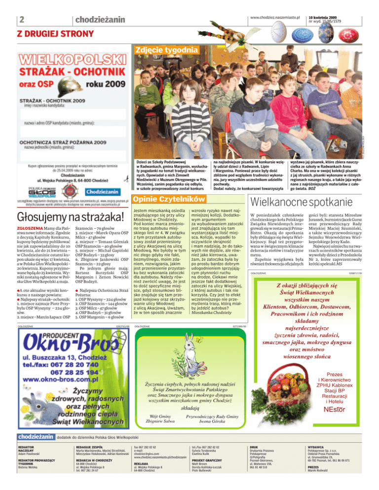 2 www.chodziez.naszemiasto.pl chodzieżanin 10 kwietnia 2009 nr wyd. 15/85/1579 Z DRUGIEJ STRONY FOT. BOŻENAWOLSKA Zdjęcie tygodnia Dzieci ze Szkoły Podstawowej w Radwankach, gmina Margonin, wysłuchały pogadanki na temat tradycji wielkanocnych. Opowiadał o nich Zimowit Niedźwiecki z Muzeum Okręgowego w Pile. Wcześniej, zanim pogadanka się odbyła, w szkole przeprowadzony został konkurs na najładniejsze pisanki. W konkursie wzięły udział dzieci z Radwanek, Lipin i Margonina. Ponieważ prace były dość zbliżone pod względem trudności wykonania, jury wszystkim uczestnikom udzieliło pochwały. Dodać należy, że konkursowi towarzyszyła Opinie Czytelników Głosujemynastrażaka! ZGŁOSZENIA Mamy dla Pań- stwa nowe informacje. Zgodnie z decyzją Kapituły Konkursu, kupony będziemy publikować nie jak zapowiadaliśmy do 10 kwietnia, ale do 21 kwietnia – w Chodzieżaninie ostatni kupon ukaże się więc 17 kwietnia, a w Polska Głos Wielkopolski 20 kwietnia. Kupony przyjmowane będą do 25 kwietnia. Wyniki zostaną ogłoszone w Polska Głos Wielkopolski 4 maja. Szamocin – 79 głosów 3. miejsce –Marek Opara OSP Milcz - 47 głosów 4. miejsce – Tomasz Górniak OSP Szamocin – 40 głosów 5. miejsce – Michał Gapiński OSP Budzyń – 33 głosy 6. Zbigniew Jankowski OSP Szamocin – 22 głosy Po jednym głosie mają: Bartosz Burzyński OSP Margonin i Zenon Nowicki OSP Budzyń. aA oto aktualne wyniki konkursu z naszego powiatu: a Najlepszy strażak– ochotnik: 1. miejsce zajmuje Piotr Przybyła OSP Wyszyny – 224 głosów. 2. miejsce - Marcin Łapacz OSP a Najlepsza Ochotnicza Straż Pożarna: 1. OSP Wyszyny – 224 głosów 2. OSP Szamocin – 144 głosów 3. OSP Milcz - 47 głosów 4. OSP Budzyń – 31 głosów 5. OSP Margonin – 6 głosów OGŁOSZENIE chodzieżanin 0263763/00 Jestem mieszkanką osiedla znajdującego się przy ulicy Miodowej w Chodzieży. Pod koniec marca zmieniono trasę autobusu miejskiego linii nr 4. W związku z tym przystanek autobusowy został przeniesiony z ulicy Akacjowej na ulicę Miodową. Nie byłoby w tym nic złego gdyby nie fakt, bezmyślnego, moim zdaniem, rozwiązania, jakim jest przeniesienie przystanku bez wykonania zatoczki dla autobusu. Należy również zwrócić uwagę, że jest to dość specyficzne miejsce, gdyż stosunkowo blisko znajduje się tam przejazd kolejowy oraz skrzyżowanie ulicy Miodowej z ulicą Akacjową. Uważam, że w ten sposób znacznie wystawa jaj-pisanek, które zbiera nauczycielka ze szkoły w Radwankach Anna Charko. Ma ona w swojej kolekcji pisanki z jaj strusich, pisanki wykonane w różnych regionach naszego kraju, a także jaja wykonane z najróżniejszych materiałów z całego świata. BOŻ Wielkanocnespotkanie wzrosło ryzyko nawet najmniejszej kolizji. Dodatkowym argumentem za wybudowaniem zatoczki jest znajdująca się tam wystarczająca ilość miejsca. Kolizje, wypadki to oczywiście skrajność i mam nadzieję, że do takowych nie dojdzie, ale również jako kierowca, uważam, że zatoczka była by po prostu bardzo dobrym udogodnieniem sprzyjającym płynności ruchu na drodze. Ciekawi mnie jeszcze fakt dodatkowej zatoczki na ulicy Wiejskiej, z której autobus i tak nie korzysta. Czy jest to efekt wcześniejszego nie przemyślenia trasy, którą miałby jeździć autobus? W poniedziałek członkowie chodzieskiego koła Polskiego Związku Niewidomych integrowali się w restauracji PrimaBistro. Okazją do spotkania były zbliżające się święta Wielkiejnocy. Stąd też przygotowana w świątecznym klimacie dekoracja stołów i tradycyjne menu. Zupełnie wyjątkowa była również frekwencja oficjalnych gości byli: starosta Mirosław Juraszek, burmistrz Jacek Gursz oraz przewodniczący Rady Miejskiej Maciej Szumiński, a także wiceprzewodniczący Sejmiku Województwa Wielkopolskiego Jerzy Kado. Najwięcej uśmiechu na twarzach uczestników spotkania wywołały dzieci z Przedszkola Nr 2, które zaprezentowały krótki spektakl.MS OGŁOSZENIE 0268717/00 Mieszkanka Chodzieży OGŁOSZENIE 0273389/00 dodatek do dziennika Polska Głos Wielkopolski REDAKTOR NACZELNY Adam Pawłowski REDAGUJE ZESPÓŁ Marta Maciejewska, Maciej Strzeliński, Mieczysław Hołubowski, Adrian Kaniewski REDAKTOR PROWADZĄCY TYGODNIK Bożena Wolska REDAKCJA W CHODZIEŻY 64-800 Chodzież ul. Wojska Polskiego 8 tel. 067 281 24 67 fax 067 282 02 02 e-mail: [email protected] www.chodziez.naszemiasto.pl/chodziezanin REKLAMA ul. Wojska Polskiego 8 64-800 Chodzież tel./fax 067 282 02 02 Sylwia Tyrakowska Ewelina Kulik PROJEKT GRAFICZNY Matt Brown Dorota Kalińska-Łuczak Piotr Butlewski DRUK Drukarnia Prasowa Polskapresse O/Poligrafia Poznań-Skórzewo, ul. Malwowa 158, 061 81 48 510 WYDAWCA Polskapresse Sp. z o.o. Oddział Prasa Poznańska ul. Grunwaldzka 19, 60-782 Poznań, tel. 061 86 06 071 PREZES Marek Rodwald