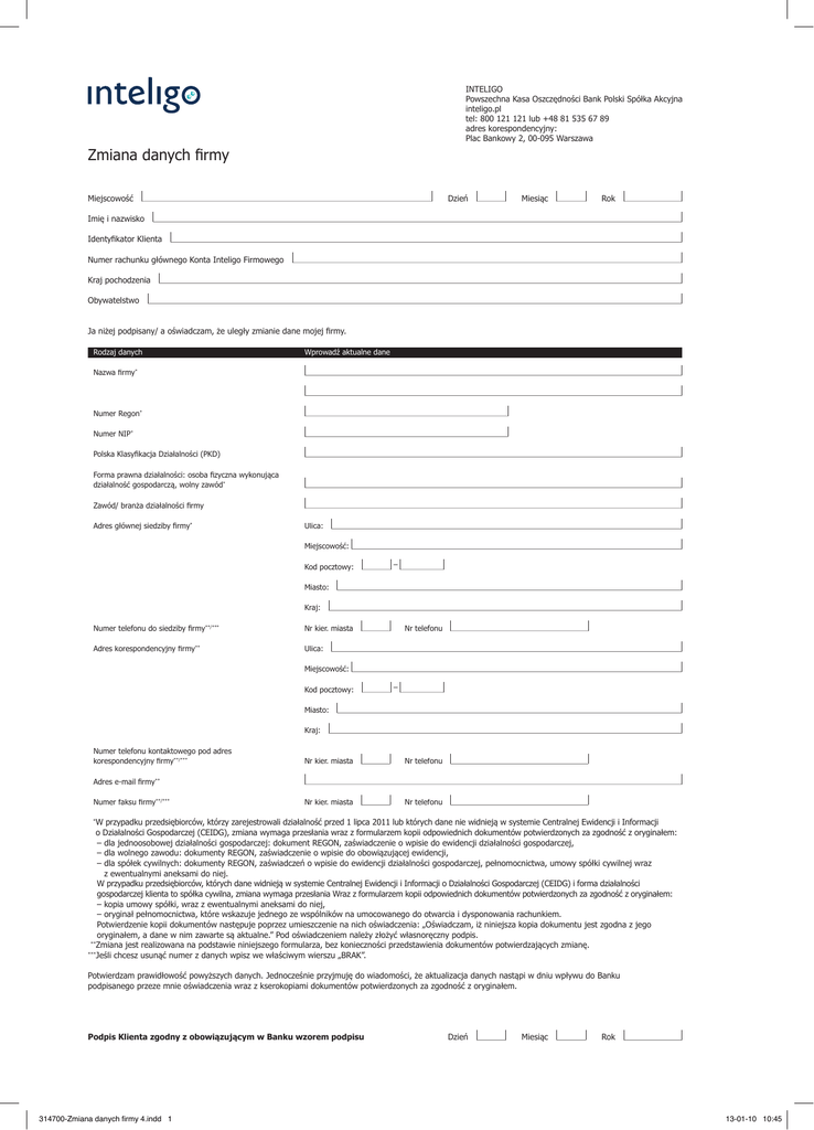 INTELIGO Powszechna Kasa Oszczędności Bank Polski Spółka Akcyjna inteligo.pl tel: 800 121 121 lub +48 81 535 67 89 adres korespondencyjny: Plac Bankowy 2, 00-095 Warszawa Zmiana danych firmy Miejscowość Dzień Miesiąc Rok Imię i nazwisko Identyfikator Klienta Numer rachunku głównego Konta Inteligo Firmowego Kraj pochodzenia Obywatelstwo Ja niżej podpisany/ a oświadczam, że uległy zmianie dane mojej firmy. Rodzaj danych Nazwa firmy Wprowadź aktualne dane * Numer Regon* Numer NIP* Polska Klasyfikacja Działalności (PKD) Forma prawna działalności: osoba fizyczna wykonująca działalność gospodarczą, wolny zawód* Zawód/ branża działalności firmy Adres głównej siedziby firmy* Ulica: Miejscowość: Kod pocztowy: – Miasto: Kraj: Numer telefonu do siedziby firmy Adres korespondencyjny firmy **/*** ** Nr kier. miasta Nr telefonu Ulica: Miejscowość: Kod pocztowy: – Miasto: Kraj: Numer telefonu kontaktowego pod adres korespondencyjny firmy**/*** Nr kier. miasta Nr telefonu Nr kier. miasta Nr telefonu Adres e-mail firmy ** Numer faksu firmy**/*** W przypadku przedsiębiorców, którzy zarejestrowali działalność przed 1 lipca 2011 lub których dane nie widnieją w systemie Centralnej Ewidencji i Informacji o Działalności Gospodarczej (CEIDG), zmiana wymaga przesłania wraz z formularzem kopii odpowiednich dokumentów potwierdzonych za zgodność z oryginałem: – dla jednoosobowej działalności gospodarczej: dokument REGON, zaświadczenie o wpisie do ewidencji działalności gospodarczej, – dla wolnego zawodu: dokumenty REGON, zaświadczenie o wpisie do obowiązującej ewidencji, – dla spółek cywilnych: dokumenty REGON, zaświadczeń o wpisie do ewidencji działalności gospodarczej, pełnomocnictwa, umowy spółki cywilnej wraz z ewentualnymi aneksami do niej. W przypadku przedsiębiorców, których dane widnieją w systemie Centralnej Ewidencji i Informacji o Działalności Gospodarczej (CEIDG) i forma działalności gospodarczej klienta to spółka cywilna, zmiana wymaga przesłania Wraz z formularzem kopii odpowiednich dokumentów potwierdzonych za zgodność z oryginałem: – kopia umowy spółki, wraz z ewentualnymi aneksami do niej, – oryginał pełnomocnictwa, które wskazuje jednego ze wspólników na umocowanego do otwarcia i dysponowania rachunkiem. Potwierdzenie kopii dokumentów następuje poprzez umieszczenie na nich oświadczenia: „Oświadczam, iż niniejsza kopia dokumentu jest zgodna z jego oryginałem, a dane w nim zawarte są aktualne.” Pod oświadczeniem należy złożyć własnoręczny podpis. *** Zmiana jest realizowana na podstawie niniejszego formularza, bez konieczności przedstawienia dokumentów potwierdzających zmianę. *** Jeśli chcesz usunąć numer z danych wpisz we właściwym wierszu „BRAK”. *** Potwierdzam prawidłowość powyższych danych. Jednocześnie przyjmuję do wiadomości, że aktualizacja danych nastąpi w dniu wpływu do Banku podpisanego przeze mnie oświadczenia wraz z kserokopiami dokumentów potwierdzonych za zgodność z oryginałem. Podpis Klienta zgodny z obowiązującym w Banku wzorem podpisu 314700-Zmiana danych firmy 4.indd 1 Dzień Miesiąc Rok 13-01-10 10:45