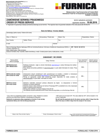 MIĘDZYNARODOWE TARGI POZNAŃSKIE sp. z o. o. POZNAŃ INTERNATIONAL FAIR Ltd. ul. Głogowska 14, 60-734 Poznań, Poland tel. +48/61 869 2437, 61 869 2539, Osoba do kontaktu / Contact person: Jan Krzymiński/ Izabela Kalemba e-mail: [email protected], [email protected] Konto / Bank account: Powszechna Kasa Oszczędności Bank Polski S.A. w Warszawie o/Poznań Nr konta: 38 102040270000110204242962 IBAN: PL 46 102040270000140210929075, SWIFT: BPKOPLPW Podatnik VAT czynny / Active VAT Payer, NIP / Tax ID: 777-00-00-488 Sąd Rejonowy Poznań – Nowe Miasto i Wilda w Poznaniu / Poznan District Court VIII Wydział Gospodarczy Krajowego Rejestru Sądowego / 8th Division of National Court Register KRS / Registered number: 0000202703 Kapitał zakładowy / Share capital: 42 310 200,00 PLN Międzynarodowe Targi Komponentów do Produkcji Mebli International Trade Fair of Components for Furniture Production POZNAŃ 13-16.09.2016 ZAMÓWIENIE SERWISU PRASOWEGO ORDER OF PRESS SERVICE termin nadsyłania zamówień application deadline 10.08.2016 # Organizator nie gwarantuje realizacji zamówienia złożonego po tym terminie. / The organiser does not guarantee realization of the order placed after 08.08.2014. Dane do faktury / Invoice details: Zamawiający (pełna nazwa) / Orderer (full name): Ulica, nr / Street, no.: Kraj / Country: Kod pocztowy / Postal code: Miasto / City: Telefon / Phone: Województwo / District: Fax: E-mail: Internet: Wpis do Krajowego Rejestru Sądowego (KRS) lub Centralnej Ewidencji i Informacji o Działalności Gospodarczej CEIDG) nr Company registration no: Data i miejsce wpisu / Date and place: Osoba do kontaktu (imię i nazwisko, telefon komórkowy, e-mail) / Contact person (name, mobile phone, e-mail): NIP / TAX ID / EU VAT ID: ZAMAWIAMY / WE ORDER: Nazwa pakietu Name of package Usługi / Services Cena netto PLN* Net price PLN* MTP MediaContent MTP MediaContent Publikacja biuletynów i zdjęć na stronie internetowej www.furnica.pl w sekcji Informacje dla mediów / Serwis prasowy. Press release and photos published on www.furnica.pl/en in a part called Information for media / Press Corner 1800,- MTP Kontakt dla mediów MTP Contact for media Umieszczenie danych kontaktowych osób upoważnionych do kontaktu z mediami w drukowanym biuletynie i na stronie internetowej www.furnica.pl w sekcji Informacje dla mediów Placing an appropriate contact data (concerning people responsible for media contacts) on www.furnica.pl/en in a part called Information for media 600.,- MTP Press Center MTP Press Center Wyłożenie materiałów prasowych podczas odbywania się targów na ekspozytorze w Centrum Prasowym na terenie ekspozycji Materiały prasowe należy dostarczyć do Centrum Prasowego MTP w przeddzień lub w dniu rozpoczęcia targów na godzinę przed otwarciem Placing press materials on prospect shelves during the fair The materials should be delivered to MTP Press Centre the day before, or on the first day of the fair 800,- Zakreśl wybrane Mark applicable * Ceny netto nie uwzględniają podatku od towarów i usług. Podatek ten zostanie doliczony przy fakturowaniu zgodnie z obowiązującymi przepisami. * NET prices do not include VAT. The value added tax VAT will be included in the invoice if applicable. Należność za wykonanie usług uregulujemy w terminie 14 dni od daty wystawienia faktury lub 5 dni od dnia jej otrzymania. We will meet the payments due for the above services within 14 days from the date of its issue or within 5 days from the receipt of the invoice. _________________________________________ Miejsce i data / Place and date of signing FURNICA 2016 _________________________________________ Pieczęć Zamawiającego / Orderer’s stamp _________________________________________ Podpis osoby upoważnionej do reprezentowania Zamawiającego Signature of person authorized to Orderer’s representation FORMULARZ / FORM SPW