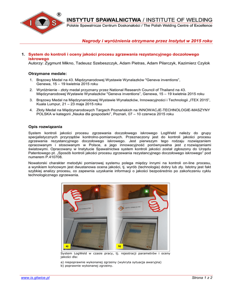 Nagrody i wyróżnienia otrzymane przez Instytut w 2015 roku 1. System do kontroli i oceny jakości procesu zgrzewania rezystancyjnego doczołowego iskrowego Autorzy: Zygmunt Mikno, Tadeusz Szebeszczyk, Adam Pietras, Adam Pilarczyk, Kazimierz Czylok Otrzymane medale: 1. Brązowy Medal na 43. Międzynarodowej Wystawie Wynalazków "Geneva inventions”, Genewa, 15 – 19 kwietnia 2015 roku 2. Wyróżnienie - złoty medal przyznany przez National Research Council of Thailand na 43. Międzynarodowej Wystawie Wynalazków "Geneva inventions”, Genewa, 15 – 19 kwietnia 2015 roku 3. Brązowy Medal na Międzynarodowej Wystawie Wynalazków, Innowacyjności i Technologii „ITEX 2015”, Kuala Lumpur, 21 – 23 maja 2015 roku 4. Złoty Medal na Międzynarodowych Targach Poznańskich na INNOWACJE-TECHNOLOGIE-MASZYNY POLSKA w kategorii „Nauka dla gospodarki”, Poznań, 07 – 10 czerwca 2015 roku Opis rozwiązania System kontroli jakości procesu zgrzewania doczołowego iskrowego LogWeld należy do grupy specjalistycznych przyrządów kontrolno-pomiarowych. Przeznaczony jest do kontroli jakości procesu zgrzewania rezystancyjnego doczołowego iskrowego. Jest pierwszym tego rodzaju rozwiązaniem opracowanym i stosowanym w Polsce, a jego innowacyjność porównywalna jest z rozwiązaniami światowymi. Opracowany w Instytucie Spawalnictwa system kontroli jakości został zgłoszony do Urzędu Patentowego pt. „Sposób kontroli jakości procesu zgrzewania rezystancyjnego doczołowego iskrowego” pod numerem P.410708. Nowatorski charakter metodyki pomiarowej systemu polega między innymi na kontroli on-line procesu, a wynikiem końcowym jest dwustanowa ocena jakości, tj. wyrób (technologia) dobry lub zły. Istotny jest fakt szybkiej analizy procesu, co zapewnia uzyskanie informacji o jakości bezpośrednio po zakończeniu cyklu technologicznego zgrzewania. System LogWeld w czasie pracy, tj. rejestracji parametrów i oceny jakości dla: a) niepoprawnie wykonanej zgrzeiny (wykryta sytuacja awaryjna) b) poprawnie wykonanej zgrzeiny. www.is.gliwice.pl Strona 1 z 2 Nagrody i wyróżnienia otrzymane przez Instytut w 2015 roku System LogWeld rejestruje parametry procesu zgrzewania, w tym: prąd i napięcie zgrzewania, siłę docisku i przemieszczenie elektrod oraz wielkości pochodne, przebieg mocy chwilowej, rezystancję zastępczą statyczną oraz energię dostarczoną do zgrzeiny. System na podstawie wprowadzonych wartości granicznych dla wybranych kontrolowanych parametrów porównuje i dokonuje oceny jakości wykonywanych połączeń zgrzewanych. Umożliwia analizę każdej wykonywanej zgrzeiny, co pozwala na objęcie kontrolą 100 % produkcji. Dzięki skutecznej identyfikacji wadliwych połączeń w trakcie zgrzewania, istnieje możliwość eliminacji wadliwych elementów z cyklu produkcyjnego oraz ograniczenie do minimum konieczności badań niszczących. Efektem tego jest wzrost jakości, trwałości i niezawodności wykonywanych połączeń, obniżenie kosztów produkcji, zapewnienie najwyższych standardów jakościowych i wzrost zaufania klientów. Zalety produktu Zalety systemu LogWeld są następujące: zapewnienie pełnej 100% kontroli wykonywanych połączeń zgrzewanych, uzyskanie informacji o jakości bezpośrednio po zakończeniu procesu zgrzewania, metoda kontroli jakości jest metodą nieniszczącą, informacja o sytuacji awaryjnej pozwala na natychmiastową reakcję, informacja o poprawności procesu daje zapewnienie wysokiej jakości produkcji, pełna archiwizacja danych wymagana przy systemach zarządzania jakością, łatwa obsługa i łatwość przygotowania systemu do pracy, oszczędność materiałów, energii, wzrost jakości i konkurencyjność produkcji w wyniku ograniczenia braków, wczesne wykrywanie awarii, zmniejszenie reklamacji od obiorcy finalnego, zwiększenie wiarygodności procesu i zaufania klienta. www.is.gliwice.pl Strona 2 z 2