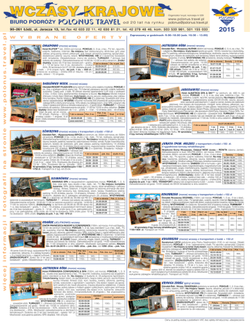 wczasy krajowe BIURO PODRÓŻY POLONUS travel od 20 lat na rynku Organizator turyst. koncesja nr 229 www.polonus.travel.pl [email protected] więcej informacji i fotografii na stronie www.polonus.travel.pl 90–261 Łódź, ul. Jaracza 13, tel./fax 42 633 22 11, 42 630 81 21, tel. 42 279 48 46, kom. 503 533 981, 501 155 033 w y b r a n e o f e r t y 2015 Zapraszamy w godzinach: 9.00–18.00 (sob. 10.00 – 13.00) JASTRZĘBIA GÓRA (morze) wczasy CHŁAPOWO (morze) wczasy Hotel KLIPER** (ok. 200m od morza). POKOJE: 2, 3 os. z łaz., TV, tel., ręczniki, czajnik, lodówka, Internet. Na miejscu: bar restauracyjny, drink-bar, grill, plac zabaw, ping-pong, bilard, piłkarzyki, grill, bezpł. strzeżony parking, sprzęt plaż., dodatkowo płatne: sauna, bilard. WYŻYWIENIE: HB (2 x dziennie) Szwedzki stół: śniadania. Obiadokolacje: menu do wyboru. TURNUSY: 7-dniowe (od soboty do soboty). Zakwaterowanie od 14:00 do 12:00 w dniu ostatnim. Zniżki/ dopłaty: dzieci do 4 lat bez świadczeń – gratis, 7 dni w okresie Os. w pok. 2os 4 – 12 lat (przy min 2 os. dorosłych) – zniżka 612,50,50%. W terminach 04.07-22.08: dopłata do pok. 02.05-04.07 857,50,z balk. – 210 zł/pok./tydz., do pok. 1 os. – 200 zł.; 04.07-22.08 trzecia os. w pokoju – zniżka 200 zł. Sauna – 25 zł./ 22.08-26.09 612,50,godz., bilard – 10 zł/godz. Ośrodek Reh. - Wczasowy HUTNIK (800m od morza). POKOJE: 2, 3, 4,-os. z łaz., TV – odpłatnie. Na miejscu: kryty basen (gratis po godz. 18:00), kawiarnia z dyskoteką, sala TV, parking, odnowa biologiczna, rehabilitacja, stołówka, sauna, Internet w holu recepcyjnym, boisko do siatkówki, kort tenisowy, bilard, tenis stołowy, wypożyczalnia rowerów, 2 windy. WYŻYWIENIE: FB (śniadania, obiady, kolacje). TURNUSY: 7 – dniowe (od soboty do soboty). 7 dni w okresie Dorosły 3-10 lat Zakwaterowanie od godz. 12.00 735,560,(obiad) do 09.00 (śniadanie) w dniu 16.07-15.08 ostatnim. DOPŁATY: do pok. 1 os.: 01.07-15.07 700,525,150 zł/tydz. Dzieci do 3 lat w 16.0718.08-30.08 15.08 140 zł/tydz., w pozostałych 105 zł/tydz. w sprzedaży 2-tyg. turnusy 01.06-30.06 630,490,rehabilitacyjne 1250-1550 zł. 01.09-30.09 DARŁÓWKO WSCH. (morze) wczasy Ośrodek RESORT PLAZA SPA (przy samym morzu, przy wejściu na plażę). POKOJE: 2 os., 2os. z aneksem od str. parku, łaz., TV, Internet, parawany, ręczniki, czajnik, lodówka, suszarka. Część pok. z balk. W ofercie również apartamenty LUX oraz z aneksem 2-4os. i 4-6os. Ceny apartamentów dostępne w biurze. Na miejscu: Morski Instytut Zdrowia i Urody Spa i Wellness, kryty basen, sauna, jacuzzi, restauracja, plac zabaw, kino familijne, Nordic Walking. WYŻYWIENIE: HB (2 x dziennie). Szwedzki stół: śniadania i obiadokolacje. W CENIE: Voucher na kwotę 300 zł/pokój do wykorzystania na zabiegi SPA z oferty promocyjnej, 10% rabatu na zabiegi kosm. oraz SPA, program dla dzieci i opieka animatora w okresie wakacyjnym – 2 godz/dzień. TURNUSY: 7 – dniowe (od soboty do soboty). Zakwaterowanie od godz. 17:00 do 10:00 w dniu ostatnim. Zniżki/ dopłaty: dzieci bez świadczeń: do 1 r.ż. – gratis, 1 – 4 lat – 12 zł/doba, pies – 40 zł/doba. Dopł. do pok. od str. morza – Pok. 2 os. 70 zł/tydz. Parking – 20-25 7 dni w okresie Pok. 2 os. z aneksem Dost. 4-12 lat zł/doba. Leżaki – 1 zł/godz., 6 zł/ 1365,1400,910,630,dzień. Dieta śródziemnomorska – 20.06-29.08 poza sezonem 1120,1155,770,560,40 zł/doba. DŹWIRZYNO (morze) wczasy z transportem z Łodzi +150 zł Ośrodek Reh. - Wypoczynkowy BRYZA (w centrum, ok. 300m od morza, ok. 500m od jeziora). POKOJE: 2 os. i 4 os. studio z łaz., balk., TV, tel., lodówka, sprzęt plaż. Zakwaterowanie w budynku wczasowym (A). Na miejscu: recepcja, 2 baseny, jacuzzi, sauna, brodzik, jadalnia, kawiarnia, sala klubowa i fitness, winda, fryzjer, kosmetyczka, solarium, boisko do siatkówki, grill, plac zabaw, parking niestrzeżony 15 zł/doba (lipiec, sierpień) lub 10 zł/doba (poza sezonem), wypożyczalnia rowerów, łóżeczko turystyczne (20 zł/doba). WYŻYWIENIE: FB (3 x dziennie). Śniadania i kolacje – szwedzki stół. TURNUSY: 7-dniowe (od soboty do soboty). Zakwaterowanie od 15:00 do 7 dni w okresie pok. 2os. studio 4-os. 10:00 w dniu ostatnim. ZNIŻKI: dzieci do 3 lat bez 959,910,świadczeń w (27.06-29.08.) 10 zł/doba, poza 18.04 - 20.06 sezonem gratis. Dzieci do 10 lat jako 2 os w pok. 20.06 - 22.08 1064,1036,2 lub 3 os. - rabat 10%. Dostawka dla dziecka do 22.08 - 26.09 959,931,10 lat - 50%. Dostawka dla os. dorosłej - 30%. 26.09 24.10 791,763,w sprzedaży 2 tyg. turnusy rehabilitacyjne 11801750 zł. Transport co 2 tyg. od 25.04. DZIWNÓWEK (morze) wczasy MAXIMUS SPA w bezpośrednim sąsiedztwie morza. POKOJE: 1, 2, 3, 4os. oraz pok. typu studio z łaz., balk., tel., TV. Na miejscu: kompleks basenów, SPA, grota lodowa, jacuzzi, sauny, dział rehabilitacji i odnowy biolog., fitness, solarium, 2 kąciki zabaw (w sezonie animacje dla dzieci), lokal taneczny, bar, restauracja, zewn. tarasy. Dodatkowo płatne: parking 10-25 zł/doba, sauna– 10 zł/seans, infrared – 5 zł/seans, grota solna – 10 zł/45min, dopłata do 2 zabiegów rehabilitacyjnych 25 zł/doba. WYŻYWIENIE: HB (2 x dziennie od 26.06 do 30.08) lub FB (3 x 7 dni w okresie Pok. 2, 3,4 os. dziennie w pozostałych terminach). TURNUSY: 7 – dniowe (od soboty do soboty). 31.05-26.06 980,Zakwaterowanie od godz. 16:00 do 11:00 (w sezonie wysokim) i od godz. 14:00 do 26.06-04.07 1183,11:00 (w sezonie niskim). Zniżki/dopłaty: w terminie od 26.06 do 30.08 dzieci do 1 r.ż. bez świadczeń – gratis, 1- 3 lat – 10 zł/doba, w pozostałych terminach dzieci 04.07-16.08 1323,do 3 lat bez świadczeń – gratis; 3 - 12 lat - 25 % zniżki (przy 2 os. pełnopłatnych), 16.08-30.08 1183,przy 1 os. pełnopłatnej -20% zniżki, do 12 lat na dostawce -50% zniżki, pow. 12 lat 30.08-27.09 1043,na dostawce - 30% zniżki. Dopłata do pok. 1 os. 140 - 670 zł. GDAŃSK (JELITKOWO) wczasy DWÓR PRAWDZIC