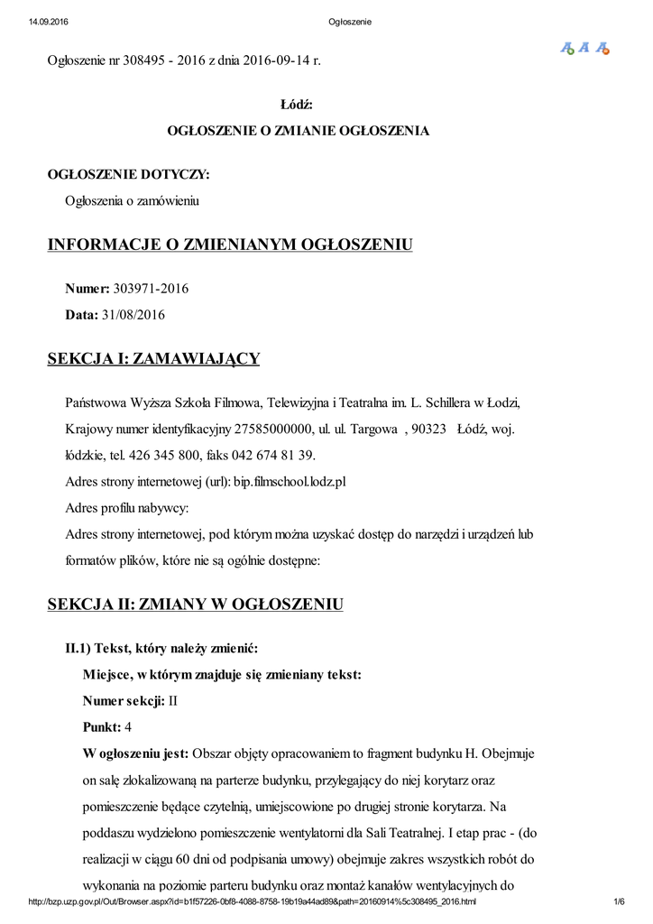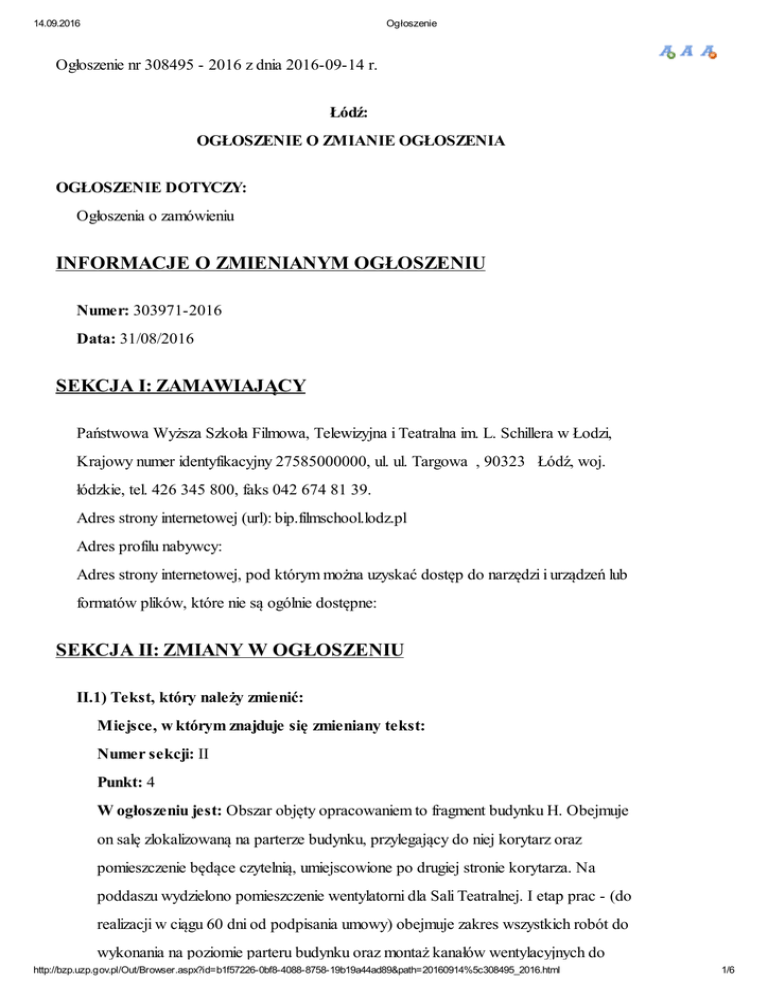 14.09.2016 Ogłoszenie Ogłoszenie nr 308495 - 2016 z dnia 2016-09-14 r. Łódź: OGŁOSZENIE O ZMIANIE OGŁOSZENIA OGŁOSZENIE DOTYCZY: Ogłoszenia o zamówieniu INFORMACJE O ZMIENIANYM OGŁOSZENIU Numer: 303971-2016 Data: 31/08/2016 SEKCJA I: ZAMAWIAJĄCY Państwowa Wyższa Szkoła Filmowa, Telewizyjna i Teatralna im. L. Schillera w Łodzi, Krajowy numer identyfikacyjny 27585000000, ul. ul. Targowa , 90323 Łódź, woj. łódzkie, tel. 426 345 800, faks 042 674 81 39. Adres strony internetowej (url): bip.filmschool.lodz.pl Adres profilu nabywcy: Adres strony internetowej, pod którym można uzyskać dostęp do narzędzi i urządzeń lub formatów plików, które nie są ogólnie dostępne: SEKCJA II: ZMIANY W OGŁOSZENIU II.1) Tekst, który należy zmienić: Miejsce, w którym znajduje się zmieniany tekst: Numer sekcji: II Punkt: 4 W ogłoszeniu jest: Obszar objęty opracowaniem to fragment budynku H. Obejmuje on salę zlokalizowaną na parterze budynku, przylegający do niej korytarz oraz pomieszczenie będące czytelnią, umiejscowione po drugiej stronie korytarza. Na poddaszu wydzielono pomieszczenie wentylatorni dla Sali Teatralnej. I etap prac - (do realizacji w ciągu 60 dni od podpisania umowy) obejmuje zakres wszystkich robót do wykonania na poziomie parteru budynku oraz montaż kanałów wentylacyjnych do http://bzp.uzp.gov.pl/Out/Browser.aspx?id=b1f57226-0bf8-4088-8758-19b19a44ad89&path=20160914%5c308495_2016.html 1/6 14.09.2016 Ogłoszenie wykonania na poziomie parteru budynku oraz montaż kanałów wentylacyjnych do poziomu poddasza. II etap prac - (do 15.12.2016) obejmuje zakres robót na poddaszu, wydzielenie wentylatorni , zakup i montaż centrali wraz z uruchomieniem. Projekt przewiduje powiększenie Sali oraz polepszenie warunków akustycznych. W celu zwiększenia powierzchni, zostanie wyburzona ściana konstrukcyjna oddzielająca salę od zaplecza. W tym miejscu będzie projektowany podciąg stalowy umiejscowiony na stalowych słupach – elementy te zostaną obłożone okładziną z systemowych płyt ogniochronnych cementowo-włóknowych o gr. 42mm. W dalszej części przewidziano przestrzeń służącą jako śluza oddzielająca salę od pomieszczenia sąsiedniego. Śluza powstanie poprzez wykonanie dwóch ścian g-k grubości 15cm wypełnionych wełną mineralną 5 cm, od strony śluzy będzie okładzina z wełny min. 3cm na welonie, obłożona różnej szerokości listewkami pionowymi (zgodnie z rysunkiem) w celu zapewnienia jak najlepszego komfortu akustycznego pomiędzy pomieszczeniami. W sali przewidziano nową podłogę na gruncie, po zdjęciu warstw stropu zostaną wykonane nowe warstwy sufitu mocowane do istniejących belek stropowych. Pod nimi przewidziano sufit akustyczny oraz ruszt technologiczny. Poniżej zostaną zawieszone trzy ustroje akustyczne. Na ścianach wykona się nową okładzinę - ustrój akustyczny – ze sklejki szczelinowej oraz pełnej. Dodatkowo – dla obsługi Sali – zaprojektowano na poddaszu wydzielone pomieszczenie wentylatorni. W ogłoszeniu powinno być: Obszar objęty opracowaniem to fragment budynku H. Obejmuje on salę zlokalizowaną na parterze budynku, przylegający do niej korytarz oraz pomieszczenie będące czytelnią, umiejscowione po drugiej stronie korytarza. Na poddaszu wydzielono pomieszczenie wentylatorni dla Sali Teatralnej. I etap prac - (do realizacji w ciągu 70 dni od podpisania umowy) obejmuje zakres wszystkich robót do wykonania na poziomie parteru budynku oraz montaż kanałów wentylacyjnych do poziomu poddasza. II etap prac - (do 19.12.2016) obejmuje zakres robót na poddaszu, wydzielenie wentylatorni , zakup i montaż centrali wraz z uruchomieniem. Projekt przewiduje powiększenie Sali oraz polepszenie warunków akustycznych. W celu zwiększenia powierzchni, zostanie wyburzona ściana konstrukcyjna oddzielająca salę od zaplecza. W tym miejscu będzie projektowany podciąg stalowy umiejscowiony na stalowych słupach – elementy te zostaną obłożone okładziną z systemowych płyt ogniochronnych cementowo-włóknowych o gr. 42mm. W dalszej części przewidziano przestrzeń służącą jako śluza oddzielająca salę od pomieszczenia sąsiedniego. Śluza powstanie poprzez wykonanie dwóch ścian g-k grubości 15cm wypełnionych wełną http://bzp.uzp.gov.pl/Out/Browser.aspx?id=b1f57226-0bf8-4088-8758-19b19a44ad89&path=20160914%5c308495_2016.html 2/6 14.09.2016 Ogłoszenie powstanie poprzez wykonanie dwóch ścian g-k grubości 15cm wypełnionych wełną mineralną 5 cm, od strony śluzy będzie okładzina z wełny min. 3cm na welonie, obłożona różnej szerokości listewkami pionowymi (zgodnie z rysunkiem) w celu zapewnienia jak najlepszego komfortu akustycznego pomiędzy pomieszczeniami. W sali przewidziano nową podłogę na gruncie, po zdjęciu warstw stropu zostaną wykonane nowe warstwy sufitu mocowane do istniejących belek stropowych. Pod nimi przewidziano sufit akustyczny oraz ruszt technologiczny. Poniżej zostaną zawieszone trzy ustroje akustyczne. Na ścianach wykona się nową okładzinę - ustrój akustyczny – ze sklejki szczelinowej oraz pełnej. Dodatkowo – dla obsługi Sali – zaprojektowano na poddaszu wydzielone pomieszczenie wentylatorni. Miejsce, w którym znajduje się zmieniany tekst: Numer sekcji: II Punkt: 8 W ogłoszeniu jest: data zakończenia: 15/12/2016 W ogłoszeniu powinno być: data zakończenia: 19/12/2016 Miejsce, w którym znajduje się zmieniany tekst: Numer sekcji: IV Punkt: 6.2 W ogłoszeniu jest: Data: 15/09/2016, godzina: 09:30 W ogłoszeniu powinno być: Data: 19/09/2016, godzina: 09:30 http://bzp.uzp.gov.pl/Out/Browser.aspx?id=b1f57226-0bf8-4088-8758-19b19a44ad89&path=20160914%5c308495_2016.html 3/6 14.09.2016 Ogłoszenie http://bzp.uzp.gov.pl/Out/Browser.aspx?id=b1f57226-0bf8-4088-8758-19b19a44ad89&path=20160914%5c308495_2016.html 4/6 14.09.2016 Ogłoszenie http://bzp.uzp.gov.pl/Out/Browser.aspx?id=b1f57226-0bf8-4088-8758-19b19a44ad89&path=20160914%