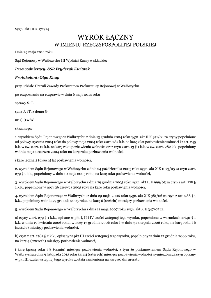 Sygn. akt III K 172/14 WYROK ŁĄCZNY W IMIENIU RZECZYPOSPOLITEJ POLSKIEJ Dnia 29 maja 2014 roku Sąd Rejonowy w Wałbrzychu III Wydział Karny w składzie: Przewodniczący: SSR Fryderyk Kwiatek Protokolant: Olga Knap przy udziale Urszuli Zawady Prokuratora Prokuratury Rejonowej w Wałbrzychu po rozpoznaniu na rozprawie w dniu 6 maja 2014 roku sprawy S. T. syna J. i T. z domu G. ur. (...) w W. skazanego: 1. wyrokiem Sądu Rejonowego w Wałbrzychu z dnia 13 grudnia 2004 roku sygn. akt II K 971/04 za czyny popełnione od połowy stycznia 2004 roku do połowy maja 2004 roku z art. 282 k.k. na karę 2 lat pozbawienia wolności i z art. 245 k.k. w zw. z art. 12 k.k. na karę roku pozbawienia wolności oraz czyn z art. 13 § 1 k.k. w zw. z art. 282 k.k. popełniony w dniu maja 1 czerwca 2004 roku na karę roku pozbawienia wolności, i karę łączną 2 (dwóch) lat pozbawienia wolności, 2. wyrokiem Sądu Rejonowego w Wałbrzychu z dnia 24 października 2005 roku sygn. akt X K 1073/05 za czyn z art. 279 § 1 k.k., popełniony w dniu 10 maja 2005 roku, na karę roku pozbawienia wolności, 3. wyrokiem Sądu Rejonowego w Wałbrzychu z dnia 29 grudnia 2005 roku sygn. akt II K 999/05 za czyn z art. 278 § 1 k.k., popełniony w nocy 26 czerwca 2005 roku na karę roku pozbawienia wolności, 4. wyrokiem Sądu Rejonowego w Wałbrzychu z dnia 29 maja 2006 roku sygn. akt X K 381/06 za czyn z art. 288 § 1 k.k., popełniony w dniu 29 grudnia 2005 roku, na karę 6 (sześciu) miesięcy pozbawienia wolności, 5. wyrokiem Sądu Rejonowego w Wałbrzychu z dnia 11 maja 2007 roku sygn. akt X K 347/07 za: a) czyny z art. 279 § 1 k.k., opisane w pkt I, II i IV części wstępnej tego wyroku, popełnione w warunkach art.91 § 1 k.k. w dniu 19 kwietnia 2006 roku, w nocy 17 grudnia 2006 roku i w dniu 31 sierpnia 2006 roku, na karę roku i 6 (sześciu) miesięcy pozbawienia wolności, b) czyn z art. 178a § 2 k.k., opisany w pkt III części wstępnej tego wyroku, popełniony w dniu 17 grudnia 2006 roku, na karę 4 (czterech) miesięcy pozbawienia wolności, i karę łączną roku i 8 (ośmiu) miesięcy pozbawienia wolności, z tym że postanowieniem Sądu Rejonowego w Wałbrzychu z dnia 9 listopada 2013 roku kara 4 (czterech) miesięcy pozbawienia wolności wymierzona za czyn opisany w pkt III części wstępnej tego wyroku została zamieniona na karę 30 dni aresztu, 6. wyrokiem Sądu Rejonowego w Wałbrzychu z dnia 19 czerwca 2007 roku sygn. akt II K 592/07 za czyn z art. 278 § 1 k.k., popełniony w dniu 28 lipca 2006 roku, na karę 6 (sześciu) miesięcy pozbawienia wolności, z tym że postanowieniem Sądu Rejonowego w Wałbrzychu z dnia 9 listopada 2013 roku kara 6 (sześciu) miesięcy pozbawienia wolności wymierzona wymienionym wyrokiem została zamieniona na karę 30 dni aresztu 7. wyrokiem Sądu Rejonowego w Wałbrzychu z dnia 28 czerwca 2007 roku sygn. akt II K 484/07 za czyn z art. 278 § 1 k.k., popełniony w dniu 23 lutego 2007 roku, na karę 10 (dziesięciu) miesięcy pozbawienia wolności, z tym że postanowieniem Sądu Rejonowego w Wałbrzychu z dnia 9 listopada 2013 roku kara 10 (dziesięciu) miesięcy pozbawienia wolności wymierzona wymienionym wyrokiem została zamieniona na karę 30 dni aresztu 8. wyrokiem łącznym Sądu Rejonowego w Wałbrzychu z dnia 28 maja 2008 roku sygn. akt II K 1200/07, obejmującym: a) wyrok Sądu Rejonowego w Wałbrzychu z dnia 24 października 2005 roku sygn. akt X K 1073/05, b) wyrok Sądu Rejonowego w Wałbrzychu z dnia 29 grudnia 2005 roku sygn. akt II K 999/05, na karę łączną roku i 2 (dwóch) miesięcy pozbawienia wolności, oraz obejmującym: c) wyrok Sądu Rejonowego w Wałbrzychu z dnia 11 maja 2007 roku sygn. akt X K 347/07, d) wyrok Sądu Rejonowego w Wałbrzychu z dnia 19 czerwca 2007 roku sygn. akt II K 592/07, e) wyrok Sądu Rejonowego w Wałbrzychu z dnia 28 czerwca 2007 roku sygn. akt II K 484/07, na karę łączną 2 (dwóch) lat i 2 (dwóch) miesięcy pozbawienia wolności, 9. wyrokiem Sądu Rejonowego w Wałbrzychu z dnia 14 marca 2012 roku sygn. akt III K 1124/11 za czyn z art. 280 § 1 k.k. w zw. z art. 64 § 1 k.k., popełniony w dniu 19 października 2011 roku, na karę 3 (trzech) lat pozbawienia wolności, I. na podstawie art. 85 k.k. i art. 86 § 1 k.k. łączy skazanemu S. T. kary pozbawienia wolności wymierzone wyrokami opisanymi w pkt 2 i 3 części wstępnej niniejszego wyroku łącznego i wymierza mu karę łączną roku i 2 (dwóch) miesięcy pozbawienia wolności; II. na podstawie art. 572 k.p.k. postępowanie o wydanie wyroku łącznego obejmującego skazanie opisane w pkt 1, pkt 4 i pkt 5, 6 i 7, 8 i 9 części wstępnej niniejszego wyroku łącznego umarza, zaliczając wydatki poniesione w tym zakresie na rachunek Skarbu Państwa; III. na podstawie art. 577 k.p.k. w zw. z art. 63 § 1 k.k. okresy odbywania kar orzeczonych na podstawie wyroków wymienionych w pkt 2 i pkt 3 części wstępnej niniejszego wyroku łącznego zalicza na poczet kary łącznej wymierzonej w pkt I części dyspozytywnej niniejszego wyroku łącznego, IV. w pozostałej części orzeczenia zawarte w wyrokach objętych niniejszym wyrokiem łącznym pozostawia do odrębnego wykonania; V. zasądza od Skarbu Państwa na rzecz adw. A. G. z Kancelarii Adwokackiej w W. kwotę 177,12 zł (sto siedemdziesiąt siedem złotych dwanaście groszy) tytułem kosztów nieopłaconej pomocy prawnej udzielonej skazanemu z urzędu w postępowaniu przed Sądem; VI. zwalnia skazanego od poniesienia kosztów sądowych zaliczając wydatki Skarbu Państwa powstałe od chwili wszczęcia postępowania na rachunek tegoż Skarbu Państwa. Sygn. akt III K 172/14 UZASADNIENIE Wyrokiem z dnia 13 grudnia 2004 roku sygn. akt II K 971/04 Sąd Rejonowy w Wałbrzychu skazał S. T. za czyny popełnione od połowy stycznia 2004 roku do połowy maja 2004 roku z art. 282 k.k. na karę 2 lat pozbawienia wolności i z art. 245 k.k. w zw. z art. 12 k.k. na karę roku pozbawienia wolności oraz za cz