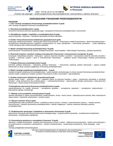 UDA - PO KL.02.01.01-00-466/09 „Finanse się opłacają! – studia podyplomowe dla przedsiębiorców i pracowników z zakresu finansów” ZARZĄDZANIE FINANSAMI PRZEDSIĘBIORSTW PROGRAM 1. Cele i funkcje zarządzania finansowego przedsiębiorstwem 4 godz. cele i funkcje zarządzania finansami przedsiębiorstw 2. Otoczenie przedsiębiorstwa 4 godz. otoczenie finansowe podmiotu gospodarczego • powiązania finansowe przedsiębiorstwa z otoczeniem 3. Identyfikacja majątku i kapitałów w przedsiębiorstwie 8 godz. wycena aktywów i pasywów • standardy optymalnej struktury kapitałów 4. Źródła i formy finansowania działalności gospodarczej 8 godz. tradycyjne źródła finansowania • leasing jako forma finansowania • nowoczesne źródła finansowania • obrót wierzytelnościami • pozyskiwanie krótkoterminowych papierów wartościowych na rynku pienięŜnym • instrumenty pochodne • rynek kapitałowy i rynek pienięŜny jako źródła pozyskiwania kapitałów 5. Wybór strategii finansowej przedsiębiorstwa 16 godz. uwarunkowania i konsekwencje wyboru strategii finansowej • koszt kapitału • efekt dźwigni finansowej • polityka dywidendy 6. Rachunek kosztów i wyników według rachunkowości finansowej i rachunkowości zarządczej 16 godz. koncepcje i klasyfikacja kosztów • tradycyjne systemy rachunku kosztów i wyników • nowoczesne systemy rachunku kosztów i wyników • rachunek zysków i strat w rachunkowości finansowej • ustalanie wyniku finansowego metodą porównawczą i kalkulacyjną 7. Polityka bilansowa przedsiębiorstwa 8 godz. formalna polityka bilansowa • materialna polityka bilansowa • instrumenty realizacji polityki bilansowej • wpływy polityki bilansowej na obraz sytuacji majątkowej i finansowej przedsiębiorstwa 8. Wybór strategii podatkowej przedsiębiorstwa 8 godz. rodzaje obciąŜeń podatkowych przedsiębiorstwa • wpływ podatku dochodowego na obraz sytuacji finansowej przedsiębiorstwa • róŜnice trwałe i przejściowe między wynikiem finansowym brutto a dochodem • ulgi podatkowe 9. Analiza rentowności działalności gospodarczej 8 godz. analiza relacji: koszt – wolumen – zysk • ustalanie marŜy na pokrycie kosztów i zysku • rentowność sprzedaŜy a struktura kosztów • progi rentowności dla produkcji jedno – i wieloasortymentowej • wykorzystanie dźwigni operacyjnej • próg płynności finansowej • model analizy finansowej Du Ponta 10.Zarządzanie płynnością finansową przedsiębiorstwa 8 godz. zapotrzebowanie na kapitał obrotowy • zarządzanie gotówką • zarządzanie zapasami • zarządzanie naleŜnościami planowanie kapitału obrotowego • 11. Metody oceny projektów inwestycyjnych 8 godz. wartość pieniądza w czasie (oprocentowanie, dyskontowanie, renta) • okres zwrotu • zaktualizowana wartość netto •wewnętrzna stopa zwrotu • wskaźniki zyskowności • analiza ryzyka 12. Wycena wartości firmy 8 godz. przedsiębiorstwo jako przedmiot wyceny • podstawy prawne wyceny • funkcje i uwarunkowania wyceny • metody wyceny nieruchomości • wartość dochodowa przedsiębiorstwa • metody majątkowe • metody mieszane kalkulacji wartości przedsiębiorstwa 13 BudŜetowanie operacyjne i kapitałowe w planowaniu finansowym 8 godz. planowanie finansowe jako element planowania strategicznego • prognozowanie sprzedaŜy • budŜetowanie działalności operacyjnej • budŜetowanie kapitałowe 14. Komunikacja społeczna w zarządzaniu finansami 16 godz. elementy i rodzaje komunikacji · poziomy komunikowania w pracy z ludźmi · zakłócenia komunikacyjne · bariery komunikacyjne i ich pokonywanie w kontakcie z podwładnymi · dystans interpersonalny · manipulacja przestrzenią · body language · case studies Trening umiejętności komunikacyjnych. PROJEKT WSPÓŁFINANSOWANY ZE ŚRODKOW UNII EUROPEJSKIEJ W RAMACH EUROPEJSKIEGO FUNDUSZU SPOŁECZNEGO UDA - PO KL.02.01.01-00-466/09 „Finanse się opłacają! – studia podyplomowe dla przedsiębiorców i pracowników z zakresu finansów” 15. Negocjacje w biznesie 4 godz. 16.Zarządzanie strategiczne 24 godz. Misja – wizja - cele strategiczne · metody wypracowania strategii · poziomy strategii · transformacja celów strategicznych w cele taktyczno-operacyjne 17. Zarządzanie biznesem 8 godz. 18.Gra biznesowa Promar 16 godz. 19. Test – 4 godz. 184 godziny PROJEKT WSPÓŁFINANSOWANY ZE ŚRODKOW UNII EUROPEJSKIEJ W RAMACH EUROPEJSKIEGO FUNDUSZU SPOŁECZNEGO