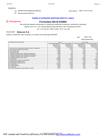 BETACOM SA-Q 2/2004 w tys. zł POCZTA Od : EM BETACOM Małgorzata Balińska Data odbioru : 2004-11-05 18:14:46 Do : EM Kancelaria Publiczna KOMISJA PAPIERÓW WARTOŚCIOWYCH I GIEŁD X Skorygowany Formularz SA-Q 2/2004 (dla emitentów papierów wartościowych o działalności wytwórczej, budowlanej, handlowej lub usługowej) Zgodnie z § 57 ust. 1 pkt 1 Rozporządzenia Rady Ministrów z dnia 16 października 2001 r. - Dz. U. Nr 139, poz. 1569 i z 2002 r. Nr 31, poz. 280 Zarząd Spółki Betacom S.A. podaje do wiadomości raport kwartalny za II kwartał roku obrotowego 2004/2005 dnia 2004-11-05 (data przekazania) WYBRANE DANE FINANSOWE I. Przychody netto ze sprzedaży produktów, towarów i materiałów II. Zysk (strata) z działalności operacyjnej III. Zysk (strata) brutto IV. Zysk (strata) netto V. Przepływy pieniężne netto z działalności operacyjnej VI. Przepływy pieniężne netto z działalności inwestycyjnej VII. Przepływy pieniężne netto z działalności finansowej VIII. Przepływy pieniężne netto, razem IX. Aktywa razem X. Zobowiązania i rezerwy na zobowiązania XI. Zobowiązania długoterminowe XII. Zobowiązania krótkoterminowe XIII. Kapitał własny XIV. Kapitał zakładowy XV. Liczba akcji XVIII. Wartość księgowa na jedną akcję (w zł / EUR) w tys. zł 2 kwartały narastająco / 2 kwartały narastająco / 2004 okres od 2003 okres od 2004-04-01 do 2003-04-01 do 2004-09-30 2003-09-30 28 670 19 573 -1 803 -204 -1 920 21 -1 920 16 -7 058 -704 -420 -331 -221 975 -7 699 -60 30 842 15 859 14 256 11 373 113 447 13 627 10 647 16 586 4 486 2 020 1 400 2 020 1 400 8,21 3,20 Komisja Papierów Wartościowych i Giełd w tys. EUR 2 kwartały narastająco / 2 kwartały narastająco / 2004 okres od 2003 okres od 2004-04-01 do 2003-04-01 do 2004-09-30 2003-09-30 6 541 4 215 -411 -44 -438 4 -438 3 -1 610 -152 -96 -71 -50 210 -1 756 -13 7 036 3 415 3 252 2 449 26 96 3 109 2 293 3 784 966 461 301 461 301 1,87 0,69 PDF created with FinePrint pdfFactory Pro trial version http://www.pdffactory.com 1 BETACOM SA-Q 2/2004 w tys. zł INFORMACJE O KOREKCIE RAPORTU Skorygowany raportem bieżącym nr 61/2004 z dnia 2004-11-05 o treści : Przyczyną korekty jest błąd techniczny w tabeli "Wybrane dane finasowe". W pozycji II, III, IV zamiast danych narastająco za dwa kwartały roku obrotowego 2004/2005 podano wartości tylko za ostatni kwartał. BILANS Aktywa I. Aktywa trwałe 1. Wartości niematerialne i prawne, w tym: 2. Rzeczowe aktywa trwałe 4. Inwestycje długoterminowe 4.3. Długoterminowe aktywa finansowe a) w jednostkach powiązanych, w tym: - udziały lub akcje w jednostkach podporządkowanych wyceniane metodą praw własności b) w pozostałych jednostkach 4.4. Inne inwestycje długoterminowe 5. Długoterminowe rozliczenia międzyokresowe 5.1. Aktywa z tytułu odroczonego podatku dochodowego II. Aktywa obrotowe 1. Zapasy 2. Należności krótkoterminowe 2.2. Od pozostałych jednostek 3. Inwestycje krótkoterminowe 3.1. Krótkoterminowe aktywa finansowe a) w jednostkach powiązanych b) w pozostałych jednostkach c) środki pieniężne i inne aktywa pieniężne 4. Krótkoterminowe rozliczenia międzyokresowe Aktywa razem Pasywa I. Kapitał własny 1. Kapitał zakładowy 4. Kapitał zapasowy 7. Zysk (strata) z lat ubiegłych 8. Zysk (strata) netto II. Zobowiązania i rezerwy na zobowiązania 1. Rezerwy na zobowiązania 1.1. Rezerwa z tytułu odroczonego podatku dochodowego 1.2. Rezerwa na świadczenia emerytalne i podobne b) krótkoterminowa 1.3. Pozostałe rezerwy b) krótkoterminowe 2. Zobowiązania długoterminowe 2.2. Wobec pozostałych jednostek 3. Zobowiązania krótkoterminowe 3.2. Wobec pozostałych jednostek 3.3. Fundusze specjalne 4. Rozliczenia międzyokresowe 4.2. Inne rozliczenia międzyokresowe a) długoterminowe b) krótkoterminowe Pasywa razem Wartość księgowa Liczba akcji Wartość księgowa na jedną akcję (w zł) stan na 2004-09-30 koniec kwartału / 2004 stan na 2004-06-30 koniec poprz. kwartału / 2004 stan na 2003-09-30 koniec kwartału / 2003 stan na 2003-06-30 koniec poprz. kwartału / 2003 2 965 642 1 480 577 398 45 45 3 006 709 1 481 550 372 25 25 3 588 936 1 506 816 816 3 580 961 1 473 816 816 353 179 266 266 27 877 6 322 20 083 20 083 832 832 347 178 266 266 30 751 7 092 18 073 18 073 4 540 4 540 816 816 338 494 640 30 842 512 4 028 1 046 33 757 330 330 12 271 2 228 9 469 9 469 346 346 1 285 60 228 15 859 330 330 9 683 1 764 7 149 7 149 556 556 1 410 145 214 13 263 16 586 2 020 16 993 -507 -1 920 14 256 158 36 50 50 72 72 113 113 13 627 13 517 110 358 358 17 107 2 020 15 409 1 077 -1 399 16 650 790 36 50 50 704 704 113 113 15 607 15 491 116 140 140 4 486 1 400 3 577 -507 16 11 373 227 73 43 43 111 111 447 447 10 647 10 583 64 52 52 52 4 204 1 400 1 725 1 345 -266 9 059 239 76 43 43 120 120 447 447 8 321 8 257 64 52 52 52 358 30 842 140 33 757 15 859 13 263 16 586 2 020 8,21 17 107 2 020 8,47 4 486 1 400 3,20 4 204 1 400 3,00 stan na 2004-09-30 koniec kwartału / 2004 stan na 2004-06-30 koniec poprz. kwartału / 2004 2 007 2 007 2 007 stan na 2003-09-30 koniec kwartału / 2003 stan na 2003-06-30 koniec poprz. kwartału / 2003 831 831 831 POZYCJE POZABILANSOWE 2. Zobowiązania warunkowe - udzielonych gwarancji i poręczeń Pozycje pozabilansowe, razem 1 562 1 562 1 562 1 097 1 097 1 097 RACHUNEK ZYSKÓW I STRAT Komisja Papierów Wartościowych i Giełd PDF created with FinePrint pdfFactory Pro trial version http://www.pdffactory.com 2 BETACOM SA-Q 2/2004 w tys. zł 2 kwartał / 2004 okres od 2004-07-01 do 2004-09-30 I. Przychody netto ze sprzedaży produktów, towarów i materiałów, w tym: 1. Przychody netto ze sprzedaży produktów 2. Przychody netto ze sprzedaży towarów i materiałów II. Koszty sprzedanych produktów, towarów i materia łów, w tym: 1. Koszt wytworzenia sprzedanych produktów 2. Wartość sprzedanych towarów i materiałów III. Zysk (strata) brutto ze sprzeda ży (I-II) IV. Koszty sprzedaży V. Koszty ogólnego zarządu VI. 