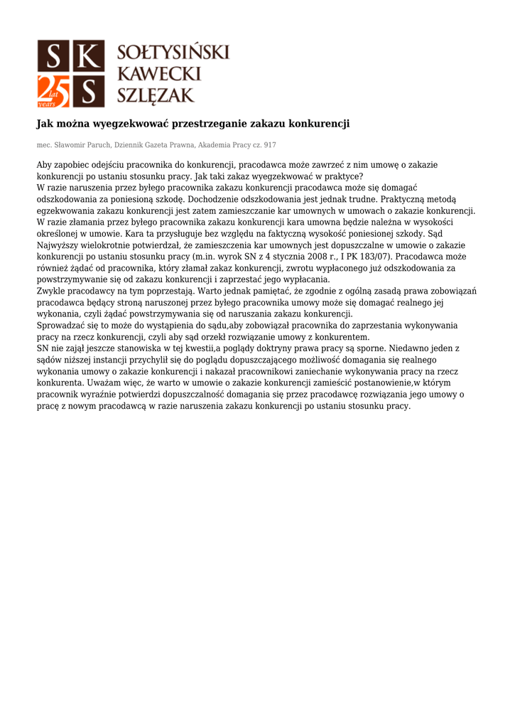 Jak można wyegzekwować przestrzeganie zakazu konkurencji mec. Sławomir Paruch, Dziennik Gazeta Prawna, Akademia Pracy cz. 917 Aby zapobiec odejściu pracownika do konkurencji, pracodawca może zawrzeć z nim umowę o zakazie konkurencji po ustaniu stosunku pracy. Jak taki zakaz wyegzekwować w praktyce? W razie naruszenia przez byłego pracownika zakazu konkurencji pracodawca może się domagać odszkodowania za poniesioną szkodę. Dochodzenie odszkodowania jest jednak trudne. Praktyczną metodą egzekwowania zakazu konkurencji jest zatem zamieszczanie kar umownych w umowach o zakazie konkurencji. W razie złamania przez byłego pracownika zakazu konkurencji kara umowna będzie należna w wysokości określonej w umowie. Kara ta przysługuje bez względu na faktyczną wysokość poniesionej szkody. Sąd Najwyższy wielokrotnie potwierdzał, że zamieszczenia kar umownych jest dopuszczalne w umowie o zakazie konkurencji po ustaniu stosunku pracy (m.in. wyrok SN z 4 stycznia 2008 r., I PK 183/07). Pracodawca może również żądać od pracownika, który złamał zakaz konkurencji, zwrotu wypłaconego już odszkodowania za powstrzymywanie się od zakazu konkurencji i zaprzestać jego wypłacania. Zwykle pracodawcy na tym poprzestają. Warto jednak pamiętać, że zgodnie z ogólną zasadą prawa zobowiązań pracodawca będący stroną naruszonej przez byłego pracownika umowy może się domagać realnego jej wykonania, czyli żądać powstrzymywania się od naruszania zakazu konkurencji. Sprowadzać się to może do wystąpienia do sądu,aby zobowiązał pracownika do zaprzestania wykonywania pracy na rzecz konkurencji, czyli aby sąd orzekł rozwiązanie umowy z konkurentem. SN nie zajął jeszcze stanowiska w tej kwestii,a poglądy doktryny prawa pracy są sporne. Niedawno jeden z sądów niższej instancji przychylił się do poglądu dopuszczającego możliwość domagania się realnego wykonania umowy o zakazie konkurencji i nakazał pracownikowi zaniechanie wykonywania pracy na rzecz konkurenta. Uważam więc, że warto w umowie o zakazie konkurencji zamieścić postanowienie,w którym pracownik wyraźnie potwierdzi dopuszczalność domagania się przez pracodawcę rozwiązania jego umowy o pracę z nowym pracodawcą w razie naruszenia zakazu konkurencji po ustaniu stosunku pracy.
