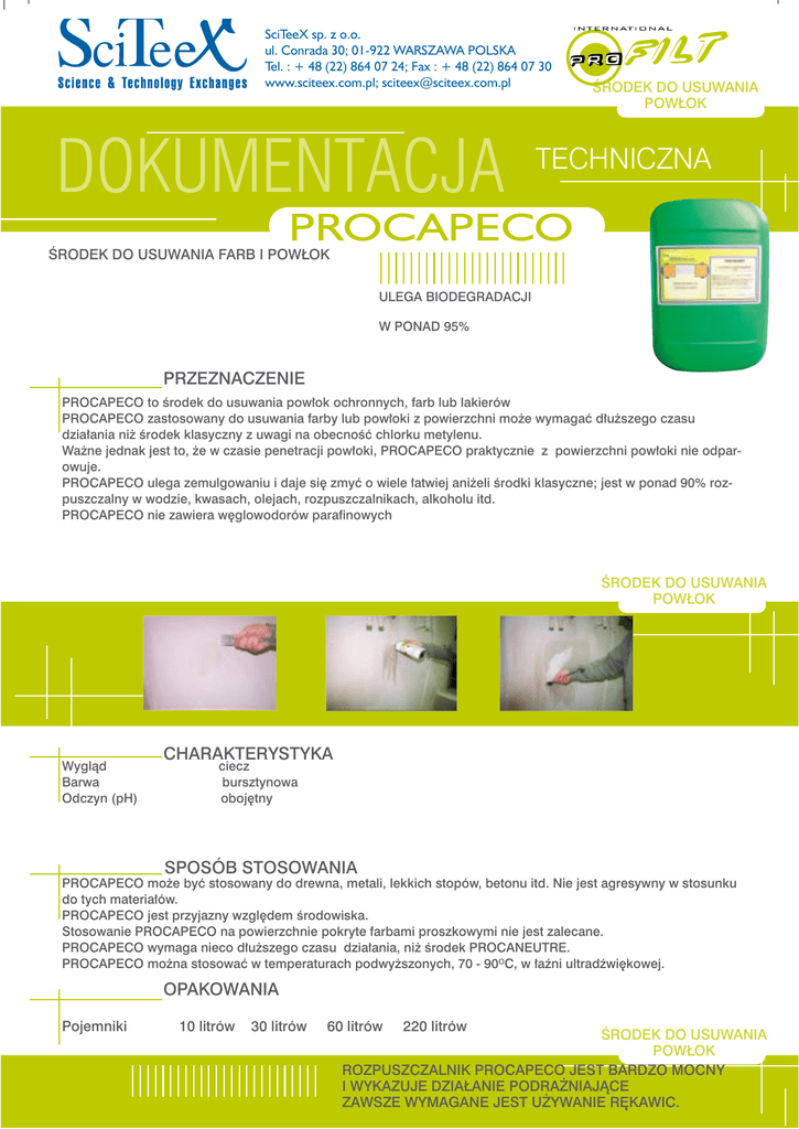 SciTeeX sp. z o.o. ul. Conrada 30; 01-922 WARSZAWA POLSKA Tel. : + 48 (22) 864 07 24; Fax : + 48 (22) 864 07 30 www.sciteex.com.pl; [email protected] ������������ ŚRODEK DO USUWANIA POWŁOK ���������� ŚRODEK DO USUWANIA FARB I POWŁOK ULEGA BIODEGRADACJI W PONAD 95% PRZEZNACZENIE PROCAPECO to środek do usuwania powłok ochronnych, farb lub lakierów PROCAPECO zastosowany do usuwania farby lub powłoki z powierzchni może wymagać dłuższego czasu działania niż środek klasyczny z uwagi na obecność chlorku metylenu. Ważne jednak jest to, że w czasie penetracji powłoki, PROCAPECO praktycznie z powierzchni powłoki nie odparowuje. PROCAPECO ulega zemulgowaniu i daje się zmyć o wiele łatwiej aniżeli środki klasyczne; jest w ponad 90% rozpuszczalny w wodzie, kwasach, olejach, rozpuszczalnikach, alkoholu itd. PROCAPECO nie zawiera węglowodorów parafinowych ŚRODEK DO USUWANIA POWŁOK Wygląd Barwa Odczyn (pH) CHARAKTERYSTYKA ciecz bursztynowa obojętny SPOSÓB STOSOWANIA PROCAPECO może być stosowany do drewna, metali, lekkich stopów, betonu itd. Nie jest agresywny w stosunku do tych materiałów. PROCAPECO jest przyjazny względem środowiska. Stosowanie PROCAPECO na powierzchnie pokryte farbami proszkowymi nie jest zalecane. PROCAPECO wymaga nieco dłuższego czasu działania, niż środek PROCANEUTRE. PROCAPECO można stosować w temperaturach podwyższonych, 70 - 90OC, w łaźni ultradźwiękowej. OPAKOWANIA Pojemniki 10 litrów 30 litrów 60 litrów 220 litrów ŚRODEK DO USUWANIA POWŁOK ROZPUSZCZALNIK PROCAPECO JEST BARDZO MOCNY I WYKAZUJE DZIAŁANIE PODRAŻNIAJĄCE ZAWSZE WYMAGANE JEST UŻYWANIE RĘKAWIC.