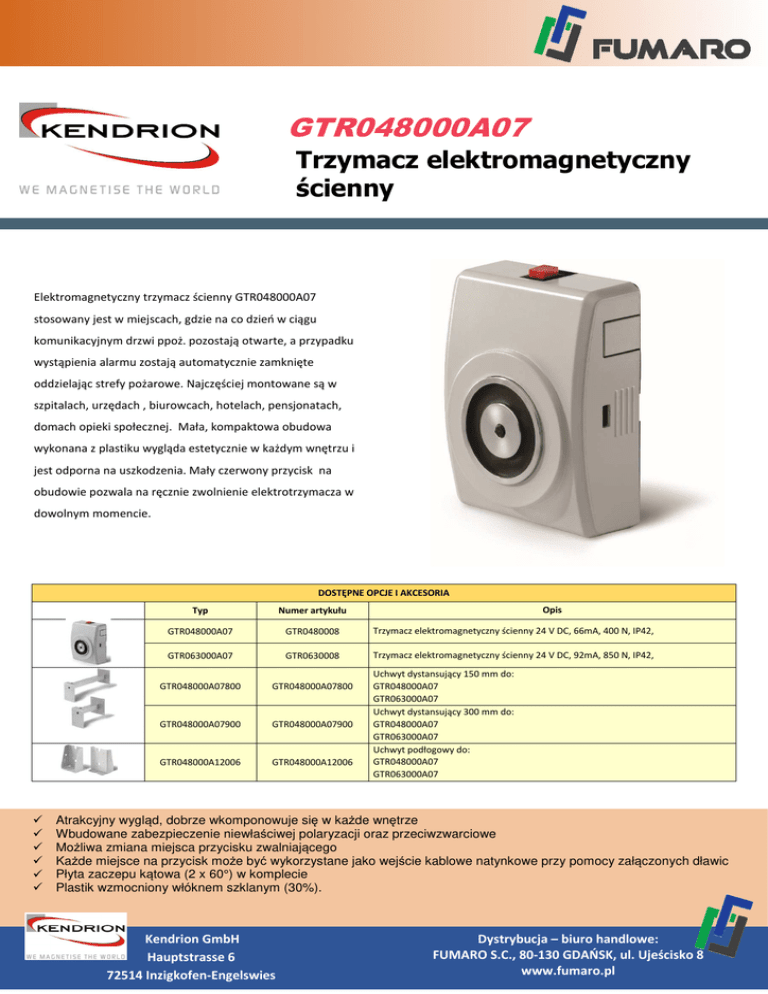 GTR048000A07 Trzymacz elektromagnetyczny ścienny Elektromagnetyczny trzymacz ścienny GTR048000A07 stosowany jest w miejscach, gdzie na co dzień w ciągu komunikacyjnym drzwi ppoż. pozostają otwarte, a przypadku wystąpienia alarmu zostają automatycznie zamknięte oddzielając strefy pożarowe. Najczęściej montowane są w szpitalach, urzędach , biurowcach, hotelach, pensjonatach, domach opieki społecznej. Mała, kompaktowa obudowa wykonana z plastiku wygląda estetycznie w każdym wnętrzu i jest odporna na uszkodzenia. Mały czerwony przycisk na obudowie pozwala na ręcznie zwolnienie elektrotrzymacza w dowolnym momencie. DOSTĘPNE OPCJE I AKCESORIA Opis Typ Numer artykułu GTR048000A07 GTR0480008 Trzymacz elektromagnetyczny ścienny 24 V DC, 66mA, 400 N, IP42, GTR063000A07 GTR0630008 Trzymacz elektromagnetyczny ścienny 24 V DC, 92mA, 850 N, IP42, GTR048000A07800 GTR048000A07800 GTR048000A07900 GTR048000A07900 GTR048000A12006 GTR048000A12006 Uchwyt dystansujący 150 mm do: GTR048000A07 GTR063000A07 Uchwyt dystansujący 300 mm do: GTR048000A07 GTR063000A07 Uchwyt podłogowy do: GTR048000A07 GTR063000A07 Atrakcyjny wygląd, dobrze wkomponowuje się w każde wnętrze Wbudowane zabezpieczenie niewłaściwej polaryzacji oraz przeciwzwarciowe Możliwa zmiana miejsca przycisku zwalniającego Każde miejsce na przycisk może być wykorzystane jako wejście kablowe natynkowe przy pomocy załączonych dławic Płyta zaczepu kątowa (2 x 60°) w komplecie Plastik wzmocniony włóknem szklanym (30%). Kendrion GmbH Hauptstrasse 6 72514 Inzigkofen-Engelswies Dystrybucja – biuro handlowe: FUMARO S.C., 80-130 GDAŃSK, ul. Ujeścisko 8 www.fumaro.pl GTR048000A07 Trzymacz elektromagnetyczny ścienny SCHEMAT PODŁĄCZENIA DANE TECHNICZNE WYMIARY Kendrion GmbH Hauptstrasse 6 72514 Inzigkofen-Engelswies Dystrybucja – biuro handlowe: FUMARO S.C., 80-130 GDAŃSK, ul. Ujeścisko 8 www.fumaro.pl