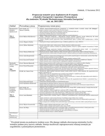 Gdańsk, 13 kwietnia 2012 Propozycje tematów prac dyplomowych II stopnia z Katedry Energetyki i Aparatury Przemysłowej dla studentów Wydziału Mechanicznego, kierunku Energetyka* rok. ak. 2011/2012 Zakład Prowadzący pracę Proponowany temat pracy Ekoinżynierii i Silników Spalinowych prof. dr hab. inż. Janusz Cieśliński Min. 6 tematów dr inż. Bartosz Dawidowicz 1. Badania eksperymentalne/numeryczne przepływów w warunkach bardzo wysokich ciśnień (TU Erlangen wymagana znajomość języka angielskiego lub niemieckiego) 2. Wpływ podziałki na przejmowanie ciepła przy wrzeniu na poziomym pęku rur 3. Wrzenie nanocieczy woda Al2O3 na poziomym pęku rur 4. Konwekcja swobodna nanocieczy na poziomej rurce 5. Badania eksperymentalne histerezy wymiany ciepła przy wrzeniu nanocieczy 1. Dobór i obliczenia techniczno – ekonomiczne systemu zespołów generacji energii elektrycznej dla domu jednorodzinnego oparty na ogniwach fotowoltaicznych współpracujących z turbiną wiatrową 2. Analiza i projekt systemu ogrzewania domu jednorodzinnego oparty o pompę ciepła współpracującą z turbiną wiatrową 1. Projekt przewoźnego zespołu prądotwórczego z silnikiem spalinowym o mocy 100 kVA dr inż. Zbigniew Kneba dr inż. Miłosz Michalski dr inż. Maciej Ziółkowski dr inż. Jacek Kropiwnicki dr inż. Krzysztof Gerlach Mechaniki Płynów, turbin i pomp Min. 5 tematów dr inż. Marzena Banaszek dr inż. Paweł Flaszyński dr hab. inż. Janusz Iwan dr inż. Krzysztof Tesch dr inż. Kazimierz Żochowski Systemów i Urządzeń Energetyki Cieplnej prof. dr hab. inż. Dariusz Mikielewicz Min. 6 tematów dr inż. Jacek Barański dr inż. Marcin Jewartowski dr inż. Jan Wajs 1. Biomasa jako źródło ciepła i elektryczności. Projekt rębarki do zrębkowania gałęzi 2. Analiza możliwości realizacji instalacji do granulacji popiołów lotnych ze spalarni odpadów komunalnych. Projekt wstępny instalacji 3. Projekt centralnego ogrzewania budynku mieszkalnego z wykorzystaniem pompy ciepła ze szczególnym uwzględnieniem aspektów technicznych i ekonomicznych doboru dolnego źródła ciepła 1. Projekt koncepcyjny układu stabilizacji składu mieszanki paliwowo-powietrznej silnika zasilanego biogazem 2. Optymalizacja pracy elektrociepłowni kogeneracyjnej z silnikami spalinowymi poprzez zastosowanie akumulatorów ciepła 1. Analiza możliwości zmniejszenia przebiegowego zużycia paliwa pojazdu poprzez wykorzystanie systemu Start-Stop w warunkach ruchu miejskiego na terenie Gdańska. 2. Analiza zapotrzebowania na energię cieplną w pojeździe miejskim zasilanym LPG. 1. Analiza celowości budowy pryzm energetycznych. Projekt instalacji i konstrukcja rozdrabniacza odpadów. 2. Projekt elementów pieca cementowego do współspalania odpadów niebezpiecznych 1. Badania eksperymentalne profili wirnikowych na stanowisku badawczym modelowej turbiny Kaplana 2. Eksperymentalna i numeryczna analiza napływu na układ wirnikowy turbiny śmigłowej 1. Analiza struktury przepływu i wymiany ciepła na łopatce turbiny gazowej dla różnych liczb Macha 2. Wpływ metod kontrolowania przepływu na zmniejszenie oderwania warstwy przyściennej 3. Analiza struktury przepływu i intensywności fali uderzeniowej dla warstwy turbulentnej na łopatce sprężarki lotniczej 4. Modelowanie kontrolowania przepływu na oderwanie warstwy przyściennej w dyfuzorze 1. Hermetyczny układ regulacji ustawienia łopatek wodnej turbiny rurowej. Układ zatapialny dla zagospodarowania obiektów niskospadowych 2. Mikroturbina wodna do zagospodarowania energetycznego obiektów o spadach najniższych 3. Turbina wodna dla zagospodarowania obiektów niskospadowych 4. Szybkobieżna wodna turbina rurowa w układzie osiowym montowana w zastawce dla zagospodarowania obiektów o parametrach Qmin = 1.5m3/s, Qmax = 3m3/s, Hz = 1.8 – 2.5m 5. Szybkobieżna wodna turbina rurowa w układzie lewarowym dla zagospodarowania obiektów o parametrach Q min = 0.5m3/s, Qmax = 2m3/s, Hz = 2.5m 1. Numeryczna symulacja przepływu w tunelu kawitacyjnym 1. Projekt pompy do zbierania rozlewów olejowych z powierzchni akwenów wodnych 2. Projekt zestawu do pompowania oczyszczającego wód podziemnych skażonych substancjami ropopochodnymi 3. Projekt pompy do transportu żwiru pozyskanego z dna rzeki 1. Odsalanie wody morskiej wspomagane energią elektryczną z obiegu ORC współpracującego z energią słoneczną dla warunków śródziemnomorskich 2. Analiza współpracy elektrowni jądrowej z reaktorem EPR z obiegiem ORC 3. Analiza egzergetyczna obiegu ORC jako obiegu domykającego obieg nadkrytycznej elektrowni węglowej. 4. Koncepcja zagospodarowania ciepła odpadowego z silnika gazowego za pomocą obiegu ORC. 5. Opracowanie koncepcji oczyszczania wody odpadowej potrzebnej do wydobywania gazu łupkowego/ 1. Analiza intensywności wymiany ciepła w wybranych wymiennikach przy wykorzystaniu obliczeń numerycznych CFD. 2. Analiza możliwości wykorzystania biomasy do produkcji energii elektrycznej i cieplnej. 3. Wpływ warunków cieplno-przepływowych na czas zwłoki zapłonu podczas procesu spalania paliwa gazowego w ubogim w tlen utleniaczu podgrzanym do wysokiej temperatury. 4. Ocena energetyczna wybranego domu jednorodzinnego wyposażonego w dowolne źródło ciepła pod kątem zużycia energii. 1. Projekt wstępny wodnego kotła gazowego o mocy 75 kW. 2. Projekt wstępny wodnego kotła na paliwo stałe o mocy 50 kW. 1. Badania eksperymentalne płytowego wymiennika ciepła o zmodyfikowanej powierzchni w funkcji parownika. 2. Projekt koncepcyjny kompaktowego wymiennika ciepła typu parownik. 3. Projekt koncepcyjny systemu binarnego dla ujęcia geotermalnego na Podhalu. 4. Koncepcja odzysku energii w spalarni odpadów. Termodynami ki, Chłodnictwa i Klimatyzacji * Przydział tematu na podstawie średniej ocen. Dla danego zakładu obowiązują minimalne liczby tematów podane przy nazwie zakładu. Istnieje możliwość zaproponowania własnej tematyk
