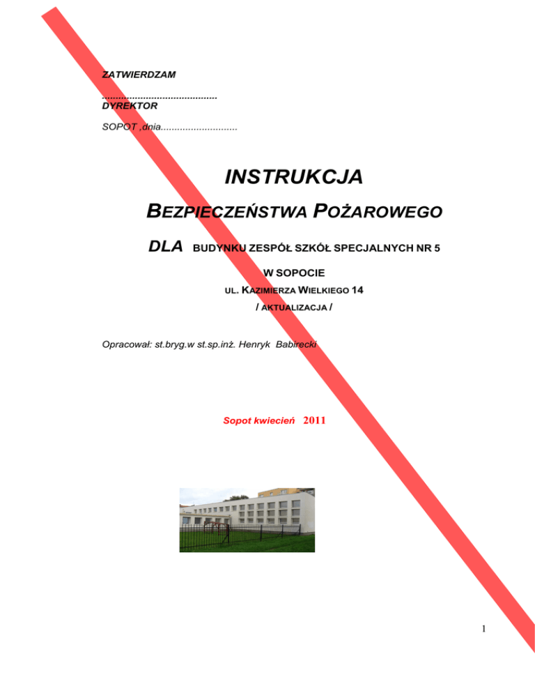 ZATWIERDZAM .......................................... DYREKTOR SOPOT ,dnia............................ INSTRUKCJA BEZPIECZEŃSTWA POśAROWEGO DLA BUDYNKU ZESPÓŁ SZKÓŁ SPECJALNYCH NR 5 W SOPOCIE UL. KAZIMIERZA WIELKIEGO 14 / AKTUALIZACJA / Opracował: st.bryg.w st.sp.inŜ. Henryk Babirecki Sopot kwiecień 2011 1 WSTĘP: ........................................................................................................................... 3 I. WARUNKI OCHRONY PRZECIWPOśAROWEJ, WYNIKAJĄCE Z PRZEZNACZENIA, SPOSOBU UśYTKOWANIA, PROWADZONEGO PROCESU TECHNOLOGICZNEGO, MAGAZYNOWANIA (SKŁADOWANIA) I WARUNKÓW TECHNICZNYCH OBIEKTU, W TYM ZAGROśENIA WYBUCHEM;................................................................................................................... 5 1.Charakterystyka poŜarowo - techniczna obiektu . ......................................................... 5 2.Lokalizacja budynku . .................................................................................................... 7 3.Przewidywana gęstość obciąŜenia ogniowego............................................................... 7 4. Kategoria zagroŜenia ludzi, przewidywana liczba osób na kaŜdej kondygnacji i w pomieszczeniach, w których przebywać mogą jednocześnie większe grupy ludzi; .. 7 5. Parametry poŜarowe występujących materiałów palnych . .......................................... 7 6.Ocena zagroŜenia wybuchem pomieszczeń oraz przestrzeni zewnętrznych ................. 8 7. Podział obiektu na strefy poŜarowe. ............................................................................. 8 9. Warunki ewakuacji...................................................................................................... 10 10.Elementy wykończenia wnętrz. ................................................................................. 10 11.Inne urządzenia, instalacje związane z zabezpieczeniem ppoŜ. ................................ 10 12.Zaopatrzenie w wodę do zewnętrznego gaszenia poŜaru; ......................................... 11 13.Drogi poŜarowe.......................................................................................................... 11 II. OKREŚLENIE WYPOSAśENIA W WYMAGANE URZĄDZENIA PRZECIWPOśAROWE I GAŚNICE ORAZ SPOSOBY PODDAWANIA ICH PRZEGLĄDOM TECHNICZNYM I CZYNNOŚCIOM KONSERWACYJNYM; ...... 11 ............................................................................................................. 14 III.SPOSOBY POSTĘPOWANIA NA WYPADEK POśARU I INNEGO ZAGROśENIA;............................................................................................................... 19 IV. SPOSOBY ZABEZPIECZENIA PRAC NIEBEZPIECZNYCH POD WZGLĘDEM POśAROWYM, JEŚLI TAKIE PRACE SĄ PRZEWIDYWANE. ....... 21 V.WARUNKI I ORGANIZACJĘ EWAKUACJI LUDZI ORAZ PRAKTYCZNE SPOSOBY ICH SPRAWDZANIA;................................................................................. 24 VI. SPOSOBY ZAPOZNANIA UśYTKOWNIKÓW OBIEKTU, W TYM ZATRUDNIONYCH PRACOWNIKÓW, Z PRZEPISAMI PRZECIWPOśAROWYMI ORAZ TREŚCIĄ PRZEDMIOTOWEJ INSTRUKCJI;.................................................. 26 VII.ZADANIA I OBOWIĄZKI W ZAKRESIE OCHRONY PRZECIWPOśAROWEJ DLA OSÓB BĘDĄCYCH ICH STAŁYMI UśYTKOWNIKAMI; ............................... 27 VIII. WYCIĄG Z WAśNIEJSZYCH POSTANOWIEŃ Z DNIA Z DNIA 7 CZERWCA 2010 R. W SPRAWIE OCHRONY PRZECIWPOśAROWEJ BUDYNKÓW, INNYCH OBIEKTÓW BUDOWLANYCH I TERENÓW (DZ. U. NR 109/10, POZ. 719)............................................................................................................ 31 IX. ZESTAWIENIE WAśNIEJSZYCH PRZEPISÓW DOTYCZĄCYCH OCHRONY PRZECIWPOśAROWEJ........................................................................... 39 WSTĘP: Celem opracowania niniejszej Instrukcji jest zapewnienie bezpiecznych warunków ochrony ppoŜ. jak równieŜ uświadomienie pracownikom zjawiska zagroŜenia poŜarowego związanego z funkcjonowaniem szkoły . W instrukcji uwzględniono charakterystykę budynku zastosowanie zabezpieczeń ppoŜ. oraz organizację pracy. Postanowienia instrukcji obowiązują wszystkich uŜytkowników obiektu oraz osoby przebywające na jego terenie, jak równieŜ wykonujące jakiekolwiek prace w obiekcie. Zarządca obiektu ma prawo i obowiązek kontrolować przestrzeganie ustaleń zawartych w instrukcji. Zgodnie z § 6 rozporządzeniem Ministra Spraw Wewnętrznych i Administracji z dnia z dnia 7 czerwca 2010 r. w sprawie ochrony przeciwpoŜarowej budynków, innych obiektów budowlanych i terenów (Dz. U. Nr 109/10, poz. 719) instrukcja bezpieczeństwa poŜarowego powinna zawierać: 1) warunki ochrony przeciwpoŜarowej, wynikające z przeznaczenia, sposobu uŜytkowania, prowadzonego procesu technologicznego, magazynowania (składowania) i warunków technicznych obiektu, w tym zagroŜenia wybuchem; 2) określenie wyposaŜenia w wymagane urządzenia przeciwpoŜarowe i gaśnice oraz sposoby poddawania ich przeglądom technicznym i czynnościom konserwacyjnym; 3) sposoby postępowania na wypadek poŜaru i innego zagroŜenia; 4) sposoby zabezpieczenia prac niebezpiecznych pod względem poŜarowym, jeŜeli takie prace są przewidywane; 5) warunki i organizację ewakuacji ludzi oraz praktyczne sposoby ich sprawdzania; 6) sposoby zapoznania uŜytkowników obiektu, w tym zatrudnionych pracowników, z przepisami przeciwpoŜarowymi oraz treścią przedmiotowej instrukcji; 7) zadania i obowiązki w zakresie ochrony przeciwpoŜarowej dla osób będących ich stałymi uŜytkownikami; 8) plany obiektów, obejmujące takŜe ich usytuowanie, oraz terenu przyległego, z uwzględnieniem graficznych danych dotyczących w szczególności: a) powierzchni, wysokości i liczby kondygnacji budynku, b) odległości od obiektów sąsiadujących, c) parametrów poŜarowych występujących substancji palnych, d) występującej gęstości obciąŜenia ogniowego w strefie poŜarowej lub w strefach poŜarowych, e) kategorii 