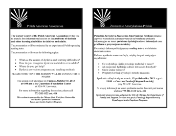 Zrzeszenie Amerykańsko-Polskie Polish American Association The Career Center of the Polish American Association invites you to attend a free informational session on the problems of dyslexia and other learning disabilities in children and adults. The presentation will be conducted by an experienced Polish-speaking reading tutor. The presentation will cover the following topics: • • • • What are the causes of dyslexia and learning difficulties? How do you recognize dyslexia in children or in adults? Where do you get help? Dyslexia correction programs and teaching methods PLEASE NOTE THAT THE SESSION WILL BE CONDUCTED IN POLISH The session will take place on Tuesday, October 15, 2013 at 6:00 pm at the Copernicus Foundation Center at 5216 W. Lawrence. For more information regarding the session, please call 773 282-1122 ext. 414 This session is sponsored by the Chicago Cook Workforce Partnership and by the Copernicus Foundation. Equal opportunity Employer/Program. Poradnia Zawodowa Zrzeszenia Amerykańsko Polskiego pragnie zaprosić wszystkich zainteresowanych na bezpłatne spotkanie informacyjne na temat problemu dysleksji u dzieci i dorosłych oraz problemu z przyswajaniem wiedzy. Prezentacji dokona polskojęzyczny reading tutor z wieloletnim doświadczeniem. Podczas spotkania omawiane będą między innymi następujące zagadnienia: • • • • Co to dysleksja i jakie powoduje trudności w nauce? Jak rozpoznać dysleksję u dzieci lub u osób dorosłych? Gdzie szukać pomocy? Programy korekcji dysleksji i metody nauczania Spotkanie odbędzie się we wtorek, 15 października, 2013 o godz. 18.00 w Centrum Fundacji Kopernikowskiej przy 5216 W. Lawrence. Po więcej informacji na temat spotkania można dzwonić pod numer telefonu 773 282-1122 wew. 414 Spotkanie sponsorowane jest przez the City of Chicago-the Department of Family and Support Services oraz przez Fundację Kopernikowską. Equal opportunity Employer/Program.