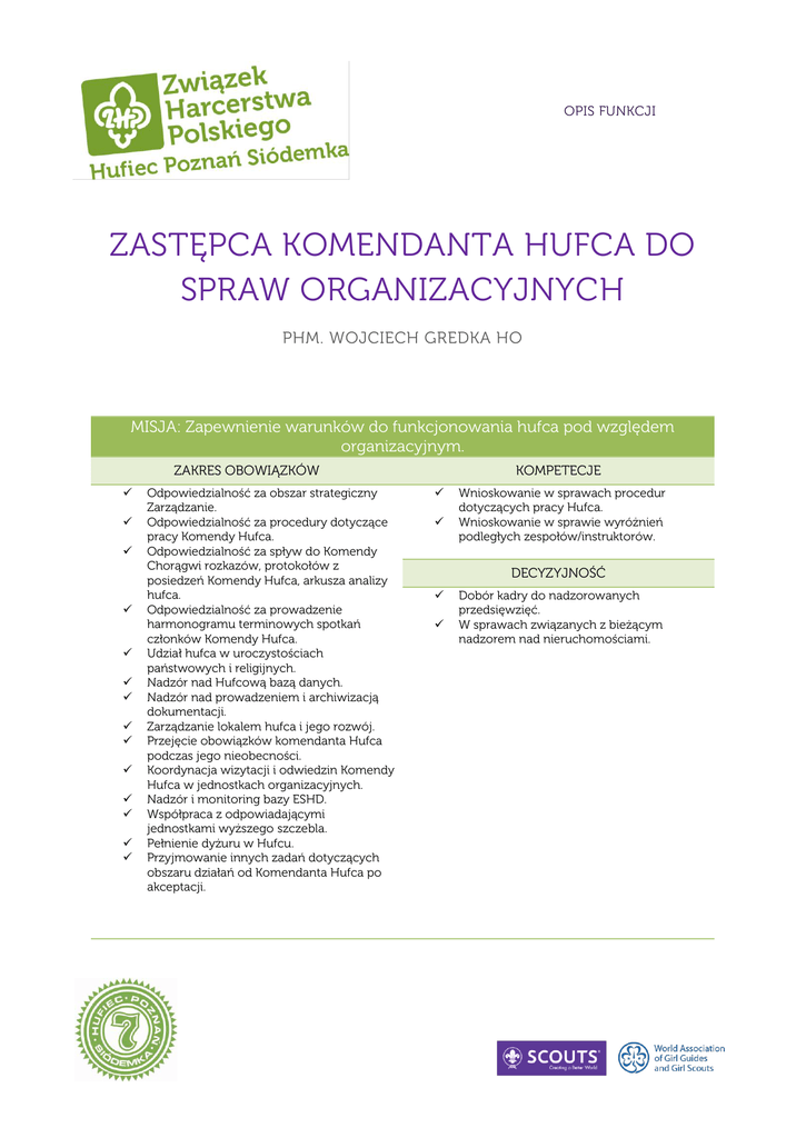 OPIS FUNKCJI ZASTĘPCA KOMENDANTA HUFCA DO SPRAW ORGANIZACYJNYCH PHM. WOJCIECH GREDKA HO MISJA: Zapewnienie warunków do funkcjonowania hufca pod względem organizacyjnym. ZAKRES OBOWIĄZKÓW Odpowiedzialność za obszar strategiczny Zarządzanie. Odpowiedzialność za procedury dotyczące pracy Komendy Hufca. Odpowiedzialność za spływ do Komendy Chorągwi rozkazów, protokołów z posiedzeń Komendy Hufca, arkusza analizy hufca. Odpowiedzialność za prowadzenie harmonogramu terminowych spotkań członków Komendy Hufca. Udział hufca w uroczystościach państwowych i religijnych. Nadzór nad Hufcową bazą danych. Nadzór nad prowadzeniem i archiwizacją dokumentacji. Zarządzanie lokalem hufca i jego rozwój. Przejęcie obowiązków komendanta Hufca podczas jego nieobecności. Koordynacja wizytacji i odwiedzin Komendy Hufca w jednostkach organizacyjnych. Nadzór i monitoring bazy ESHD. Współpraca z odpowiadającymi jednostkami wyższego szczebla. Pełnienie dyżuru w Hufcu. Przyjmowanie innych zadań dotyczących obszaru działań od Komendanta Hufca po akceptacji. KOMPETECJE Wnioskowanie w sprawach procedur dotyczących pracy Hufca. Wnioskowanie w sprawie wyróżnień podległych zespołów/instruktorów. DECYZYJNOŚĆ Dobór kadry do nadzorowanych przedsięwzięć. W sprawach związanych z bieżącym nadzorem nad nieruchomościami. PROWADZONA/NADZOROWANA DOKUMENTACJA Protokoły z posiedzeń Komendy Hufca. Rozkazy Komendanta Hufca. Rejestr pieczęci. System kontroli dostępu (zamiast rejestru kluczy). Porozumienia. Dokumentacja zjazdów Hufca. Pozostała ogólna dokumentacja hufca nie powodująca skutków finansowych. Dokumentacja podległych zespołów. KRYTERIA OCENY Przepływ dokumentów w Hufcu. Terminowość spływu dokumentów do Komendy Chorągwi. Przejrzystość hufcowej dokumentacji. Przejrzystość procedur i powszechność wiedzy na ich temat. Stan techniczny i porządek w siedzibie Hufca. Dostępność harcówki Hufca. Rzetelność prowadzonej dokumentacji. Aktualność danych w bazie ESHD. PRZEŁOŻONY Komendant Hufca. PODWŁADNI/NADZOROWANE ZESPOŁY Drużyna Sztandarowa. Gospodarz Harcówki Hufca. Sekretarz Komendy Hufca. Instruktor ESHD. ZAPEWNIANE WSPARCIE Bieżący kontakt i wsparcie Komendanta Hufca. Ocena pracy i informacja zwrotna od Komendanta Hufca. Powierzam funkcję. Akceptuję powyższy opis funkcji i deklaruje solidne wywiązywanie się z obowiązków. Podpis Komendanta Hufca Podpis Członka Komendy