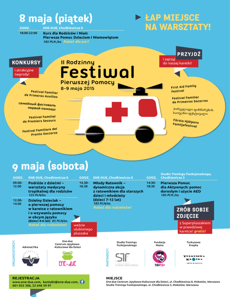 8 maja (piątek) GODZ. ENE-DUE, Chodkiewicza 8 18:00-22:00 Kurs dla Rodziców i Niań: Pierwsza Pomoc Dzieciom i Niemowlętom 185 PLN /os. Rabat dla par! ŁAP MIEJSCE NA WARSZTATY! PRZYJDŹ i zajrzyj do naszej karetki! KONKURSY i atrakcyjne nagrody! 9 maja (sobota) GODZ. ENE-DUE, Chodkiewicza 8 GODZ. ENE-DUE, Chodkiewicza 8 09.0012.00 Podróże z dziećmi − warsztaty medycyny tropikalnej dla rodziców 14.3018.30 14:30Młody Ratownik − 18:30 dynamiczna akcja z ratownikiem dla starszych dzieci i młodzieży (dzieci 7-12 lat) 125 PLN/os. 12.0014.00 Dzielny Dzieciak − o pierwszej pomocy w karetce z ratownikiem i o wzywaniu pomocy w obcym języku GODZ. Studio Treningu Funkcjonalnego, Chodkiewicza 3 Pierwsza Pomoc dla Aktywnych: pomoc dorosłym i użycie AED 185 PLN /os. 185 PLN/os. Rabat dla rodzeństw! ZRÓB SOBIE ZDJĘCIE (dzieci 4-6 lat) 85 PLN/os. AdrenaLTika REJESTRACJA z Superpluszakiem w prawdziwej karetce! gratis! weźcie ulubionego pluszaka Ene-due Centrum Językowo-Kulturowe dla Dzieci www.ene-due.com, [email protected], 601 052 306, 22 646 59 97 Studio Treningu Funkcjonalnego Fundacja Mama Turkusowa Kropka PARTNERZY: ORGANIZATORZY: Rabat dla rodzeństw! MIEJSCE Ene-due Centrum Językowo-Kulturowe dla Dzieci, ul. Chodkiewicza 8, Mokotów, Warszawa Studio Treningu Funkcjonalnego, ul. Chodkiewicza 3, Mokotów, Warszawa
