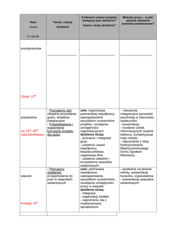 Data Temat, rodzaj, 1dzień działania Z którymi celami projektu związane jest działanie? Czemu słuŜy działanie? Metody pracy – w jaki sposób działanie zostanie zrealizowane? 01.06.09 przedpołudnie --------------------------- -------------------------------- ----------------------------- - Poznajemy się!: oficjalne przywitanie popołudnie gości, działania integracyjne - Przedstawienie i wyjaśnienie od 1400-1800 koncepcji projektu sala kominkowa dla gości cele: organizacja partnerskiej współpracy, zaangaŜowanie wszystkich uczestników projektu, rozwijanie umiejętności organizacyjnych działania słuŜą: - poznaniu i integracji grup, - ustaleniu zasad współpracy, bezpieczeństwa, organizacji dnia - ustaleniu składów i kompetencji zespołów zadaniowych cele: partnerska współpraca, zaangaŜowanie wszystkich uczestników, rozwijanie umiejętności pracy w zespole działania słuŜą: - integracji - organizacji działań - zapoznaniu się z moŜliwościami sprzętowymi - ćwiczenia integracyjne (prowadzi psycholog w obecności opiekunów) - prezentacja - rozdanie ulotek informacyjnych (waŜne telefony, kontakty)oraz map miasta - zapoznanie z ideą funkcjonowania Międzynarodowego Domu Spotkań MłodzieŜy Obiad 1300 wieczór Kolacja 1900 - Planujemy działania!: przygotowanie do prac w zespołach zadaniowych - spotkanie na terenie szkoły, prezentacja budynku, wyposaŜenia - prezentacja zespołów zadaniowych Data Temat, rodzaj, działania Z którymi celami projektu związane jest działanie? Czemu słuŜy działanie? Metody pracy – w jaki sposób działanie zostanie zrealizowane? 2dzień 02.06.09 Śniadanie 800 przedpołudnie -Wielokulturowy Oświęcim – zapoznanie z tradycjami współistnienia kultur polskiej i Ŝydowskiej na terenie miasta 9001000spotkanie z ks. Manfredem 1100-synagoga 1300zamek,muzeum ziemi oświecimskiej - Oświęcim : 800 lat historii Obiad 1400/1500 popołudnie wieczór kolacja/kiełbaski 1900 - Prace redakcyjne nad przewodnikiem: porządkowanie materiałów - Wieczór polski cele: budowanie postawy szacunku dla historii, tradycji, kultury, promowanie postawy tolerancji, zrozumienia oraz dialogu wielokulturowego działania słuŜą: - budowaniu przedwojennej wizji miasta i jego mieszkańców – tolerancja, szacunek, otwartość na dialog i współpracę cele: uczestnicy projektu znają zarówno historię Oświęcimia widzianą oczyma młodych mieszkańców miasta, jak i współczesność, odkrywają walory turystyczne miasta działania słuŜą: pogłębianiu wiedzy o mieście cele: opracowanie młodzieŜowego multimedialnego przewodnika polskolitewskiego po Oświęcimiu, przełamywanie stereotypowej wizji miasta, doskonalenie umiejętności współpracy działania słuŜą: redagowaniu, porządkowaniu, selekcjonowaniu zgromadzonego materiału do przewodnika cele: uczestnicy potrafią określić/scharakteryzować sylwetkę młodego Polaka i Litwina (kim jestem?, co lubię? Skąd jestem? Itp.) promowanie postawy - zwiedzanie Centrum śydowskiego oraz miasta i cmentarza Ŝydowskiego z przewodnikiem, - gromadzenie dokumentacji w zespołach zadaniowych, - obejrzenie filmu pt. ‘Oszpicin, ocalić od zapomnienia…”zrealizowanego przez nauczycieli i uczniów szkoły - wizyta w Centrum Dialogu i Modlitwy (spotkanie i rozmowa z przedstawicielem placówki) - wizyta w Muzeum Ziemi Oświęcimskiej, zapoznanie ze zbiorami, - spacer po plantach, - prezentacja młodzieŜy polskiej ( szlakiem wydarzeń historycznych, legend, tablic pamiątkowych w mieście m.in. Górnicki, Nidecki i In.) - spotkanie liderów grup - praca w zespołach - ustalenie kierunku wspólnych działań - program przygotowany przez stronę polską- np. o tradycjach, świętach, kuchni polskiej, muzyce, zainteresowaniach tolerancji, zrozumienia, działania słuŜą: integracji, pogłębianiu partnerskiej współpracy, zapoznaniu z krajem, środowiskiem i kulturą gospodarzy, tworzeniu porozumienia między młodzieŜą Data Temat, rodzaj, 3 dzień działania Z którymi celami projektu związane jest działanie? Czemu słuŜy działanie? Metody pracy – w jaki sposób działanie zostanie zrealizowane? 03.06.09 Sniadanie 730 przedpołudnie - II wojna światowa i jej wpływ na losy miasta i mieszkańców Rozpoczęcie wizyty 830 czas wolny cele: uczestnicy projektu znają historię miasta i okolicy, rozumieją konteksty historyczne i społeczne prezentowanych faktów historycznych, budzenie postawy szacunku dla historii, działania słuŜą: wzbudzeniu głębokiej refleksji odpoczynek - wizyta studyjna w muzeum KL AuschwitzBirkenau cele: przełamywanie stereotypowej wizji miasta Oświęcim, uczestnicy projektu znają współczesny Oświęcim działania słuŜą: zapoznaniu z aktualnymi tendencjami rozwoju miasta, Oświęcimskim Programem Strategicznym - spotkanie z przedstawicielem władz np. ds./promocji miasta itp. - wywiad, dyskusja panelowa odpoczynek Obiad 1400 popołudnie wieczór kolacja 1900/2o00 - Współczesne tendencje rozwoju miasta Oświęcim W szkole ok. 1700 Data Temat, rodzaj, 4 dzień działania Z którymi celami projektu związane jest działanie? Czemu słuŜy działanie? Metody pracy – w jaki sposób działanie zostanie zrealizowane? 04.06.09 śniadanie przedpołudnie popołudnie - Prace redakcyjne nad przewodnikiem: porządkowanie materiałów - Prace redakcyjne nad przewodnikiem: porządkowanie materiałów obiad w szkole W przerwie prac mecz cele: opracowanie młodzieŜowego multimedialnego przewodnika polskolitewskiego po Oświęcimiu, przełamywanie stereotypowej wizji miasta, doskonalenie umiejętności współpracy działania słuŜą: redagowaniu, porządkowaniu, selekcjonowaniu zgromadzonego materiału do przewodnika, dokumentowaniu prac nad projektem prace w zespołach zadaniowych, konsultacje, przygotowywanie materiałów, informacje na strony internetowe organizacji Data 5 dzień Temat, rodzaj, 05.06.09 działania Z którymi celami projektu związa