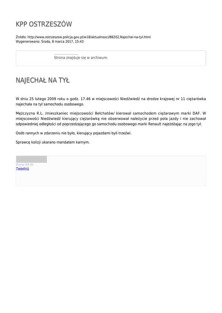 KPP OSTRZESZÓW Źródło: http://www.ostrzeszow.policja.gov.pl/w18/aktualnosci/88202,Najechal-na-tyl.html Wygenerowano: Środa, 8 marca 2017, 15:43 Strona znajduje się w archiwum. NAJECHAŁ NA TYŁ W dniu 25 lutego 2009 roku o godz. 17.46 w miejscowości Niedźwiedź na drodze krajowej nr 11 ciężarówka najechała na tył samochodu osobowego. Mężczyzna R.L. /mieszkaniec miejscowości Bełchatów/ kierował samochodem ciężarowym marki DAF. W miejscowości Niedźwiedź kierujący ciężarówką nie obserwował należycie przed pola jazdy i nie zachował odpowiedniej odległości od poprzedzającego go samochodu osobowego marki Renault najeżdżając na jego tył. Osób rannych w zdarzeniu nie było, kierujący pojazdami byli trzeźwi. Sprawcę kolizji ukarano mandatem karnym. Ocena: 0/5 (0) Tweetnij