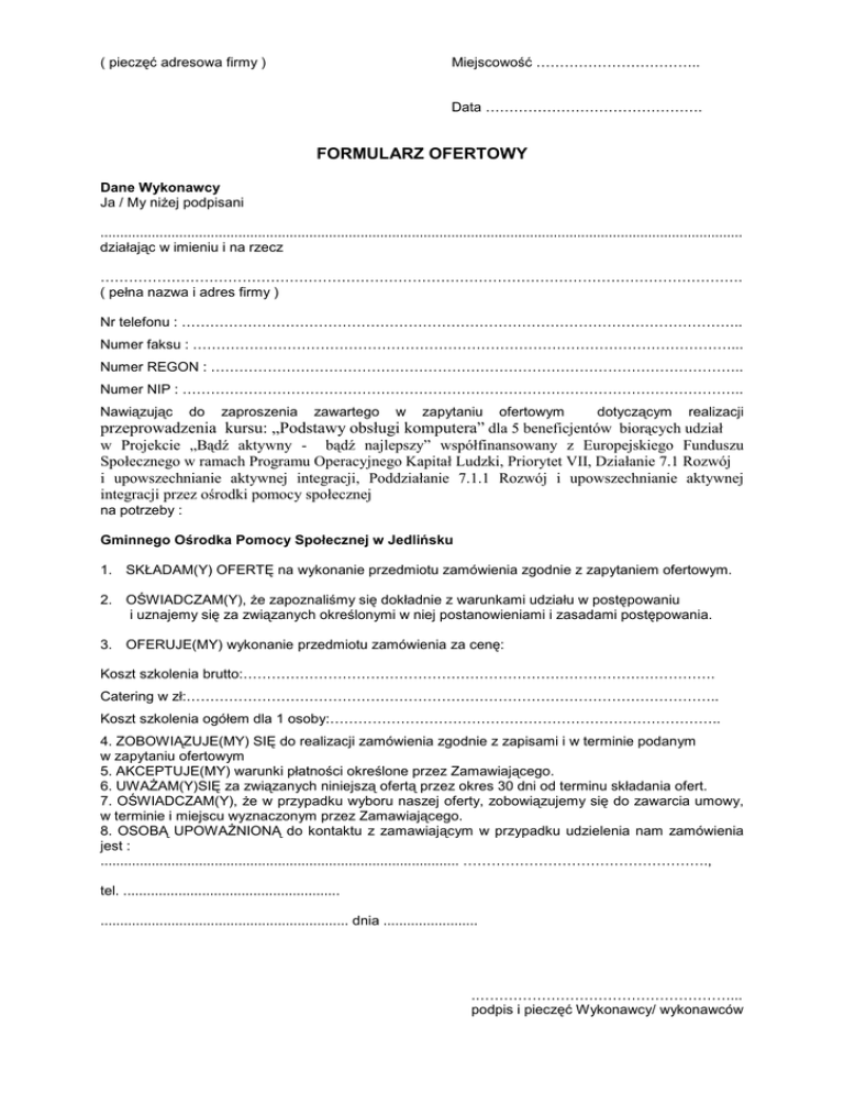 ( pieczęć adresowa firmy ) Miejscowość …………………………….. Data ………………………………………. FORMULARZ OFERTOWY Dane Wykonawcy Ja / My niżej podpisani ................................................................................................................................................................... działając w imieniu i na rzecz ………………………………………………………………………………………………………………………. ( pełna nazwa i adres firmy ) Nr telefonu : ……………………………………………………………………………………………………….. Numer faksu : ……………………………………………………………………………………………………... Numer REGON : ………………………………………………………………………………………………….. Numer NIP : ……………………………………………………………………………………………………….. Nawiązując do zaproszenia zawartego w zapytaniu ofertowym dotyczącym realizacji przeprowadzenia kursu: „Podstawy obsługi komputera” dla 5 beneficjentów biorących udział w Projekcie „Bądź aktywny - bądź najlepszy” współfinansowany z Europejskiego Funduszu Społecznego w ramach Programu Operacyjnego Kapitał Ludzki, Priorytet VII, Działanie 7.1 Rozwój i upowszechnianie aktywnej integracji, Poddziałanie 7.1.1 Rozwój i upowszechnianie aktywnej integracji przez ośrodki pomocy społecznej na potrzeby : Gminnego Ośrodka Pomocy Społecznej w Jedlińsku 1. SKŁADAM(Y) OFERTĘ na wykonanie przedmiotu zamówienia zgodnie z zapytaniem ofertowym. 2. OŚWIADCZAM(Y), że zapoznaliśmy się dokładnie z warunkami udziału w postępowaniu i uznajemy się za związanych określonymi w niej postanowieniami i zasadami postępowania. 3. OFERUJE(MY) wykonanie przedmiotu zamówienia za cenę: Koszt szkolenia brutto:………………………………………………………………………………………. Catering w zł:………………………………………………………………………………………………….. Koszt szkolenia ogółem dla 1 osoby:……………………………………………………………………….. 4. ZOBOWIĄZUJE(MY) SIĘ do realizacji zamówienia zgodnie z zapisami i w terminie podanym w zapytaniu ofertowym 5. AKCEPTUJE(MY) warunki płatności określone przez Zamawiającego. 6. UWAŻAM(Y)SIĘ za związanych niniejszą ofertą przez okres 30 dni od terminu składania ofert. 7. OŚWIADCZAM(Y), że w przypadku wyboru naszej oferty, zobowiązujemy się do zawarcia umowy, w terminie i miejscu wyznaczonym przez Zamawiającego. 8. OSOBĄ UPOWAŻNIONĄ do kontaktu z zamawiającym w przypadku udzielenia nam zamówienia jest : ........................................................................................... ……………………………………………., tel. ....................................................... ............................................................... dnia ........................ .………………………………………………... podpis i pieczęć Wykonawcy/ wykonawców