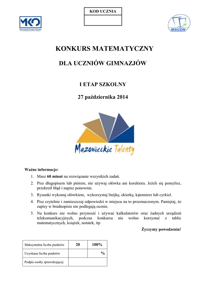 KOD UCZNIA KONKURS MATEMATYCZNY DLA UCZNIÓW GIMNAZJÓW I ETAP SZKOLNY 27 października 2014 Ważne informacje: 1. Masz 60 minut na rozwiązanie wszystkich zadań. 2. Pisz długopisem lub piórem, nie używaj ołówka ani korektora. Jeżeli się pomylisz, przekreśl błąd i napisz ponownie. 3. Rysunki wykonuj ołówkiem, wykorzystuj linijkę, ekierkę, kątomierz lub cyrkiel. 4. Pisz czytelnie i zamieszczaj odpowiedzi w miejscu na to przeznaczonym. Pamiętaj, że zapisy w brudnopisie nie podlegają ocenie. 5. Na konkurs nie wolno przynosić i używać kalkulatorów oraz żadnych urządzeń telekomunikacyjnych, podczas konkursu nie wolno korzystać z tablic matematycznych, książek, notatek, itp Życzymy powodzenia! Maksymalna liczba punktów Uzyskana liczba punktów Podpis osoby sprawdzającej 20 100% % Wojewódzki Konkurs Matematyczny – gimnazjum – etap szkolny BRUDNOPIS 2 Wojewódzki Konkurs Matematyczny – gimnazjum – etap szkolny Zadanie 1. (1 pkt) Na zajęciach koła matematycznego 68% uczestników stanowią chłopcy. Jaka najmniejsza możliwa liczba dziewcząt może uczestniczyć w zajęciach tego koła? A. 32 B. 16 C. 8 D. 4 Zadanie 2. (1 pkt) Liczba 13 0,001 jest równa: A. 0,13 B. 1,3 C. 0,13 0,1 Zadanie 3. (1 pkt) Ile liczb wymiernych znajduje się w zbiorze: 1 ; 2, (02); 0,036; 3,14 A. 3 B. 4 3 8; D. 1,3 0,1 (10) 2 ; C. 5 8 13 ? 9 D. 6 Zadanie 4. (1 pkt) Kąt jest równy A. 144 4 swojego kąta przyległego. Jaką miarę ma kąt ? 5 B. 100 C. 80 D. 36 Nr zadania 1. 2. 3. 4. Maks. liczba punktów 1 1 1 1 Uzyskana przez ucznia liczba punktów 3 Wojewódzki Konkurs Matematyczny – gimnazjum – etap szkolny Zadanie 5. (2 pkt.) Cztery punkty leżące na okręgu o promieniu r podzieliły ten okrąg na cztery łuki. Kąty środkowe oparte na tych łukach ustawiono w pewnej kolejności. Okazało się, że każdy następny kąt jest trzy razy większy od poprzedniego. Wyznacz długość łuku okręgu, na którym oparty jest największy z kątów. Nr zadania 5. Maks. liczba punktów 2 Uzyskana przez ucznia liczba punktów 4 Wojewódzki Konkurs Matematyczny – gimnazjum – etap szkolny Zadanie 6. (3 pkt.) Wyznacz wszystkie liczby a, dla których odwrotnością liczby b a 5 jest liczba 1 c a 5 . Oblicz sumę liczb b i c. 24 Nr zadania 6. Maks. liczba punktów 3 Uzyskana przez ucznia liczba punktów 5 Wojewódzki Konkurs Matematyczny – gimnazjum – etap szkolny Zadanie 7. (3 pkt) Największy wspólny dzielnik dwóch liczb całkowitych dodatnich jest równy 9. Jedna z tych liczb jest o 15% większa od drugiej. Wyznacz najmniejszą wspólną wielokrotność tych liczb. Nr zadania 7. Maks. liczba punktów 3 Uzyskana przez ucznia liczba punktów 6 Wojewódzki Konkurs Matematyczny – gimnazjum – etap szkolny Zadanie 8. (4 pkt) Rodzice wyjechali z Wojtkiem samochodem na wakacje. Pierwszą część trasy pokonali w ulewnym deszczu, jadąc z pewną stałą prędkością. Gdy deszcz przestał padać prędkość samochodu wzrosła o 20%. Gdyby na całej trasie samochód jechał z taką szybkością jak na trasie bezdeszczowej, to podróż Wojtka trwałaby o 40 minut krócej. Oblicz, w jakim czasie samochód pokonał pierwszą część trasy w ulewnym deszczu. Nr zadania 8. Maks. liczba punktów 4 Uzyskana przez ucznia liczba punktów 7 Wojewódzki Konkurs Matematyczny – gimnazjum – etap szkolny Zadanie 9. (4 pkt) Dany jest trapez ABCD, nie będący równoległobokiem, o podstawach AB i CD oraz wysokości DE. Na odcinku DE obrano taki punkt M, że suma pól trójkątów ABM i CDM jest równa połowie pola trapezu ABCD. Uzasadnij, że punkt M jest środkiem odcinka DE. Nr zadania 9. Maks. liczba punktów 4 Uzyskana przez ucznia liczba punktów 8 Wojewódzki Konkurs Matematyczny – gimnazjum – etap szkolny BRUDNOPIS 9