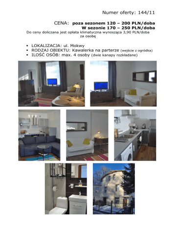 Numer oferty: 144/11 CENA: poza sezonem 120 – 200 PLN/doba W sezonie 170 – 250 PLN/doba Do ceny doliczana jest opłata klimatyczna wynosząca 3,90 PLN/doba za osobę LOKALIZACJA: ul. Mokwy RODZAJ OBIEKTU: Kawalerka na parterze (wejście z ogródka) ILOŚĆ OSÓB: max. 4 osoby (dwie kanapy rozkładane) Numer oferty: 144/11 LOKALIZACJA: ul. Mokwy Lp. PRZEDMIOT OCENY UWAGI 1. Nowe/stare budownictwo Wyremontowana ładna kamienica 2. Nowe/stare meble Nowe meble 3. Parking na posesji/GaraŜ Miejsce parkingowe na zamkniętej posesji 4. Balkon / taras / ogródek Mały ogródek przed posesją 5. Telewizor (Kablówka, TV Sat), Radio TV kablowa 6. Dostęp do telefonu Nie 7. Dostęp do internetu Tak 8. Kuchnia Aneks kuchenny wyposaŜony w: lodówkę, kuchenkę indukcyjną, pralkę, czajnik elektryczny, toster, serwis do kawy, sztućce, zastawę i garnki. 9. Łazienka Łazienka z kabiną prysznicową oraz WC 10. Pościel, ręczniki Tak 11. Dostęp do szafy / półek Tak 12. Pobyt ze zwierzątkiem Do uzgodnienia 14. Niepełnosprawni (winda, podjazd) Obiekt ma bezpośredni wjazd z podwórza 15. Plac zabaw dla dzieci Nie 16. Spokojna okolica w centrum, 300 metrów do morza, 300 metrów do głównej ulicy Bohaterów Mont3 Cassino, 15 minut pieszo od Dworca PKP 17. Lokalizacja • Centrum – Dworzec PKP • PlaŜa, park • Dzielnica • Komunikacja miejska Osoby palące Nie 18. Piwnica/schowek Komórka 19. Faktura VAT lub Rachunek 20. Inne