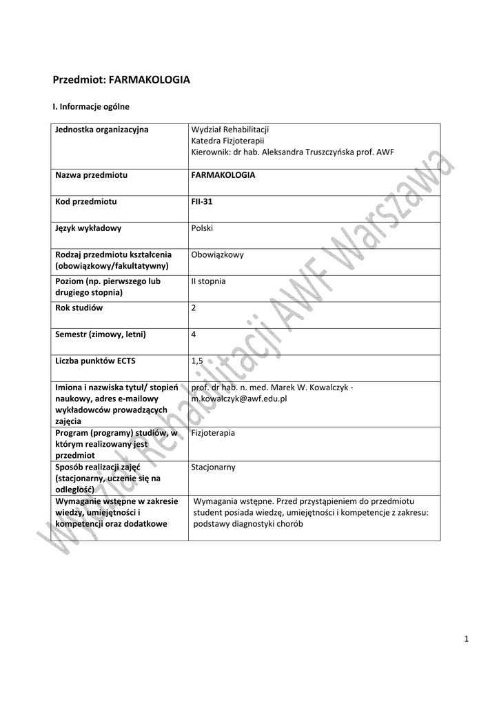 Przedmiot: FARMAKOLOGIA I. Informacje ogólne Jednostka organizacyjna Wydział Rehabilitacji Katedra Fizjoterapii Kierownik: dr hab. Aleksandra Truszczyńska prof. AWF Nazwa przedmiotu FARMAKOLOGIA Kod przedmiotu FII-31 Język wykładowy Polski Rodzaj przedmiotu kształcenia (obowiązkowy/fakultatywny) Obowiązkowy Poziom (np. pierwszego lub drugiego stopnia) II stopnia Rok studiów 2 Semestr (zimowy, letni) 4 Liczba punktów ECTS 1,5 Imiona i nazwiska tytuł/ stopień naukowy, adres e-mailowy wykładowców prowadzących zajęcia Program (programy) studiów, w którym realizowany jest przedmiot Sposób realizacji zajęć (stacjonarny, uczenie się na odległość) Wymaganie wstępne w zakresie wiedzy, umiejętności i kompetencji oraz dodatkowe prof. dr hab. n. med. Marek W. Kowalczyk [email protected] Fizjoterapia Stacjonarny Wymagania wstępne. Przed przystąpieniem do przedmiotu student posiada wiedzę, umiejętności i kompetencje z zakresu: podstawy diagnostyki chorób 1 II. Informacje szczegółowe Cele przedmiotu C1 Zapoznanie studenta z podstawami farmakologii C2 Zapoznanie studenta z grupami leków stosowanych w różnych schorzeniach C3 Zapoznanie studenta z reakcjami alergicznymi i toksycznego działania leków Efekty kształcenia w zakresie wiedzy, umiejętności i kompetencji społecznych dla przedmiotu Efekt kształcenia Treść efektu kształcenia dla przedmiotu Odniesienie Odniesienie kierunkowy do celów do efektów obszarowych Wiedza K_W02 Posiada wiedzę na temat określonej grupy leków stosowanych w zabiegach fizjoterapeuty cznych w różnych jednostkach chorobowych 1. Podstawy farmakologii. Podstawowe pojęcia, definicja leku, 2. Farmakokinetyka i biodostępność, koncepcja receptora. 3. Mechanizmy działań ubocznych leków, alergie polekowe. 4. Chemioterapia zakażeń bakteryjnych, grzybiczych, wirusowych. Środki odkażające i antyseptyczne. 5. Środki znieczulające miejscowo i ogólnie. 6. Leki przeciwbólowe. Niesterydowe leki przeciwzapalne i opioidy. Leki przeciwgorączkowe. 7. Ośrodkowy układ nerwowy – leki psychotropowe, przeciwpadaczkowe, uspokajające 8. Układ sercowo-naczyniowy. Leki stosowane w niewydolności krążenia. Leki antyarytmiczne. Leczenie nadciśnienia tętniczego 9. Leczenie choroby niedokrwiennej serca 10. Leczenie różnych typów cukrzycy 11. Leczenie stosowane w chorobach układu pokarmowego 12. Farmakoterapia w chorobach układu oddechowego 13. Leki przeciwnowotworowe. Terapia paliatywna 14. Najważniejsze leki stosowane w procesach fizjoterapii 15. Uzależnienia lekowe C1/C2/C3 M2A_W01 Umiejętności K_U01 Potrafi stosować zasady współpracy i komunikowania się w pracach leczącego zespołu wielodyscyplinarneg o i w realizacji zadań badawczych oraz przygotować wniosek o zgodę komisji bioetycznej na prowadzenie badań naukowych 1. Potrafi ocenia wpływ leczenia farmakologicznego C2/C3 na procesy zachodzące w poszczególnych narządach w trakcie rehabilitacji; 2. Różnicuje poszczególne grupy leków i ich zastosowanie lecznicze w chorobach wymagających rehabilitacji 3. Potrafi przygotować dla zespołu leczącego i badawczego informację o terapii farmakologicznej M2A_U01 M2A_U14 2 Kompetencje społeczne K_K01 Rozumie potrzebę uczenia się przez całe życie i potrafi inicjować i organizować procesy grupowego uczenia się w zespole 1. Pozyskuje informacje o nowych lekach i ich zastosowaniu w chorobach wymagających zabiegów rehabilitacyjnych 2. Wykazuje odpowiedzialność za prawidłową realizację zleconej przez lekarza farmakoterapii w czasie rehabilitacji C2/C3 M2A_K01 Treści programowe Treści programowe Tytuł wykładu Odniesienie do efektów kształcenia kierunkowych/ przedmiotowych Odniesienie do celów przedmiotu K_W02/1-15 C1/C2/C3 WYKŁADY TP1- TP14 1. Wprowadzenie do farmakologii, dziedziny farmakologii, drogi podawania leków. 2. Losy leku w organizmie, działania toksyczne 3. Farmakologia układu nerwowego 4. Farmakologia chorób neurodegeneracyjnych 5. Farmakologia bólu 6. Farmakologia układu sercowo-naczyniowego 7. Farmakologia układu oddechowego 8. Farmakologia w onkologii 9. Farmakologia układu endokrynnego 10. Farmakologia przewodu pokarmowego 11. Podstawy i zasady stosowania chemioterapii 12. Witaminy i sole mineralne, preparaty roślinne 13. Uzależnienia lekowe 14. Najważniejsze leki stosowane w procesach fizjoterapii Planowane formy/działania/metody dydaktyczne Treści programowe TP1-TP14 Metoda dydaktyczna Wykłady informacyjne i problemowe Odniesienie do efektów kształcenia kierunkowych /przedmiotowych/ K_W02 Środki dydaktyczne: 1. Komputer + rzutnik multimedialny 2. Prezentacje tematyczne 3 Metody i kryteria oceniania Efekt kształcenia dla przedmiotu K_W02 Typy/ Metody oceniające Treści programowe (TP) TP1 – TP14 F- sprawdzian pisemny wiedzy z TP1- TP7 F- sprawdzian pisemny wiedzy z TP8- Tp14 Zalecana lista lektur lub lektury obowiązkowe Literatura obowiązkowa: 1. Danysz A. Buczko W.(red.): Kompendium farmakologii i farmakoterapii. Urban &Partner, Wrocław 2008 2. Korbut R. (red.): Farmakologia po prostu. Wyd. Uniwersytetu Jagiellońskiego, Kraków 2009 Literatura uzupełniająca: 1. Neal M.J.: Farmakologia w zarysie. PZWL, Warszawa 2005. Punkty ECTS - 1 pkt - 30 godz. pracy studenta (kontaktowych + samodzielnych) RODZAJ ZAJĘĆ GODZINY Godziny kontaktowe Zapoznanie się z zalecaną literaturą Przygotowanie do zaliczenia 30 10 5 Razem = 45 godz. = 1,5 ECTS 4