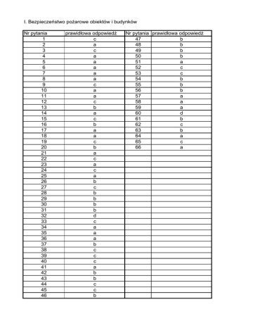 I. Bezpieczeństwo pożarowe obiektów i budynków Nr pytania 1 2 3 4 5 6 7 8 9 10 11 12 13 14 15 16 17 18 19 20 21 22 23 24 25 26 27 28 29 30 31 32 33 34 35 36 37 38 39 40 41 42 43 44 45 46 prawidłowa odpowiedź c a c a a a a a c a a c b a c b a a c b a c a c a b c b b b b d c a a a b c c c a b b c c b Nr pytania prawidłowa odpowiedź 47 b 48 b 49 b 50 b 51 a 52 c 53 c 54 b 55 b 56 b 57 a 58 a 59 a 60 d 61 b 62 c 63 b 64 a 65 c 66 a II. Środki Gaśnicze, Neutralizatory i Sorbenty Nr pytania prawidłowa odpowiedź 1 c 2 b 3 d 4 d 5 a,b 6 b 7 a 8 c 9 b 10 a 11 c 12 c 13 a 14 c 15 b 16 b 17 b 18 b 19 d 20 a 21 b 22 c 23 b 24 c 25 c 26 d 27 c 28 b 29 a 30 d 31 a 32 b 33 b 34 b Nr pytania prawidłowa odpowiedź 35 c 36 c 37 b 38 c 39 b 40 d 41 d 42 b 43 a 44 a 45 b 46 c 47 d 48 a 49 d 50 b 51 a 52 a 53 d x x x x x x x x x x x x x x x prawidłowa odpowiedź Nr pytania prawidłowa odpowiedź Nr pytania prawidłowa odpowiedź Nr pytania prawidłowa odpowiedź Nr pytania prawidłowa odpowiedź WYPOSAŻENIE TECHNICZNE I SPRZĘT Nr pytania III. 1 2 3 4 5 6 7 8 9 10 11 12 13 14 15 16 17 18 19 20 21 22 23 24 25 26 27 28 29 30 31 32 33 34 35 36 37 38 39 40 41 42 43 44 45 46 47 48 49 50 c b a b c b b a c a c b a b b b b c c c c c b b a a c b b a c b a c a c a a b d c c a b b c a b b b 51 52 53 54 55 56 57 58 59 60 61 62 63 64 65 66 67 68 69 70 71 72 73 74 75 76 77 78 79 80 81 82 83 84 85 86 87 88 89 90 91 92 93 94 95 96 97 98 99 100 a c b b b c a c a a b b b a a c b c b b a a c a c b c c b b a c c c c a b a b a c c a b b b a a c a 101 102 103 104 105 106 107 108 109 110 111 112 113 114 115 116 117 118 119 120 121 122 123 124 125 126 127 128 129 130 131 132 133 134 135 136 137 138 139 140 141 142 143 144 145 146 147 148 149 150 b a c a b a b a a c a b a b c b c c c b c b b a c c b a c b a c c a c b a c b a b a a b c c c c b b 151 152 153 154 155 156 157 158 159 160 161 162 163 164 165 166 167 168 169 170 171 172 173 174 175 176 177 178 179 180 181 182 183 184 185 186 187 188 189 190 191 192 193 194 195 196 197 198 199 200 b a,b b b c b a,b a c b b a c b a,c a a b c b b c b c b b a c b a a b b b c a b,c c c b a b c a b c c a b b 201 202 203 204 205 206 207 208 209 210 211 212 213 214 215 216 217 218 219 220 221 222 223 224 225 226 227 228 229 230 231 232 233 234 235 236 237 238 239 240 241 242 243 244 245 246 247 248 249 250 b b a a b c a b b a b c a d b b a c b c a d d a a b c c c a b c b b a b b c a b a c a d b a c b a a Strona 1 Nr pytania prawidłowa odpowiedź Nr pytania prawidłowa odpowiedź Nr pytania prawidłowa odpowiedź 271 272 273 274 275 276 277 278 279 280 281 282 283 284 285 286 287 288 289 290 a c b b b a,b c a b a b a b b a a,b a,b,c a,b,c a,b a,b 291 292 293 294 295 296 297 298 299 300 301 302 303 304 305 306 307 308 309 310 a,b a,b a,b c c c a c b b d a c b c b c c a c 311 312 313 314 315 316 317 x x x x x x x x x x x x x a a c b b b a Strona 2 prawidłowa odpowiedź prawidłowa odpowiedź b b c b b a c a b c b c a c b a b c a b Nr pytania Nr pytania 251 252 253 254 255 256 257 258 259 260 261 262 263 264 265 266 267 268 269 270 IV. Prawa I Obowiązki Operatora Pojazdu / Sprzętu Pożarniczego. Nr pytania 1 2 3 4 5 6 7 8 9 10 11 12 13 14 15 16 17 18 19 20 prawidłowa odpowiedź c b b a c b a a b a a,b,c c a,b,c a,b,c b b a b c a Nr pytania prawidłowa odpowiedź 21 a 22 a 23 b 24 b 25 a 26 b 27 a 28 c 29 c 30 c 31 b 32 a 33 a 34 c x x x x x x Taktyka działań gaśniczych Nr pytania prawidłowa odpowiedź Nr pytania prawidłowa odpowiedź Nr pytania prawidłowa odpowiedź Nr pytania prawidłowa odpowiedź Nr pytania prawidłowa odpowiedź V 1 2 3 4 5 6 7 8 9 10 11 12 13 14 15 16 17 18 19 20 21 22 23 24 25 26 27 28 29 30 31 32 33 34 35 36 37 38 39 40 41 42 43 44 45 46 47 48 49 50 b c a a b a c b a c a b b b c c b b b b b a c b c b b a b b a a,b,c,d,e a b c c c c c b b b b b b a b a b b 51 52 53 54 55 56 57 58 59 60 61 62 63 64 65 66 67 68 69 70 71 72 73 74 75 76 77 78 79 80 81 82 83 84 85 86 87 88 89 90 91 92 93 94 95 96 97 98 99 100 a c a b c a a a b b c b a c c a c b c a c b c b b c a b a b b b b c c a c c b c b a a a a c b b b a 101 102 103 104 105 106 107 108 109 110 111 112 113 114 115 116 117 118 119 120 121 122 123 124 125 126 127 128 129 130 131 132 133 134 135 136 137 138 139 140 141 142 143 144 145 146 147 148 149 150 c b c c b b a b a b a c b b a a b b a a a c b c b a c c a c c b c a b d b c a a b c c a a a a a b b 151 152 153 154 155 156 157 158 159 160 161 162 163 164 165 166 167 168 169 170 171 172 173 174 175 176 177 178 179 180 181 182 183 184 185 186 187 188 189 190 191 192 193 194 195 196 197 198 199 200 b b c c b b b a a b b b a b c a b b a c b b a a b c a a a b b b b b c b c c a a b a b d b c c c c b 201 202 203 204 205 206 207 208 209 210 211 212 213 214 215 216 217 218 219 220 221 222 223 224 225 226 227 228 229 230 231 232 233 234 235 236 237 238 239 240 241 242 243 244 245 246 247 248 249 250 b a c a a c b b c a b b b a b b a c c c c c b b b c c b c a b b c b c a c b c b a c b c b c b a c c Strona 1 prawidłowa odpowiedź c a c Strona 2 prawidłowa odpowiedź Nr pytania prawidłowa odpowiedź Nr pytania prawidłowa odpowiedź Nr pytania prawidłowa odpowiedź Nr pytania Nr pytania 251 252 253 x x x x x x x x x x x x x x x x x prawidłowa odpowiedź Nr pytania prawidłowa odpowiedź Nr pytania prawidłowa odpowiedź Nr pytania prawidłowa odpowiedź Nr pytania prawidłowa odpowiedź Taktyka działań ratowniczych - dla jednostek podstawowych Nr pytania VI A 1 2 3 4 5 6 7 8 9 10 11 12 13 14 15 16 17 18 19 20 21 22 23 24 25 26 27 28 29 30 31 32 33 34 35 36 37 38 39 40 41 42 43 44 45 46 47 48 49 50 c b a b c b c a b b b a c b d c a a c a c c c b c b c b d d c b c a a c b b c b a c c b a b a a a b 51 52 53 54 55 56 57 58 59 60 61 62 63 64 65 66 67 68 69 70 71 72 73 74 75 76 77 78 79 80 81 82 83 84 85 86 87 88 89 90 91 92 93 94 95 96 97 98 99 100 b c a a a,c a b a a a a c c b a b a b b b c a b a a b a a c b b c a b b d a c b b a a a a c a a a b b 101 102 103 104 1