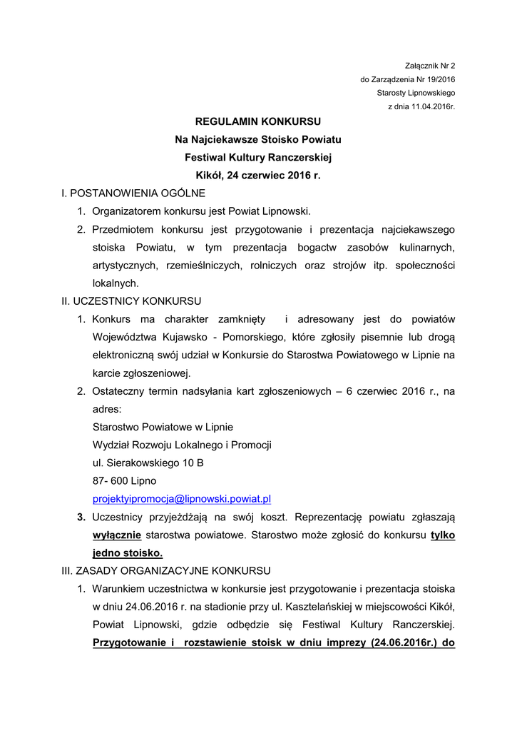 Załącznik Nr 2 do Zarządzenia Nr 19/2016 Starosty Lipnowskiego z dnia 11.04.2016r. REGULAMIN KONKURSU Na Najciekawsze Stoisko Powiatu Festiwal Kultury Ranczerskiej Kikół, 24 czerwiec 2016 r. I. POSTANOWIENIA OGÓLNE 1. Organizatorem konkursu jest Powiat Lipnowski. 2. Przedmiotem konkursu jest przygotowanie i prezentacja najciekawszego stoiska Powiatu, w tym prezentacja bogactw zasobów kulinarnych, artystycznych, rzemieślniczych, rolniczych oraz strojów itp. społeczności lokalnych. II. UCZESTNICY KONKURSU 1. Konkurs ma charakter zamknięty i adresowany jest do powiatów Województwa Kujawsko - Pomorskiego, które zgłosiły pisemnie lub drogą elektroniczną swój udział w Konkursie do Starostwa Powiatowego w Lipnie na karcie zgłoszeniowej. 2. Ostateczny termin nadsyłania kart zgłoszeniowych – 6 czerwiec 2016 r., na adres: Starostwo Powiatowe w Lipnie Wydział Rozwoju Lokalnego i Promocji ul. Sierakowskiego 10 B 87- 600 Lipno [email protected] 3. Uczestnicy przyjeżdżają na swój koszt. Reprezentację powiatu zgłaszają wyłącznie starostwa powiatowe. Starostwo może zgłosić do konkursu tylko jedno stoisko. III. ZASADY ORGANIZACYJNE KONKURSU 1. Warunkiem uczestnictwa w konkursie jest przygotowanie i prezentacja stoiska w dniu 24.06.2016 r. na stadionie przy ul. Kasztelańskiej w miejscowości Kikół, Powiat Lipnowski, gdzie odbędzie się Festiwal Kultury Ranczerskiej. Przygotowanie i rozstawienie stoisk w dniu imprezy (24.06.2016r.) do godziny 14:00. Po tej godzinie nie będzie możliwości wjazdu na plac imprezy. Gotowość stoisk do oceny wyznacza się na godz. 16:00. 2. Organizatorzy nie zapewniają żadnych mebli (ławek, stołów, krzeseł itp.) na potrzeby wyposażenia stoisk. 3. Stoiska powinny zostać opatrzone planszą informacyjną zawierającą m.in. nazwę powiatu. IV. KOMISJA KONKURSOWA 1. Komisja konkursowa powołana przez Organizatora będzie obradować dnia 24.06.2016 r., od godz. 16.30 w miejscu imprezy plenerowej. 2. Komisja konkursowa wyłoni laureatów, biorąc pod uwagę następujące kryteria: a. Bogactwo prezentowanych wyrobów, produktów, b. Prezentacja możliwie oryginalnych produktów, strojów, tańców, pieśni, c. Aranżacja i kompozycja stoiska, d. Pomysłowość na sposób ekspozycji, e. Estetyka i jakość obsługi stoiska. 3. Komisja konkursowa przyzna nagrody za I, II i III miejsce. V. ROZSTRZYGNIĘCIE KONKURSU I ROZDANIE NAGRÓD 1. Rozstrzygnięcie konkursu i rozdanie nagród odbędzie się 24.06.2014 r., około godz. 19:00 podczas Festiwalu Kultury Ranczerskiej. 2. Za zajęcie I, II i III miejsca przewidziano nagrody, dla pozostałych uczestników Konkursu dyplomy uczestnictwa. VI. POSTANOWIENIA KOŃCOWE 1. Udział uczestnika w konkursie oznacza jego akceptację zasad zawartych w niniejszym regulaminie. 2. Ustawienie stoiska w dniu konkursu jest równoznaczne z wyrażeniem przez Uczestnika zgody na warunki regulaminu, a także na przetwarzanie danych osobowych Uczestników dla potrzeb Organizatora. 3. Wszelkie kwestie nie ujęte w powyższym regulaminie rozstrzyga organizator.