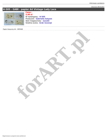 Informacje o produkcie Utworzono 08-03-2017 H-505 - GABI - papier A4 Vintage Lady Lace Cena : 5,90 zł Nr katalogowy : H-505 Producent : Gabriella Solyom Stan magazynowy : wysoki Średnia ocena : brak recenzji fo rA R T. pl Papier klasyczny A4 - VINTAGE Wygenerowano w programie www.oscGold.com