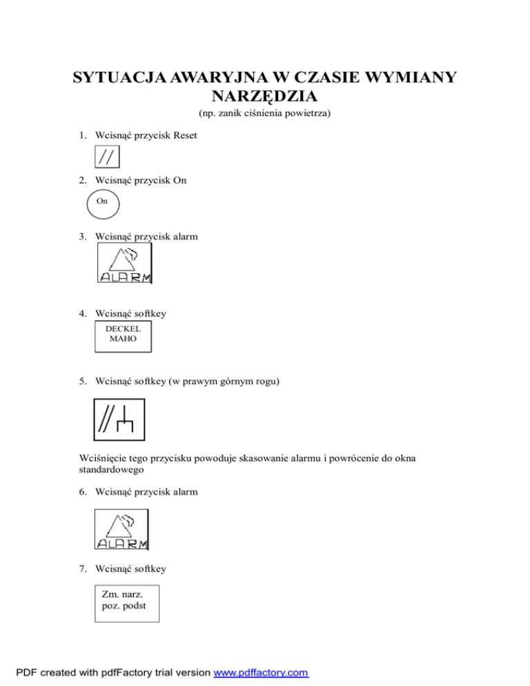 SYTUACJA AWARYJNA W CZASIE WYMIANY NARZĘDZIA (np. zanik ciśnienia powietrza) 1. Wcisnąć przycisk Reset 2. Wcisnąć przycisk On On 3. Wcisnąć przycisk alarm 4. Wcisnąć softkey DECKEL MAHO 5. Wcisnąć softkey (w prawym górnym rogu) Wciśnięcie tego przycisku powoduje skasowanie alarmu i powrócenie do okna standardowego 6. Wcisnąć przycisk alarm 7. Wcisnąć softkey Zm. narz. poz. podst PDF created with pdfFactory trial version www.pdffactory.com Wciśnięcie powyższego przycisku powinno aktywować zablokowaną funkcję wymiany narzędzia. Procedura powinna się w tym momencie zakończyć 8. Przejść do menu głównego wciskając softkey M Machine PDF created with pdfFactory trial version www.pdffactory.com