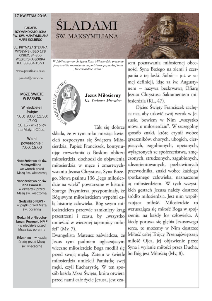 17 KWIETNIA 2016 PARAFIA RZYMSKOKATOLICKA PW. ŚW. MAKSYMILIANA MARII KOLBEGO UL. PRYMASA STEFANA WYSZYŃSKIEGO 178 CISIEC; 34-350 WĘGIERSKA GÓRKA TEL. 33 864-15-21 www.parafia.cisiec.eu W Jubileuszowym Świętym Roku Miłosierdzia proponujemy krótkie rozważania na podstawie papieskiej bulli „Misericordiae vultus”. [email protected] MSZE ŚWIĘTE W PARAFII: W niedziele i święta: 7.00; 9.00; 11.30; 17.00 10.15 - w kaplicy na Małym Ciścu; W dni powszednie : 7.00; 18.00 Nabożeństwo do św. Maksymiliana we wtorek przed Mszą św. wieczorną Nabożeństwo do św. Jana Pawła II w czwartek przed Mszą św. wieczorną Godzinki o NSPJ w piątki przed Mszą św. poranną Godzinki o Niepokalanym Poczęciu NMP - w niedzielę przed Mszą św. poranną Różaniec - w każdą środę przed Mszą św. wieczorną Jezus Miłosierny Ks. Tadeusz Mrowiec S tr. 2 Podsumowanie akcji „Jałmużna wielkopostna 2016” Młodym ofiarodawcom serdecznie dziękujemy i gratulujemy wielkiego serca Str. 3 PONIEDZIAŁEK - 18 KWIETNIA PIĄTEK - 22 KWIETNIA 700 700 - Za + Walerię Łajczak Za + Józefa Kocoń 1800 - Za + Wiktorię Motyka w r. śm. z m. Franciszkiem - Za + Józefa i Adama Bednarz z żoną 1800 - Za + Wojciecha i Marię Jarco Za + Wojciecha i Katarzynę Motyka ***************************************** ***************************************** WTOREK - 19 KWIETNIA SOBOTA - 23 KWIETNIA 700 - Za + Piotra Kasperlika 700 1800 - Za + Władysława Skolarza z rodzicami Z okazji 18 r. ur o zdrowie i bł. Boże dla Iwony - Za + Stefanię Pacyna w 4 r.śm. 1800 - Za + Władysława Jarco w r. śm. Za + Annę Motyka w 23 r. śm. z m. Józefem ***************************************** ***************************************** ŚRODA - 20 KWIETNIA NIEDZIELA - 24 KWIETNIA 700 - Za + Mirosława Duraj 700 - Za + Annę Tetłak w r. śm. 1600 - Za + Annę Golec 900 - Za + Wojciecha Bednarza z ż. Marią 1800 - Za + Wiktorię Wróbel 101 5 - Za + Józefa Motykę ***************************************** 1130 - Za + Mariannę Jurasz z m. Romanem i s. HenryCZWARTEK - 21 KWIETNIA kiem CHRZEST: Aleksandra Kubica 700 - Za + Katarzynę Szczotka 1700 - W int. Parafian 1800 - Za + Wojciecha i Marię Madejczyk OGŁOSZENIA DUSZPASTERSKIE 17.04.2016 r. Dziś 4 niedziela wielkanocna zwana Niedzielą Dobrego Pasterza. Gromadzimy się wokół ołtarza Pańskiego, aby przez sprawowanie paschalnej Ofiary składać dziękczynienie oraz czerpać siły i zapał do podążania za zwycięskim Pasterzem. Chrystus zna swoje owce, prowadzi je i daje im życie wieczne. One natomiast gotowe są do uważnego wsłuchania się w głos Pasterza. Jest to dzień modlitw o powołania do służby Bożej w Kościele. Liturgiczne obchody tygodnia: W sobotę, 23 kwietnia - Uroczystość Świętego Wojciecha, biskupa i męczennika, głównego patrona Polski Wyrażamy serdeczne podziękowanie za troskę o czystość kościoła, za złożenie ofiary 10 zł parafianom sprzątającym kościół w sobotę 2 kwietnia: Małgorzacie Szczotka, Halinie Siedlak, Antonina Gołuch; za ofiarę 20zł: Zofii Jurasz, Krystynie Talik, Katarzynie Kupczak; za ofiarę 30 zł: Annie Głuszek, Dorocie Talik. Troskę o czystość kościoła powierzamy w sobotę 23 kwietnia [o godz. 8.00] parafianom: Bogusławie Temel, Marii Płowucha, Marii Błążyczek, Krystynie Śleziak, Małgorzacie Śleziak, Jadwidze Filary, Dorocie Krawczyk, Beacie Ząbek, Marzenie Gołuch, Ilonie Ciupka. Str. 4 PONIEDZIAŁEK - 25 KWIETNIA PIĄTEK - 29 KWIETNIA 700 700 - Za + Piotr Liszka Za + Barbara Michalska - Za + Grzegorza Bieguna 1800 - Dziękczynna za otrzymane łaski z prośbą o dalsze dla Małgorzaty i Wojciecha w 30 r. śl. Za + Tomasza Drożdż z ż. Katarzyną 1800 - Za + Wiktorię Pajestka ***************************************** ***************************************** WTOREK - 26 KWIETNIA SOBOTA - 30 KWIETNIA 700 - Za + Józefa Kocoń 700 - Za + Jana Mrozińskiego 1800 - Za + Franciszka Sołtyska w 27 r. śm z s. Stanisławem 1800 - Za + Annę Dowgiało Za + Walerię Łajczak ***************************************** ***************************************** ŚRODA - 27 KWIETNIA NIEDZIELA - 1 MAJ 700 - Za + Helenę Tetłak 700 - Za + Stanisława Łajczak w 15 r. śm. z .pl. Sygutów 101 5 - Za + Rudolfa Sporka 1600 - Za + Wiktorię Pajestka 900 1800 - Za + Piotra Kasperlika ***************************************** CZWARTEK - 28 KWIETNIA 700 - Za + Karola Skowrona - Za + Józefę i Stanisława Kalfas 1130 - Za + Tomasza Łajczak w 70 r. śm. z ż. Walerią W int. Karoliny Buczkowskiej 1700 - W int. Parafian 1800 - Za + Jana Kuśnierza OGŁOSZENIA DUSZPASTERSKIE 24.04.2016 r. Dziś 5 niedziela wielkanocna. Gromadzimy się na liturgii, w której wspólnie z Chrystusem w Duchu Świętym będziemy uwielbiać Boga Ojca. Przychodzimy na eucharystyczną ucztę miłości, aby przypomnieć sobie nowe przykazanie. Liturgiczne obchody tygodnia: W poniedziałek, 25 kwietnia - Święto św. Marka Ewangelisty W piątek, 29 kwietnia - Święto św. Katarzyny Sieneńskiej, dziewicy i doktora Kościoła, patronki Europy Wyrażamy serdeczne podziękowanie za troskę o czystość kościoła, za złożenie ofiary 10 zł parafianom sprzątającym kościół w sobotę 9 kwietnia: Czesławie Ślezińskiej, Bogusławie Ślezińskiej; za ofiarę 30 zł: Edycie Cichockiej, Iwonie Zawada, Marii Szczotka, Monice Iskierka, Małgorzacie Grzegorzek. Troskę o czystość kościoła powierzamy w sobotę 30 kwietnia [o godz. 8.00] parafianom: Annie Motyka, Monice Filary, Małgorzacie Pytlarz, Magdalenie Hubka, Lidii Śleziak, Ewie Lalik, Katarzynie Motyka, Ewelinie Banaś, Marcie Karpecie, Mirosławie Krzempek.