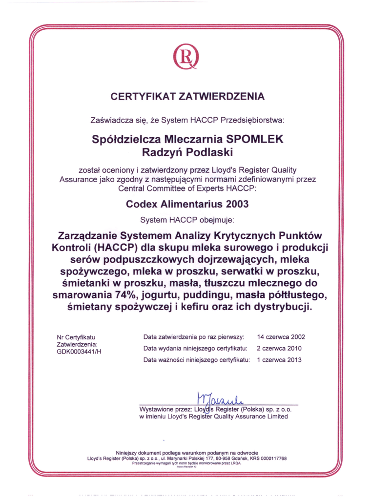 ® CERTYFIKAT ZATWIERDZENIA Zaświadcza się, że System HACCP Przedsiębiorstwa: Spółdzielcza Mleczarnia SPOMLEK Radzyń Podlaski został oceniony i zatwierdzony przez Lloyd's Register Quality Assurance jako zgodny z następującymi normami zdefiniowanymi przez Central Committee of Experts HACCP: Codex Alimentarius 2003 System HACCP obejmuje: Zarządzanie Systemem Analizy Krytycznych Punktów Kontroli (HACCP) dla skupu mleka surowego i produkcji serów podpuszczkowych dojrzewających, mleka spożywczego, mleka w proszku, serwatki w proszku, śmietanki w proszku, masła, tłuszczu mlecznego do smarowania 74%, jogurtu, puddingu, masła półtłustego, śmietany spożywczej i kefiru oraz ich dystrybucji. Nr Certyfikatu Zatwierdzenia: GDK0003441/H Data zatwierdzenia po raz pierwszy: 14 czerwca 2002 Data wydania niniejszego certyfikatu: 2 czerwca 2010 Data ważności niniejszego certyfikatu: 1 czerwca 2013 Wystawione przez: L10 s Register (polska) sp. z 0.0. w imieniu L1oyd'sRegister Quality Assurance Limited Niniejszy dokument podlega warunkom podanym na odwrocie 1I0yd's Register (polska) sp. z 0.0., ul. Marynarki Polskiej 177, 80-958 Gdańsk, KRS 0000117768 Przestrzeganoe wymagań tycll norm będzie montlOra.vane przez lRQA MK1o"-ł'AIGtIll