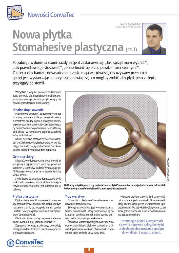 Nowości ConvaTec Marcin Andryszczak pracuje w Dziale Pomocy ConvaTec Nowa płytka Stomahesive plastyczna (cz. I) Po zabiegu wyłonienia stomii każdy pacjent zastanawia się: „Jaki sprzęt mam wybrać?”, „Jak prawidłowo go stosować?”, „Jak uchronić się przed powikłaniami skórnymi?”. Z kolei osoby bardziej doświadczone często mają wątpliwości, czy używany przez nich sprzęt jest wystarczająco dobry i zastanawiają się, co mogliby zrobić, aby płytki jeszcze lepiej przylegały do stomii. Wszystkie osoby ze stomią w codziennym życiu borykają się z podobnymi problemami, gdyż stosowany przez nich sprzęt stomijny nie zawsze jest właściwie dopasowany. Idealne dopasowanie Prawidłowo dobrany i dopasowany sprzęt stomijny powinien ściśle przylegać do skóry, a przestrzeń między stomią a krawędzią otworu w płytce stomijnej powinna być jak najmniejsza, by nie dochodziło do podciekania treści jelitowej pod płytkę i w następstwie tego do zapalenia skóry wokół stomii. Nawet niewielka przerwa wystarczy czasami, aby treść jelitowa zetknęła się ze skórą, w wyniku czego dochodzi do jej podrażnienia. To z kolei bardzo często bywa powodem zapalenia. Niewłaściwe dopasowanie płytki stomijnej jest jedną z najczęstszych przyczyn powikłań skórnych u stomików. Badania wykazały, że ok. 45% pacjentów uskarża się na zapalenie skóry wokół stomii. Stwierdzono, że właściwe dopasowanie płytki do kształtu i wielkości stomii istotnie zmniejsza ryzyko uszkodzenia skóry i jest kluczowe dla jej ochrony. Płytka plastyczna Płytka plastyczna Stomahesive to najnowszy produkt firmy ConvaTec dla osób z każdym rodzajem stomii, bez względu na jej rozmiar i kształt. Dostępna jest w systemie dwuczęściowym Combihesive 2S. Otula szczelnie stomię i zapewnia idealne dopasowanie do jej kształtu i wielkości. Zapewnia to lepszą ochronę, powoduje mniej powikłań skórnych i zapewnia poczucie bezpieczeństwa. FOT. ARCHIWUM CONVATEC Ochrona skóry Delikatny, miękki i plastyczny materiał nowej płytki Stomahesive łatwo jest uformować palcami tak, by idealnie pasował do wielkości i kształtu posiadanej stomii. Trzy warstwy Nowe płytki plastyczne Stomahesive są zbudowane z trzech warstw. Zewnętrzna warstwa jest wykonana z materiału Durahesive®, który dopasowuje się do kształtu i wielkości stomii, dzięki czemu skutecznie chroni przed podciekaniem. Środkowa warstwa polietylenowa zapewnia elastyczność i dzięki efektowi pamięci umożliwia dopasowanie wielkości otworu do kształtu stomii, który zmienia się w ciągu dnia. 18 Warstwa przylepna płytki (od strony skóry) wykonana jest z materiału Stomahesive®, który chroni skórę przed uszkodzeniem i podrażnieniami. Ma też właściwości gojące, co jest szczególnie ważne dla osób z podrażnieniami lub zapaleniem skóry. Technologia płytek plastycznych ConvaTec pozwoli odkryć korzyści z idealnego dopasowania sprzętu do wielkości i kształtu stomii. Nowe płytki plastyczne Stomahesive oferują wiele korzyści: Właściwości gojące – płytki plastyczne są wykonane z materiału Stomahesive®, który zapewnia skórze ochronę i wspomaga gojenie. Ochrona skóry – płytki plastyczne dokładnie dopasowują się do wielkości i kształtu stomii, co minimalizuje ryzyko kontaktu treści jelitowej lub moczu ze skórą. Idealne dopasowanie – płytki plastyczne stale dopasowują się do zmieniającej się w ciągu dnia wielkości stomii, dobrze do niej przylegają, zapewniając szczelność. Wygoda – płytki plastyczne są łatwe w użyciu i nie wymagają docinania nożyczkami. Uniwersalność – płytki plastyczne można stosować do zaopatrzenia praktycznie każdego rodzaju stomii. Higiena – płytki plastyczne ułatwiają wykonywanie zabiegów pielęgnacyjnych. Prostota użycia – łatwo się nauczyć, jak je stosować. Nowe płytki dostępne są w najpopularniejszym na rynku systemie dwuczęściowym Combihesive 2S, z którego korzysta z nich wiele osób. Polecane są one oczywiście także użytkownikom sprzętu jednoczęściowego. FOT. ARCHIWUM CONVATEC Stomia OKRĄGŁA Stomia OWALNA Płytka szczelnie otula stomię, co zapewnia mniej powikłań skórnych i daje poczucie bezpieczeństwa. ZEWNĘTRZNA WARSTWA płytki z materiału Durahesive® zapewnia idealne dopasowanie płytki do stomii i skutecznie chroni przed podciekaniem. ŚRODKOWA WARSTWA polietylenowa zapewnia elastyczność i dzięki efektowi pamięci poprawia dopasowanie płytki do wielkości stomii. WARSTWA PRZYLEPNA z materiału Stomahesive® przylega do skóry, chroniąc ją przed uszkodzeniem i podrażnieniami. Stomia NIEREGULARNA Za pomocą nowych płytek plastycznych Stomahesive można bez problemu zaopatrzyć stomie o różnym kształcie i wielkości. PLASTYCZNY MATERIAŁ PŁYTKI OTULA STOMIĘ PRZEZ CAŁY CZAS JEJ NOSZENIA, DOSTOSOWUJĄC SIĘ DO ZMIENIAJĄCEJ SIĘ W CIĄGU DNIA WIELKOŚCI STOMII. FOT. ARCHIWUM CONVATEC FOT. ARCHIWUM CONVATEC Korzyści Elastyczność materiału nowych płytek plastycznych pozwala na ich idealne dopasowanie się do zmieniającej się w ciągu dnia wielkości stomii. 19 Płytka plastyczna Stomahesive składa się z trzech warstw. Każda z nich pełni inną funkcję. Gdzie kupić? Płytki plastyczne Stomahesive są dostępne w sklepach medycznych współpracujących z firmą ConvaTec na terenie całego kraju. Ich lista oraz adresy są podane na str. 22 „Naszej Troski”. Cena płytek plastycznych Stomahesive jest atrakcyjna – identyczna jak płytek Stomahesive systemu Combihesive 2S. Wynosi 19,15 zł za sztukę. Płytki plastyczne Stomahesive wydawane są osobom ze stomią bezpłatnie w ramach obowiązujących limitów na sprzęt stomijny. Płytki plastyczne Stomahesive – dostępne rozmiary i ceny Rozmiar (w mm) Cena brutto (za 1 szt.) 45/13-22 mm 19,15 45/22-33 mm 19,15 57/33-45 mm 19,15 70/45-56 mm* 19,15 * największy rozmiar płytki plastycznej Stomahesive b