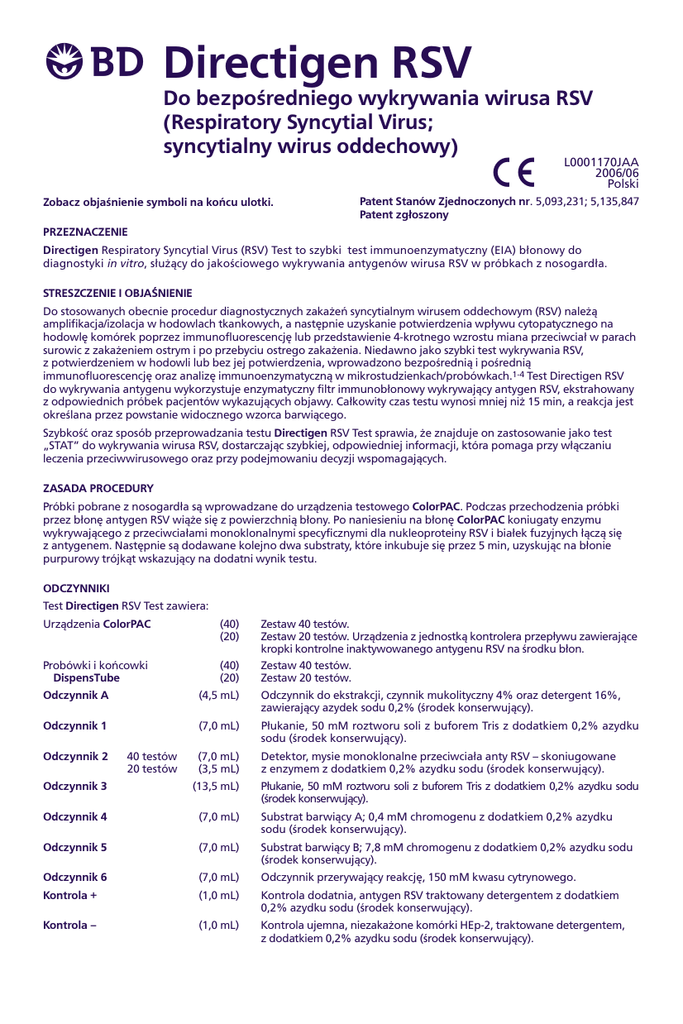 BDirectigen RSV Do bezporedniego wykrywania wirusa RSV (Respiratory Syncytial Virus; syncytialny wirus oddechowy) Zobacz objanienie symboli na koñcu ulotki. U L0001170JAA 2006/06 Polski Patent Stanów Zjednoczonych nr. 5,093,231; 5,135,847 Patent zg³oszony PRZEZNACZENIE Directigen Respiratory Syncytial Virus (RSV) Test to szybki test immunoenzymatyczny (EIA) b³onowy do diagnostyki in vitro, s³u¿¹cy do jakociowego wykrywania antygenów wirusa RSV w próbkach z nosogard³a. STRESZCZENIE I OBJANIENIE Do stosowanych obecnie procedur diagnostycznych zaka¿eñ syncytialnym wirusem oddechowym (RSV) nale¿¹ amplifikacja/izolacja w hodowlach tkankowych, a nastêpnie uzyskanie potwierdzenia wp³ywu cytopatycznego na hodowlê komórek poprzez immunofluorescencjê lub przedstawienie 4-krotnego wzrostu miana przeciwcia³ w parach surowic z zaka¿eniem ostrym i po przebyciu ostrego zaka¿enia. Niedawno jako szybki test wykrywania RSV, z potwierdzeniem w hodowli lub bez jej potwierdzenia, wprowadzono bezporedni¹ i poredni¹ immunofluorescencjê oraz analizê immunoenzymatyczn¹ w mikrostudzienkach/probówkach.1-4 Test Directigen RSV do wykrywania antygenu wykorzystuje enzymatyczny filtr immunob³onowy wykrywaj¹cy antygen RSV, ekstrahowany z odpowiednich próbek pacjentów wykazuj¹cych objawy. Ca³kowity czas testu wynosi mniej ni¿ 15 min, a reakcja jest okrelana przez powstanie widocznego wzorca barwi¹cego. Szybkoæ oraz sposób przeprowadzania testu Directigen RSV Test sprawia, ¿e znajduje on zastosowanie jako test STAT do wykrywania wirusa RSV, dostarczaj¹c szybkiej, odpowiedniej informacji, która pomaga przy w³¹czaniu leczenia przeciwwirusowego oraz przy podejmowaniu decyzji wspomagaj¹cych. ZASADA PROCEDURY Próbki pobrane z nosogard³a s¹ wprowadzane do urz¹dzenia testowego ColorPAC. Podczas przechodzenia próbki przez b³onê antygen RSV wi¹¿e siê z powierzchni¹ b³ony. Po naniesieniu na b³onê ColorPAC koniugaty enzymu wykrywaj¹cego z przeciwcia³ami monoklonalnymi specyficznymi dla nukleoproteiny RSV i bia³ek fuzyjnych ³¹cz¹ siê z antygenem. Nastêpnie s¹ dodawane kolejno dwa substraty, które inkubuje siê przez 5 min, uzyskuj¹c na b³onie purpurowy trójk¹t wskazuj¹cy na dodatni wynik testu. ODCZYNNIKI Test Directigen RSV Test zawiera: Urz¹dzenia ColorPAC (40) (20) Probówki i koñcowki DispensTube (40) (20) Zestaw 40 testów. Zestaw 20 testów. Urz¹dzenia z jednostk¹ kontrolera przep³ywu zawieraj¹ce kropki kontrolne inaktywowanego antygenu RSV na rodku b³on. Zestaw 40 testów. Zestaw 20 testów. Odczynnik A (4,5 mL) Odczynnik do ekstrakcji, czynnik mukolityczny 4% oraz detergent 16%, zawieraj¹cy azydek sodu 0,2% (rodek konserwuj¹cy). Odczynnik 1 (7,0 mL) P³ukanie, 50 mM roztworu soli z buforem Tris z dodatkiem 0,2% azydku sodu (rodek konserwuj¹cy). (7,0 mL) (3,5 mL) Detektor, mysie monoklonalne przeciwcia³a anty RSV skoniugowane z enzymem z dodatkiem 0,2% azydku sodu (rodek konserwuj¹cy). Odczynnik 2 40 testów 20 testów Odczynnik 3 (13,5 mL) P³ukanie, 50 mM roztworu soli z buforem Tris z dodatkiem 0,2% azydku sodu (rodek konserwuj¹cy). Odczynnik 4 (7,0 mL) Substrat barwi¹cy A; 0,4 mM chromogenu z dodatkiem 0,2% azydku sodu (rodek konserwuj¹cy). Odczynnik 5 (7,0 mL) Substrat barwi¹cy B; 7,8 mM chromogenu z dodatkiem 0,2% azydku sodu (rodek konserwuj¹cy). Odczynnik 6 (7,0 mL) Odczynnik przerywaj¹cy reakcjê, 150 mM kwasu cytrynowego. Kontrola + (1,0 mL) Kontrola dodatnia, antygen RSV traktowany detergentem z dodatkiem 0,2% azydku sodu (rodek konserwuj¹cy). Kontrola (1,0 mL) Kontrola ujemna, niezaka¿one komórki HEp-2, traktowane detergentem, z dodatkiem 0,2% azydku sodu (rodek konserwuj¹cy). Ostrze¿enia i rodki ostro¿noci: Do stosowania w diagnostyce in vitro. Odczynniki: Nie u¿ywaæ po up³ywie daty wa¿noci. NIE mieszaæ odczynników pochodz¹cych z partii o ró¿nych numerach ani nie zamieniaæ nakrêtek butelek z odczynnikami. Aby zakraplanie odbywa³o siê poprawnie, urz¹dzenia DispensTube oraz butelki z odczynnikami musz¹ byæ trzymane pionowo (w odleg³oci oko³o 2,5 cm od b³ony ColorPAC lub probówki), a krople powinny szybko spadaæ, jedna po drugiej. Odczynnik RSV Kontrola + oraz miejsce kontrolne b³ony ColorPAC zosta³y sporz¹dzone z komórek tkanek zainfekowanych wirusem RSV, które inaktywowano, a nastêpnie przetestowano, wykorzystuj¹c procedury biologiczne. Unikaæ kontaktu odczynników ze skór¹ i b³onami luzowymi. Jeli to nast¹pi, nale¿y sp³ukaæ te miejsca wod¹ i skontaktowaæ siê z lekarzem. Ostrze¿enie: Odczynniki zawieraj¹ azydek sodu. rodek ten jest bardzo toksyczny w razie inhalacji, kontaktu ze skór¹ lub w razie po³kniêcia. Przy kontakcie z kwasami uwalnia silnie toksyczny gaz. Jeli dojdzie do kontaktu ze skór¹, natychmiast sp³ukaæ du¿¹ iloci¹ wody. Azydek sodu mo¿e reagowaæ z o³owiem i miedzi¹ wystêpuj¹cymi w instalacjach kanalizacyjnych, w wyniku czego mog¹ powstaæ silnie wybuchowe azydki metali. Po wylaniu przep³ukaæ du¿¹ iloci¹ wody, aby zapobiec gromadzeniu siê azydku. Waciki: Do pobierania wymazów nosowo-gard³owych (NPS) s¹ zalecane waciki poliestrowe lub z koñcówk¹ ze sztucznego jedwabiu na drucie aluminiowym. Podczas stosowania Directigen RSV Test nie s¹ zalecane waciki z alginiatu wapniowego. Kontrole: Nie stosowaæ zestawu, je¿eli odczynniki Kontrola + i Kontrola nie daj¹ odpowiednich wyników. Urz¹dzenie ColorPAC: Bezporednie przed u¿yciem wyj¹æ urz¹dzenie (z kontrolerem przep³ywu) z foliowej torebki. Przechowywanie: Przechowywaæ w temperaturze (15-30°C) lub w ch³odziarce. NIE ZAMRA¯AÆ. POBIERANIE PRÓBEK I OBCHODZENIE SIÊ Z NIMI Patrz ilustracja, str. 8. wie¿e próbki nale¿y przetransportowaæ do laboratorium w odpowiednim p³ynnym systemie transportowym najszybciej jak to mo¿liwe. Próbki mog¹ byæ przechowywane w temperaturze 2-8°C przez 48 h lub -20°C w okresie jednego tygodnia, zanim zostan¹ u¿yte do badania. Nie odwirowywaæ 