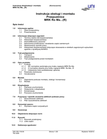 Instrukcja eksploatacji i montażu MRK Ro Ma...(R) (tłumaczenie) Instrukcja obsługi i montażu Przepustnice MRK Ro Ma...(R) Spis treści 1.0 Informacje ogólne 1.1 Dane przepustnicy 1.2 Przeznaczenie 2.0 Informacje dotyczące zagrożeń 2.1 Terminy istotne dla bezpieczeństwa 2.2 Wskazówki bezpieczeństwa 2.3 Wykwalifikowany personel 2.4 Samowolna przebudowa i dorabianie części zamiennych 2.5 Niedozwolony sposób pracy 2.6 Wskazówki bezpieczeństwa dotyczące stosowania w strefach zagrożonych wybuchem zgodnie z dyrektywą 94/9/EG 3.0 Tryb postępowania 3.1 Transport 3.2 Składowanie 3.3 Tryb postępowania przed montażem 4.0 Opis produktu 4.1 Funkcja 4.1.1 NC normalnie zamknięta przy braku napięcia MRK Ro Ma 4.1.2 O normalnie otwarta przy braku napięcia MRK Ro Ma...R 4.1.3 Ustawienie ilości podstawowej i głównej 4.2 Parametry techniczne 4.3 Oznakowanie 5.0 Montaż 5.1 Zagrożenia podczas montażu, obsługi i konserwacji 5.2 Montaż 6.0 Eksploatacja 6.1 Pierwsze uruchomienie 6.2 Wyłączenie z eksploatacji 6.3 Konserwacja 6.4 Ponowne uruchomienie 7.0 Przyczyny i sposób usuwania zakłóceń podczas pracy 7.1 Wyszukiwanie zakłóceń 7.2 Plan wyszukiwania zakłóceń 8.0 Demontaż zaworu 8.1 Wymiana części zużywalnych 9.0 Gwarancja 10.0 Objaśnienia dotyczące norm 11.0 Rysunki 11.1 Rysunek przekrojowy 11.2 Lista części 12.0 Deklaracja zgodności ________________________________________________________________________________________________________ 220.100.118-04 TM 3309 Strona 1 /20 Wydanie 10/2013 Instrukcja eksploatacji i montażu MRK Ro Ma...(R) (tłumaczenie) 1.0 Informacje ogólne Niniejsza instrukcja obsługi zawiera informacje na temat bezpiecznego, przepisowego montażu i eksploatacji przepustnicy. Dodatkowo przestrzegać instrukcji obsługi napędu elektromagnetycznego. Seria MG... Seria MG...X Seria MG…Xme 220.100.119 220.100.040 GB 220.100.039 GB Dalsze informacje na temat problemów, których usunięcie za pomocą instrukcji jest niemożliwe, można uzyskać u producenta. Jeśli zawór będzie stosowany poza obszarem RFN, użytkownik bądź osoba odpowiedzialna za rozplanowanie instalacji musi przestrzegać norm obowiązujących w kraju zastosowania. Producent zastrzega sobie wszelkie prawa do zmian technicznych i modyfikacji. Użytkownik korzystający z niniejszej instrukcji musi posiadać stosowane kwalifikacje zgodne z punktem 2.3 „Wykwalifikowany personel“. Personel obsługi należy przeszkolić zgodnie z niniejszą instrukcją. Instrukcja eksploatacji musi być zawsze dostępna w miejscu stosowania instalacji. 1.1 Parametry zaworu Producent: UNI Geräte E. Mangelmann Elektrotechnische Fabrik GmbH Holtumsweg 13 D-47652 Weeze Telefon: +49 (0) 2837/9134-0 Fax: +49 (0) 2837/1444 E-mail: [email protected] Homepage: www.uni-geraete.de Nazwa Urządzenie nastawcze do regulacji bez zamknięcia zerowego Podstawa kontroli: Typ: Certyfikat badania typu WEo wg 90/396/EWG nr ID prod. CE-0085-AR0408 DIN 3394-1 klasa RO DIN 3391 MRK Ro Ma MRK Ma..Ü200 Ciśnienie robocze 0 – 150mbar 0 – 150mbar Temperatura otoczenia -20°C do +60°C -20°C do +60°C MRK Ma..Ü550 MRK Ma..Ü700 MRK Ma..Ü1000 0 – 150mbar 0 – 150mbar 0 – 150mbar -20°C do +60°C -20°C do +60°C -20°C do +60°C Medium Gazy rodziny 1,2,3 i powietrze Gorące powietrze / Neutralne gazy Spaliny / gorące powietrze Spaliny / gorące powietrze Spaliny Temperatura medium -20°C do +60°C -20°C do +200°C do 550°C do 700°C do 1000°C Wykonanie: Talerze przepustnicy przebiciowe Talerze przepustnicy uderzeniowe Specjalne talerze regulacyjne W przypadku wykonania uderzeniowego do oznaczenia typu dołącza się „-2“ np. MRK Ro Ma ...N-4-2 Położenie montażowe: Poziomy przewód rurowy stojący napęd ± 5°; z dodatkowym symbolem „W“ pionowy przewód rurowy stojący napęd ± 5°. Cykle łączeniowe: patrz Instrukcja obsługi (BTA), dysk magnetyczny ________________________________________________________________________________________________________ 220.100.118-04 TM 3309 Strona 2 /20 Wydanie 10/2013 Instrukcja eksploatacji i montażu MRK Ro Ma...(R) (tłumaczenie) Montaż między dwoma kołnierzami wg DIN EN 1092-2 / ANSI Typ Nr ident. prod. 15 20 25 32 40 50 65 80 (5N) (7N) (10N) (12N) (15N) (20N) (25N) (30N) MRK Ro Ma CE-0085-AR0408 X X X X X X X X MRK Ma..Ü200 X X X X X X X X MRK Ma..Ü550 X X X X X X X X MRK Ma..Ü700 X X X X X X X X MRK Ma..Ü1000 X X X X X X X X Typ Nr ident. prod. MRK Ro Ma CE-0085-AR0408 MRK Ma..Ü200 MRK Ma..Ü550 MRK Ma..Ü700 MRK Ma..Ü1000 (*) DN 200 do DN 400 na zapytanie Napięcie zasilające: Rodzaj ochrony: Częstotliwość Moc 100 X X X X X 125 X X X X X 150 X X X X X 200 X X X X (*) 250 X X X X (*) 300 X X X X (*) 350 X X X X (*) 400 X X X X (*) VDC 12 – 440 (–15% bis +10%) VAC 24 – 500 (–15% bis +10%) IP54 lub IP65 40 – 60 Hz 10 – 4000 W Szczegółowe parametry elektryczne są podane na tabliczce identyfikacyjnej i w instrukcji napędu elektromagnetycznego. 1.2 Przeznaczenie Przepustnice MRK firmy UNI-Geräte są stosowane jako urządzenia nastawcze do regulacji w całej technice piecowej. Przepustnice nadają się do gazów rodziny 1, 2 oraz 3. wg G260 oraz do gazów neutralnych i powietrza. Jako wariant z wykonaniem z tworzywa sztucznego dla gorącego powietrza, spalin i gazów agresywnych jak np. biogaz, gaz z oczyszczalni i gaz wysypiskowy wg G262. W przypadku innych parametrów eksploatacyjnych użytkownik musi dokładnie sprawdzić, czy typ przepustnic, osprzętu i materiału jest odpowiedni dla nowego zakresu zastosowania. Za zakres stosowania przepustnic odpowiada osoba zajmująca się planowaniem instalacji. Okres użytkowania przepustnic wynosi 20 lat. 2.0 Informacje dotyczące zagrożeń 2.1 Terminy istotne dla bezpieczeństwa Hasła ZAGROŻENIE, OSTROŻNIE i WSKAZÓWKA podane w niniejszej instrukcji odnoszą się do szczególnych zagrożeń lub nietypowych informacji wymagających specjalnego oznaczenia. ZAGROŻENIE! zlekce