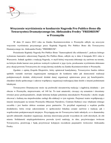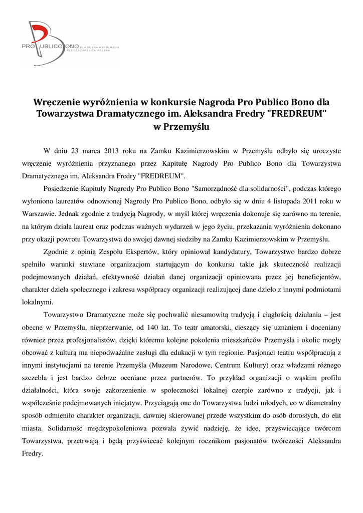 Wręczenie wyróżnienia w konkursie Nagroda Pro Publico Bono dla Towarzystwa Dramatycznego im. Aleksandra Fredry "FREDREUM" w Przemyślu W dniu 23 marca 2013 roku na Zamku Kazimierzowskim w Przemyślu odbyło się uroczyste wręczenie wyróżnienia przyznanego przez Kapitułę Nagrody Pro Publico Bono dla Towarzystwa Dramatycznego im. Aleksandra Fredry "FREDREUM". Posiedzenie Kapituły Nagrody Pro Publico Bono "Samorządność dla solidarności", podczas którego wyłoniono laureatów odnowionej Nagrody Pro Publico Bono, odbyło się w dniu 4 listopada 2011 roku w Warszawie. Jednak zgodnie z tradycją Nagrody, w myśl której wręczenia dokonuje się zarówno na terenie, na którym działa laureat oraz podczas ważnych wydarzeń w jego życiu, przekazania wyróżnienia dokonano przy okazji powrotu Towarzystwa do swojej dawnej siedziby na Zamku Kazimierzowskim w Przemyślu. Zgodnie z opinią Zespołu Ekspertów, który opiniował kandydatury, Towarzystwo bardzo dobrze spełniło warunki stawiane organizacjom startującym do konkursu takie jak skuteczność realizacji podejmowanych działań, efektywność działań danej organizacji opiniowana przez jej beneficjentów, charakter dzieła społecznego i zakresu współpracy organizacji realizującej dane dzieło z innymi podmiotami lokalnymi. Towarzystwo Dramatyczne może się pochwalić niesamowitą tradycją i ciągłością działania – jest obecne w Przemyślu, nieprzerwanie, od 140 lat. To teatr amatorski, cieszący się uznaniem i doceniany również przez profesjonalistów, dzięki któremu kolejne pokolenia mieszkańców Przemyśla i okolic mogły obcować z kulturą ma niepodważalne zasługi dla edukacji w tym regionie. Pasjonaci teatru współpracują z innymi instytucjami na terenie Przemyśla (Muzeum Narodowe, Centrum Kultury) oraz władzami różnego szczebla i jest bardzo dobrze oceniane przez partnerów. To przykład organizacji o wąskim profilu działalności, która swoje zakorzenienie w społeczności lokalnej czerpie zarówno z tradycji, jak i współcześnie podejmowanych inicjatyw. Przyciągają one do Towarzystwa ludzi młodych, co w diametralny sposób odmieniło charakter organizacji, dawniej skierowanej przede wszystkim do osób dorosłych, do elit miasta. Solidarność międzypokoleniowa pozwala żywić nadzieję, że idee, przyświecające twórcom Towarzystwa, przetrwają i będą przyświecać kolejnym rocznikom pasjonatów twórczości Aleksandra Fredry. Wręczenia wyróżnienia dokonali przedstawiciele Fundacji Konkurs Pro Publico Bono. Tomasz Wasielewski – członek Kolegium Ekspertów dokonał wprowadzenia, po czym głos zabrał Waldemar Rataj wiceprzewodniczący Kapituły Nagrody Konkursu. Wyróżnienie przekazano na ręce Prezes Zarządu Towarzystwa, Pani Krystyny Maresch – Knapek. Głos zabrała również Pani Łucja Bielec – Prezes Fundacji SOS Życie z Mielca, która była laureatem w konkursie o Nagrodę Dwudziestolecia Odrodzenia Niepodległej Polski Pro Publico Bono. Pani Łucja Bielec m.in. podkreśliła rolę wzmacniania więzi i współpracy pomiędzy organizacjami obywatelskimi - laureatami nagrody zwłaszcza działających na jednym terenie, w tym przypadku na Podkarpaciu. Uroczystość odbyła się w nowo wyremontowanej sali teatru przy pełnej widowni. Głównym wydarzeniem wieczoru, na który przybyli goście były wystawiane dwie jednoaktówki Czechowa: „Oświadczyny” i premierowo „Niedźwiedź” w reżyserii Krystyny Maresch – Kanpek. Tomasz Wasielewski