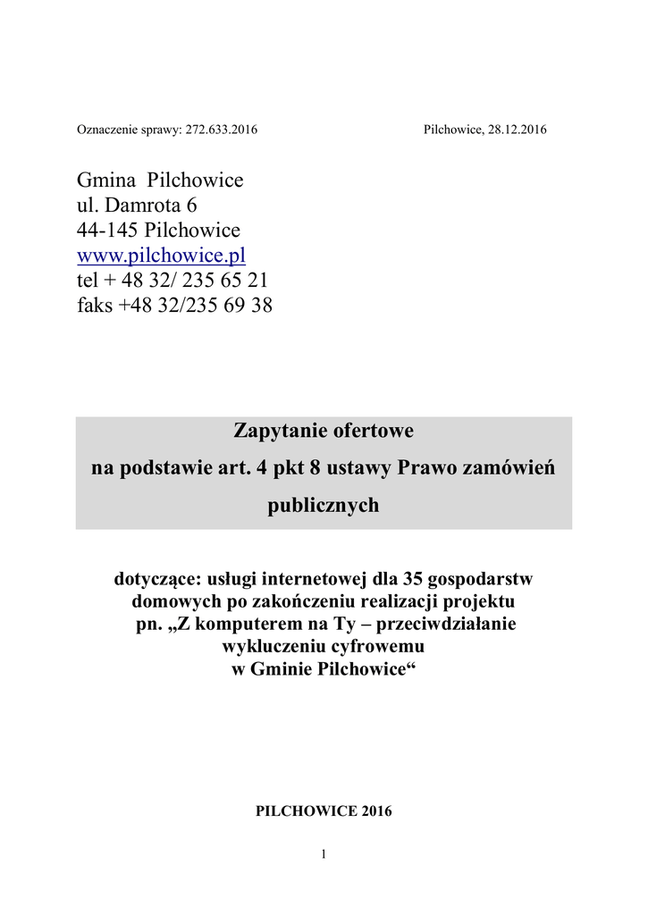 Oznaczenie sprawy: 272.633.2016 Pilchowice, 28.12.2016 Gmina Pilchowice ul. Damrota 6 44-145 Pilchowice www.pilchowice.pl tel + 48 32/ 235 65 21 faks +48 32/235 69 38 Zapytanie ofertowe na podstawie art. 4 pkt 8 ustawy Prawo zamówień publicznych dotyczące: usługi internetowej dla 35 gospodarstw domowych po zakończeniu realizacji projektu pn. „Z komputerem na Ty – przeciwdziałanie wykluczeniu cyfrowemu w Gminie Pilchowice“ PILCHOWICE 2016 1 Nazwa nadana zapytaniu ofertowemu przez zamawiającego: Usługa internetowa dla 35 gospodarstw domowych po zakończeniu realizacji projektu „Z komputerem na TY – przeciwdziałanie wykluczeniu cyfrowemu w Gminie Pilchowice” 1. Zamawiający - nazwa i adres Gmina Pilchowice reprezentowana przez Macieja Gogullę – Wójta Gminy Pilchowice z siedzibą mieszczącą się w Urzędzie Gminy Pilchowice ul. Damrota 6, 44-145 Pilchowice www.pilchowice.pl tel + 48 32/ 235 65 21 faks +48 32/235 69 38 2. Tryb udzielenia zamówienia Zapytanie ofertowe na podstawie art. 4 pkt 8 ustawy z dnia 29 stycznia 2004 r. - Prawo zamówień publicznych (t. j. Dz. U. z 2015 r., poz. 2164 z późn. zm.) zwanej dalej „ustawą pzp”. 3. Opis przedmiotu zamówienia 1) przedmiotem zamówienia jest usługa. 2) kod i nazwa wg Wspólnego Słownika Zamówień (CPV): główny przedmiot: kod CPV: 72400000-4 Usługi internetowe Przedmiotem zapytania jest zakup usługi internetowej po zakończeniu realizacji projektu „Z komputerem na TY – przeciwdziałanie wykluczeniu cyfrowemu w Gminie Pilchowice”. 3) Przedmiot zamówienia: Przedmiot zamówienia obejmuje: a) zestawienie, uruchomienie i udostępnianie przez całą dobę (24 godziny) przez wszystkie dni w trakcie trwania umowy łącza dostępowego do Internetu o następujących parametrach: minimalna średnia prędkość pobierania danych: 8 Mb/s minimalna średnia prędkość wysyłania danych: 1 Mb/s stały publiczny adres IP całkowicie darmowy montaż i instalacja przyłącza internetowego dla 35 gospodarstw domowych gminy Pilchowice zgodnie z poniższą tabelą 2 b) c) d) e) dopuszczalna wykorzystywana technologia przyłącza internetowego: WiFi 5GHz, Ethernet 100Mb/s, xDSL, FTTH; czas reakcji na zgłoszenie awarii i czasu naprawy nie dłuższy niż 24 godziny 7 dni w tygodniu (wyłączając święta i dni wolne od pracy). Zgłoszenia awarii będą przekazywane drogą poczty elektronicznej na czynny i nadzorowany przez całą dobę adres email Wykonawcy. W przypadku niemożności złożenia zgłoszenia drogą elektroniczną zgłoszenie awarii powinno być przekazane SMS-em na czynny i nadzorowany przez całą dobę numer telefonu komórkowego podany przez Wykonawcę. Dopuszczalny czas całkowitego usunięcia pojedynczej awarii od momentu zgłoszenia nie może być dłuższy niż 12 godzin, a dopuszczalny łączny czas niedostępności usługi w ciągu okresu realizacji umowy nie dłuższy niż 48 godzin (za wyjątkiem zdarzeń losowych); dostęp do wszystkich usług i serwisów internetowych krajowych i zagranicznych; nielimitowaną ilość sesji oraz przesyłanych danych; dostawę i instalację urządzeń odbiorczych z funkcją routera/AP na koszt dostawcy Internetu (model: Tp-Link TL-WR841N lub równoważny*) w gospodarstwach domowych Gminy Pilchowice zgodnie z poniższą tabelą. * równoważność urządzenia: CECHY SPRZĘTU (minimum): Porty: 4 porty LAN 10/100Mb/s 1 port WAN 10/100Mb/s Przyciski: Przycisk WPS/Reset Wyłącznik zasilania Przycisk Wi-Fi On/Off Zasilanie: 9VDC/0,6A Standardy bezprzewodowe: IEEE 802.11n, IEEE 802.11g, IEEE 802.11b Antena: 2*5dBi, zintegrowana, dookólna WŁAŚCIWOŚCI TRANSMISJI BEZPRZEWODOWEJ Częstotliwość pracy: 2,4-2,4835GHz Prędkość transmisji: 11n: do 300Mb/s (dynamicznie) 11g: do 54Mb/s (dynamicznie) 11b: do 11Mb/s (dynamicznie) Czułość odbiornika: 270M: -68dBm@10% PER 130M: -68dBm@10% PER 108M: -68dBm@10% PER 54M: -68dBm@10% PER 11M: -85dBm@8% PER 6M: -88dBm@10% PER 1M: -90dBm@8% PER EIRP<20dBm (EIRP) Funkcje transmisji bezprzewodowej: 3 Włączanie/wyłączanie transmisji bezprzewodowej, most WDS, WMM, statystyki transmisji bezprzewodowej Bezpieczeństwo transmisji bezprzewodowej: 64/128/152-bit WEP / WPA / WPA2,WPA-PSK / WPA2-PSK Urządzenia bezprzewodowe: 64/128/152 bitowe szyfrowanie WEP / WPA / WPA2,WPA-PSK / WPA2-PSK FUNKCJE OPROGRAMOWNIA Typ połączenia WAN: Dynamic IP/Static IP/PPPoE/ PPTP/L2TP/BigPond DHCP: Serwer/klient DHCP, lista klientów DHCP, Rezerwacja adresów Funkcja Quality of Service: WMM, Kontrola przepustowości Przekierowanie portów: Serwery wirtualne, Port Triggering, UPnP, DMZ Dynamiczny DNS: DynDns, Comexe, NO-IP VPN Pass-Through: PPTP, L2TP, IPSec (ESP Head) Kontrola dostępu: Kontrola rodzicielska, kontrola dostępu do panelu zarządzania, lista hostów, harmonogram dostępu, zarządzanie regułami Zabezpieczenia zapory sieciowej: Ochrona przed atakami DoS, zapora sieciowa SPI, filtrowanie domen, adresów IP i MAC, wiązanie adresów IP i MAC Zarządzanie: Kontrola dostępu, zarządzanie siecią lokalną, zdalne zarządzanie. Gospodarstwa domowe w zapytaniu ofertowym: Lp. 1. 2. 3. (lokalizacja), których dotyczy usługa Ulica1 Sołectwo Pilchowice Wilcza Żernica internetowa opisana Ilość gospodarstw domowych ul. Dolna Wieś ul. Gliwicka ul. Wielopole ul. Gwarków ul. Trześniówka ul. Dworcowa 1 1 1 1 1 1 ul. Gliwicka ul. Grzonki ul. Rybnicka ul. Karola Miarki ul. Stawowa 1 1 3 2 2 ul. 1-go Maja ul. Górnicza ul. Nieborowska ul. Ogrodowa 2 2 1 1 Dokładne adresy zostaną podane wykonawcy z dniem podpisania umowy ze względu na ochronę danych osobowych. Zamawiający zastrzega sobie zmianę lokalizacji sprzętu komputerowego wraz z oprogramowaniem w Gminie Pilchowice. 1 4 4. Stanica ul. 1-go Maja ul. Lipowa ul. Gliwicka ul. Dworcowa ul. Górnicza ul. Powstańców 5. Nieborowice ul. Mysia Góra 1 6. Leboszowice ul. Gajowa ul. Wiejska 1 2 ul. Rybnicka ul. Knurowska 1 2 7. Kuźnia Nieborowska 1 2 1 1 1 1 4. Termin realizacji umowy i 