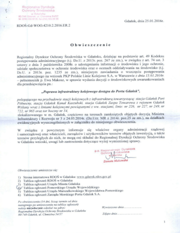 ^ Regionalna Dyrekcja Ochrony Srodowiska W (058) 533 68 OC, fa* (056; 683 60 03 . . , Gdansk, dnia 25.01.2016r. RDOS-Gd-WOO.4210.2.2016.ER.2 Obwieszczenie Regionalny Dyrektor Ochrony Srodowiska w Gdarisku. dzialaj^c na podstawie art. 49 Kodeksu posl^powania adminislracyjnego (t.j. Dz.U. z 2013r. poz. 267 ze zm.). w zwi^zku z art. 74 ust. 3 ustawy z dnia 3 pazdziemika 2008r. o udost^pnianiu informacji o srodowisku i jego ochronie, udziale spoleczeiistwa w ochronie srodowiska oraz o ocenach oddzialywania na ^rodowisko (t.j. Dz.U. z 2013r. poz. 1235 ze zm.), niniejszym zawiadamia o wszcz^ciu post^powania adminislracyjnego na wniosek PKP Polskie Linie Kolejowe S.A. w Warszawie z dnia 15.0l.2016r. - pelnomocnik p. Ewa Makosz. w sprawie wydania decyzji o srodowiskowych uwarunkowaniach dla przedsi?wzi^cia pn.: „Poprawa infrastruktury kolejowego dost^pu do Portu Gdansk", polegajqcego na przebudome slacji kolejowych z infraslruklurq fowarzyszqcq: slacja Gdansk Port Polnocny, stacja Gdansk Kanal Kaszubski. slacja Gdansk Zaspa Towarowa z rejonem Gdansk Wislany wraz z liniami kolejowymi powiqzanymi z M M: siacjami. linie: nr 226. nr 227, nr 249. nr 722. nr 965 oraz tor boczny nr 54, zlokalizowanego w m. Gdansk, c z ^ i o w o na terenach zamkni^tych obj?tych decyzji Ministra Infrastruktury i Rozwoju nr 3 z 24.03.20I4r. (Dz.Urz. MR z 2014r. poz.25 ze zm.). na dzialkach ewidencyjnych wyszczeg6Inionych w zalqczniku do niniejszego obwieszczenia. W z w ' i ^ u z powyzszym informuje si? wlasciwe organy administracji rzqdowej i samorz^dowej oraz wlascicieli. zarz^dcow i uzytkownikow terenow obj^tych inwestycj^, a takze terenow przyleglych do nich. tQ mogqoni skladac do Regionalnej Dyrekcji Ochrony Srodowiska w Gdahsku wnioski. uwagi lub zastrzezenia dotycz^e wyzej wymienionej sprawy. p o . Reqionalnego Dyrektora Danuia Mukowska Obwieszczenie umieszcza si^: 1) Strona intemetowa REXDS w Gdarisku: www.gdansk.rdos.sov.pl 2) Tablica ogloszeri RDOS w Gdarisku 3) Tablica ogloszeri Urz^du Miasia Gdariska I ablica ogloszeri Pomorskiego Urz^du Wojew6dzkiego 5) Tablica ogloszeri Urz^du Marszalkowskiego Wojewodztwa Pomorskiego 6) Tablica ogloszeri Zarz^du .Morskiego Portu Gdarisk S.A. Po obwieszczeniu (14 dni. liczqc term in od dnia nasiyjnego po umieszczeniu na lablicy ogloszen) naleiy niezwiocznie odeslac na adres: Regionalna Dyrekcja Ochrony Srodowiska w Gdansku 80-748 Gdansk, ul. Chmielna 54/57 Wywieszono dnia. Zdj^lo dnia Zali|cznik do obwieszczenia RDOS-Gd-W00.4210.2.2016.ER.2 Wykaz dziaiek inwestycyjnych, na ktory ch przewid>'>\'ana jest realizacja przedsi^wzi^cia, Gmina: M . Gdansk obr^b 44: 1052,1051. 1054. 1050. 994/2, 704/2,1258/2. 1258/1. 707/3, 706/2,698/6,45/15, obrfb 45: 1/2 , 240. 299/2, 286. 287,276, 277. 300, 536/1, 536/2, 534, 535, 507. o b r f b 46: 39,40, 65. 50/1,67, 94/2,69, 68/2. o b r f b 56: 267/11. 267/3,277/16,272,268/4. 260/7. 260/12. 260/8, 261/4,260/1. 261/1, 283/3, 262/1, o b r f b 57: 37. 38, 39,40. 41, 75,46, 63, 87, 72. 88. 71/4, o b r f b 58: 357/1, 359/7,228. 198, 202. 208, 229, 230, 231, 248. 227,292, 226, 215, 211. 225, 224, 223, 222, 251/1,221, 220, 219,218, obrfb 59: I03''24, 103/15, 91. 10/5, 1/2 , obrfb 62: 65, 66,64,48,47/2,39,41,44/1,44/2,29/2, 30/1,30/2, 42. 27, 28, obrfb 70: 123, 72, 70, 71. 65. 66, 67, 5,4, o b r f b 71: 34.26,33,9, 10, o b r f b 72: 50, 51,49,29/1, 29/2,27/1, 27/4, 27/3, 52/1, 53/1, 20, 21/2, 21/1,21/4, 21/3,23/1, 23/3, 35/2,44, 41,40, 39, 38, 52/2, 53/2, 54,43/2, 43/3,43/4,42/3, 42/1,42/2, 22, 45, 7,10,9,2,3,4, o b r f b 73: 44, 16, 17, 18, 19, 55, 53, obrfb 80: 267, 266/3. 10. o b r f b 82: 39,26/1, 27,28, 33, 21, 23,22,2/2,2/3,2/4,2/5, 1/3,1/6, 6/1,6/2,7, 10,9/1,9/2. 8. 1/5, o b r f b 83: 70/3, 70/1. 70/4, 75/1, 75/2, 54,64,65, 53, 38,39, 30, 10/10, 14. 15. 21. 22, 5,4/1. 72. o b r f b 86: 48.49/3, obrfb 92: 85. 84,47/16,47/15,46,45,41, 38. 37, 36,42,44, 31/51, 31/4,4/2, 4/3,6/9, 7/1, 7/2, 8/1. 1.2.3. o b r f b 250: 47,23/1, o b r f b 251: 10. 11. 12, 9/1.9/2, 6/3. 6/7, o b r f b 252: 6/3, o b r f b 253: 2/2, 1/6, 1/7,2/6, 5/7, 5/5, o b r f b 275: 3/86. 3/14. 3/73, 3/78.