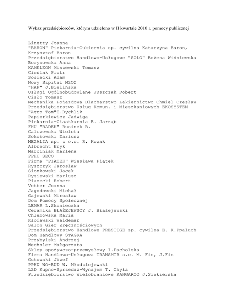 Wykaz przedsiębiorców, którym udzielono w II kwartale 2010 r. pomocy publicznej Linetty Joanna "BARON" Piekarnia-Cukiernia sp. cywilna Katarzyna Baron, Krzysztof Baron Przedsiębiorstwo Handlowo-Usługowe "SOLO" Bożena Wiśniewska Borysowska Anna KAMELEON Miszewski Tomasz Cieślak Piotr Sołdecki Adam Nowy Szpital NZOZ "HAP" J.Bielińska Usługi Ogólnobudowlane Juszczak Robert Cisło Tomasz Mechanika Pojazdowa Blacharstwo Lakiernictwo Chmiel Czesław Przedsiębiorstwo Usług Komun. i Mieszkaniowych EKOSYSTEM "Agro-Tom"T.Rychlik Papierkiewicz Jadwiga Piekarnia-Ciastkarnia B. Jarząb FHU "RADEK" Rusinek R. Galczewska Wioleta Sokołowski Dariusz MEZALIA sp. z o.o. R. Kozak Albrecht Eryk Marciniak Marlena PPHU SECO Firma "PIĄTEK" Wiesława Piątek Ryszczyk Jarosław Sionkowski Jacek Rysiewski Mariusz Piasecki Robert Vetter Joanna Jagodowski Michał Gajewski Mirosław Dom Pomocy Społecznej LEMAR L.Skonieczka Ceramika BŁAŻEJEWSCY J. Błażejewski Chlebowska Maria Kłodawski Waldemar Salon Gier Zręcznościowych Przedsiębiorstwo Handlowe PRESTIGE sp. cywilna E. K.Ppaluch Dom Handlowy STAGRA Przybylski Andrzej Wechsler Małgorzata Sklep spożywczo-przemysłowy I.Pacholska Firma Handlowo-Usługowa TRANSMIR s.c. M. Fic, J.Fic Gutowski Józef PPHU WO-BUD W. Młodziejewski LZD Kupno-Sprzedaż-Wynajem T. Chyła Przedsiębiorstwo Wielobranżowe KANGAROO J.Siekierska Przedsiębiorstwo Handlowo-Usługowe "RON" W.Ronowski