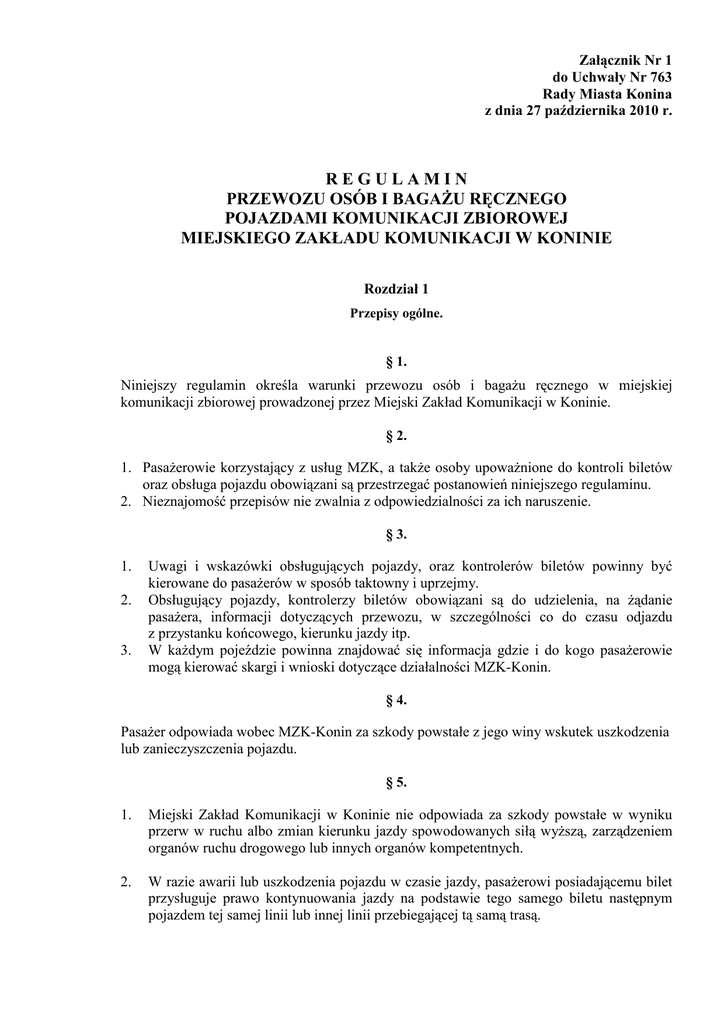 Załącznik Nr 1 do Uchwały Nr 763 Rady Miasta Konina z dnia 27 października 2010 r. REGULAMIN PRZEWOZU OSÓB I BAGAśU RĘCZNEGO POJAZDAMI KOMUNIKACJI ZBIOROWEJ MIEJSKIEGO ZAKŁADU KOMUNIKACJI W KONINIE Rozdział 1 Przepisy ogólne. § 1. Niniejszy regulamin określa warunki przewozu osób i bagaŜu ręcznego w miejskiej komunikacji zbiorowej prowadzonej przez Miejski Zakład Komunikacji w Koninie. § 2. 1. PasaŜerowie korzystający z usług MZK, a takŜe osoby upowaŜnione do kontroli biletów oraz obsługa pojazdu obowiązani są przestrzegać postanowień niniejszego regulaminu. 2. Nieznajomość przepisów nie zwalnia z odpowiedzialności za ich naruszenie. § 3. 1. 2. 3. Uwagi i wskazówki obsługujących pojazdy, oraz kontrolerów biletów powinny być kierowane do pasaŜerów w sposób taktowny i uprzejmy. Obsługujący pojazdy, kontrolerzy biletów obowiązani są do udzielenia, na Ŝądanie pasaŜera, informacji dotyczących przewozu, w szczególności co do czasu odjazdu z przystanku końcowego, kierunku jazdy itp. W kaŜdym pojeździe powinna znajdować się informacja gdzie i do kogo pasaŜerowie mogą kierować skargi i wnioski dotyczące działalności MZK-Konin. § 4. PasaŜer odpowiada wobec MZK-Konin za szkody powstałe z jego winy wskutek uszkodzenia lub zanieczyszczenia pojazdu. § 5. 1. Miejski Zakład Komunikacji w Koninie nie odpowiada za szkody powstałe w wyniku przerw w ruchu albo zmian kierunku jazdy spowodowanych siłą wyŜszą, zarządzeniem organów ruchu drogowego lub innych organów kompetentnych. 2. W razie awarii lub uszkodzenia pojazdu w czasie jazdy, pasaŜerowi posiadającemu bilet przysługuje prawo kontynuowania jazdy na podstawie tego samego biletu następnym pojazdem tej samej linii lub innej linii przebiegającej tą samą trasą. § 6. Znalazca rzeczy pozostawionej w pojeździe powinien przekazać tę rzecz obsłudze pojazdu za pokwitowaniem. § 7. 1. 2. 3. 4. 5. 6. PasaŜer zobowiązany jest posiadać waŜny bilet podczas przejazdu i okazywać go lub wręczać na Ŝądanie kontrolera biletów bądź innej osoby upowaŜnionej do kontroli przez MZK-Konin. Dokumentem uprawniającym do przejazdu są wyłącznie bilety z nadrukiem MZKKonin. Bilet stanowi dowód uiszczenia opłaty za przejazd jego posiadacza. Z chwilą skasowania go kasownikiem znajdującym się w danym pojeździe, zachowuje on waŜność do chwili opuszczenia tego pojazdu przez osobę, która uiściła za niego opłatę. PasaŜer zobowiązany jest do skasowania biletu natychmiast po wejściu do pojazdu przed zajęciem miejsca stojącego lub siedzącego. W przypadku przewozu bagaŜu podlegającego opłacie taryfowej obowiązuje skasowanie oddzielnego biletu za kaŜdą sztukę bagaŜu. MZK-Konin nie wydaje duplikatów biletów rocznych, miesięcznych i okresowych w przypadku ich utracenia bądź zniszczenia. Rozdział 2 Przewóz osób. § 8. Miejski Zakład Komunikacji w Koninie zobowiązany jest umieścić w pojazdach informacje o taryfie przewozowej, kategoriach osób uprawnionych do opłaty ulgowej i bezpłatnych przejazdów oraz wysokości opłaty dodatkowej za przejazd bez waŜnego biletu. § 9. 1. 2. 3. 4. 5. 6. Wsiadanie do pojazdu i wysiadanie z niego dozwolone jest tylko na przystankach i po całkowitym zatrzymaniu pojazdu. Wsiadanie do autobusu odbywa się przednimi drzwiami oznaczonymi napisem „wejście” za okazaniem kierowcy waŜnego biletu na przejazd, lub dokumentu uprawniającego do bezpłatnego przejazdu. Wysiadanie z autobusu odbywa się środkowymi drzwiami oznaczonymi napisem „wyjście”. Wsiadanie do autobusu osób niepełnosprawnych poruszających się na wózkach inwalidzkich, osób z dzieckiem w wózku odbywa się środkowymi drzwiami. Osoby te oczekują na przystanku w widocznym miejscu sygnalizując zamiar wejścia do autobusu przez podniesienie ręki. PasaŜerowie nie powinni utrudniać wejścia i wyjścia z pojazdu innym pasaŜerom. Wsiadanie do pojazdu na przystankach końcowych dozwolone jest dopiero po zakończeniu czynności związanych ze zmianą kierunku jazdy. W tym czasie pasaŜerowie nie mogą przebywać w pojeździe. Obsługujący pojazd, po zakończeniu czynności związanych ze zmianą kierunku jazdy, obowiązany jest niezwłocznie podjechać pojazdem do przystanku dla wsiadających w celu umoŜliwienia osobom oczekującym na przystanku zajęcie miejsca w pojeździe. § 10. PasaŜerowie stojący w czasie jazdy powinni trzymać się uchwytów lub poręczy. § 11. 1. 2. W przypadku stwierdzenia, Ŝe w autobusie znajduje się pasaŜer bez waŜnego biletu bądź dokumentu uprawniającego do bezpłatnego przejazdu, kierowca upowaŜniony jest do wstrzymania dalszej jazdy autobusu do czasu opuszczenia autobusu przez tego pasaŜera i jednocześnie kierowca powinien poinformować o tym pozostałych pasaŜerów a w razie potrzeby wezwać organy porządkowe. Sygnał odjazdu z przystanku daje obsługujący pojazd po uprzednim sprawdzeniu, Ŝe wszystkie osoby wsiadające są wewnątrz pojazdu, a wysiadające opuściły pojazd. § 12. 1. W pojazdach wyznaczone są odpowiednio oznakowane miejsca: a) dla osób z dzieckiem na ręku (dotyczy takŜe cięŜarnych), b) dla inwalidów. 2. PasaŜer, który zajmuje miejsce oznaczone „dla inwalidy” lub „dla osób z dzieckiem na ręku” obowiązany jest zwolnić to miejsce dla osób uprawnionych. § 13. W dni powszednie w godz. 1800 - 600 a soboty, niedziele i dni świąteczne przez całą dobę bilety moŜna nabywać u prowadzącego pojazd (kierowcy). Zakup biletu moŜe nastąpić wyłącznie na przystanku, na którym wsiada pasaŜer, za odliczoną kwotę. § 14. 1. 2. 3. 4. Przez obsługę autobusu, z pojazdu mogą zostać usunięte osoby: a) nietrzeźwe, zachowujące się agresywnie wobec współpasaŜerów i obsługi pojazdu, b) wzbudzające odrazę brudem i niechlujstwem, c) które z innych powodów są niebezpieczne lub uciąŜliwe a takŜe zachowujące się agresywnie w stosunku do pasaŜerów, ob