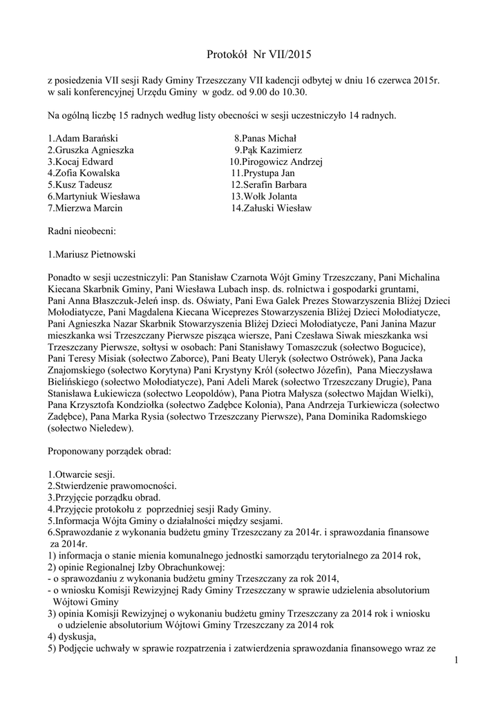 Protokół Nr VII/2015 z posiedzenia VII sesji Rady Gminy Trzeszczany VII kadencji odbytej w dniu 16 czerwca 2015r. w sali konferencyjnej Urzędu Gminy w godz. od 9.00 do 10.30. Na ogólną liczbę 15 radnych według listy obecności w sesji uczestniczyło 14 radnych. 1.Adam Barański 2.Gruszka Agnieszka 3.Kocaj Edward 4.Zofia Kowalska 5.Kusz Tadeusz 6.Martyniuk Wiesława 7.Mierzwa Marcin 8.Panas Michał 9.Pąk Kazimierz 10.Pirogowicz Andrzej 11.Prystupa Jan 12.Serafin Barbara 13.Wołk Jolanta 14.Załuski Wiesław Radni nieobecni: 1.Mariusz Pietnowski Ponadto w sesji uczestniczyli: Pan Stanisław Czarnota Wójt Gminy Trzeszczany, Pani Michalina Kiecana Skarbnik Gminy, Pani Wiesława Lubach insp. ds. rolnictwa i gospodarki gruntami, Pani Anna Błaszczuk-Jeleń insp. ds. Oświaty, Pani Ewa Galek Prezes Stowarzyszenia Bliżej Dzieci Mołodiatycze, Pani Magdalena Kiecana Wiceprezes Stowarzyszenia Bliżej Dzieci Mołodiatycze, Pani Agnieszka Nazar Skarbnik Stowarzyszenia Bliżej Dzieci Mołodiatycze, Pani Janina Mazur mieszkanka wsi Trzeszczany Pierwsze pisząca wiersze, Pani Czesława Siwak mieszkanka wsi Trzeszczany Pierwsze, sołtysi w osobach: Pani Stanisławy Tomaszczuk (sołectwo Bogucice), Pani Teresy Misiak (sołectwo Zaborce), Pani Beaty Uleryk (sołectwo Ostrówek), Pana Jacka Znajomskiego (sołectwo Korytyna) Pani Krystyny Król (sołectwo Józefin), Pana Mieczysława Bielińskiego (sołectwo Mołodiatycze), Pani Adeli Marek (sołectwo Trzeszczany Drugie), Pana Stanisława Łukiewicza (sołectwo Leopoldów), Pana Piotra Małysza (sołectwo Majdan Wielki), Pana Krzysztofa Kondziołka (sołectwo Zadębce Kolonia), Pana Andrzeja Turkiewicza (sołectwo Zadębce), Pana Marka Rysia (sołectwo Trzeszczany Pierwsze), Pana Dominika Radomskiego (sołectwo Nieledew). Proponowany porządek obrad: 1.Otwarcie sesji. 2.Stwierdzenie prawomocności. 3.Przyjęcie porządku obrad. 4.Przyjęcie protokołu z poprzedniej sesji Rady Gminy. 5.Informacja Wójta Gminy o działalności między sesjami. 6.Sprawozdanie z wykonania budżetu gminy Trzeszczany za 2014r. i sprawozdania finansowe za 2014r. 1) informacja o stanie mienia komunalnego jednostki samorządu terytorialnego za 2014 rok, 2) opinie Regionalnej Izby Obrachunkowej: - o sprawozdaniu z wykonania budżetu gminy Trzeszczany za rok 2014, - o wniosku Komisji Rewizyjnej Rady Gminy Trzeszczany w sprawie udzielenia absolutorium Wójtowi Gminy 3) opinia Komisji Rewizyjnej o wykonaniu budżetu gminy Trzeszczany za 2014 rok i wniosku o udzielenie absolutorium Wójtowi Gminy Trzeszczany za 2014 rok 4) dyskusja, 5) Podjęcie uchwały w sprawie rozpatrzenia i zatwierdzenia sprawozdania finansowego wraz ze 1 sprawozdaniem Wójta Gminy Trzeszczany z wykonania budżetu za 2014 rok. 6) Podjęcie uchwały w sprawie udzielenia absolutorium Wójtowi Gminy z tytułu wykonania budżetu za 2014 rok. 7.Podjęcie uchwał: - w sprawie przekazania do prowadzenia Szkoły Podstawowej w Mołodiatyczach. 8.Zapytania, interpelacje i wnioski radnych i sołtysów. 9.Sprawy różne. 10.Odpowiedzi na zapytania, interpelacje i wnioski radnych i sołtysów. 11.Zakończenie obrad. Do punktu 1-go Otwarcia VII sesji VII kadencji dokonała Wiceprzewodnicząca Rady Gminy Trzeszczany Pani Wiesława Martyniuk, witając wszystkie osoby obecne na sesji Rady Gminy. Do punktu 2-go Wiceprzewodnicząca Rady Gminy stwierdziła prawomocność. Na ogólną liczbę 15 radnych w chwili stwierdzania prawomocności według listy obecności obecnych było 14 radnych, co stanowi quorum do podejmowania pełnoprawnych uchwał i decyzji. Do punktu 3-go Wiceprzewodnicząca Rady Gminy przedstawiła proponowany porządek obrad. Uwag do proponowanego porządku nie wniesiono. Wiceprzewodnicząca Rady Gminy przeprowadziła głosowanie nad proponowanym porządkiem obrad. Za przyjęciem porządku obrad głosowało -14 radnych, przeciw - 0, wstrzymało się - 0. Proponowany porządek obrad został przyjęty jednogłośnie. Do punktu 4-go Wiceprzewodnicząca Rady Gminy przystąpiła do realizacji kolejnego punktu porządku obrad do przyjęcia protokołu z poprzedniej sesji Rady Gminy. Poinformowała, iż protokół z poprzedniej sesji Rady Gminy został umieszczony na stronie internetowej jak również wyłożony do wglądu przed obradami sesji. Następnie zapytała, czy są uwagi do protokołu z poprzedniej sesji Rady Gminy. Uwag do protokołu nie wniesiono. Za przyjęciem protokołu z poprzedniej sesji Rady Gminy głosowało - 14 radnych, przeciw - 0 , wstrzymało się – 0. Protokół z poprzedniej sesji Rady Gminy został przyjęty jednogłośnie. Do punktu 5-go W tym punkcie porządku obrad Wójt Gminy przedstawił informację ze swojej działalności między sesjami informując, że: - ostatnia sesja Rady Gminy odbyła się 27 maja br. w którym to obchodzono dzień samorządowca w świetlicy wiejskiej w Trzeszczanach Pierwszych z udziałem radnych, sołtysów. -29 maja br. Pan Wójt brał udział w posiedzeniu Komisji Rewizyjnej na temat udzielania absolutorium z tytułu wykonania budżetu gminy za 2014r. Pan Wójt oznajmił, że dzień 29 maja br. był także dniem działacza kultury. Wspólnie z pracownikami Gminnego Ośrodka Kultury, przedstawicielami organizacji pozarządowych, 2 twórcami ludowymi, przedstawicielami stowarzyszeń „Ostrówek- Dom Rodzinny” w osobie Pani Henryki Spryszak, przedstawicielami Koła Gospodyń Wiejskich w Nieledwi w osobie Pani Janiny Talar, przedstawicielami Klubu Seniora „Zorza” z Zadębiec w osobie Pani Marii Bubiełło , przedstawicielami Klubu Seniora „Platan z Nieledwi w osobie Pani Stanisławy Paterak oraz przy udziale Pani Magdy Sielickiej zostały poruszone tematy nurtujące działaczy kultury. - 7 czerwca br. Wójt Gminy uczestniczył we mszy świętej odprawionej w miejscowości Ostrówek przez księdza proboszcza Ryszarda Ostasza za zamordowanych mieszkańców tej wsi. Nadmienił, iż wieńce pod pomnikiem upamiętniającym to wydarzenie złożyli delegacj