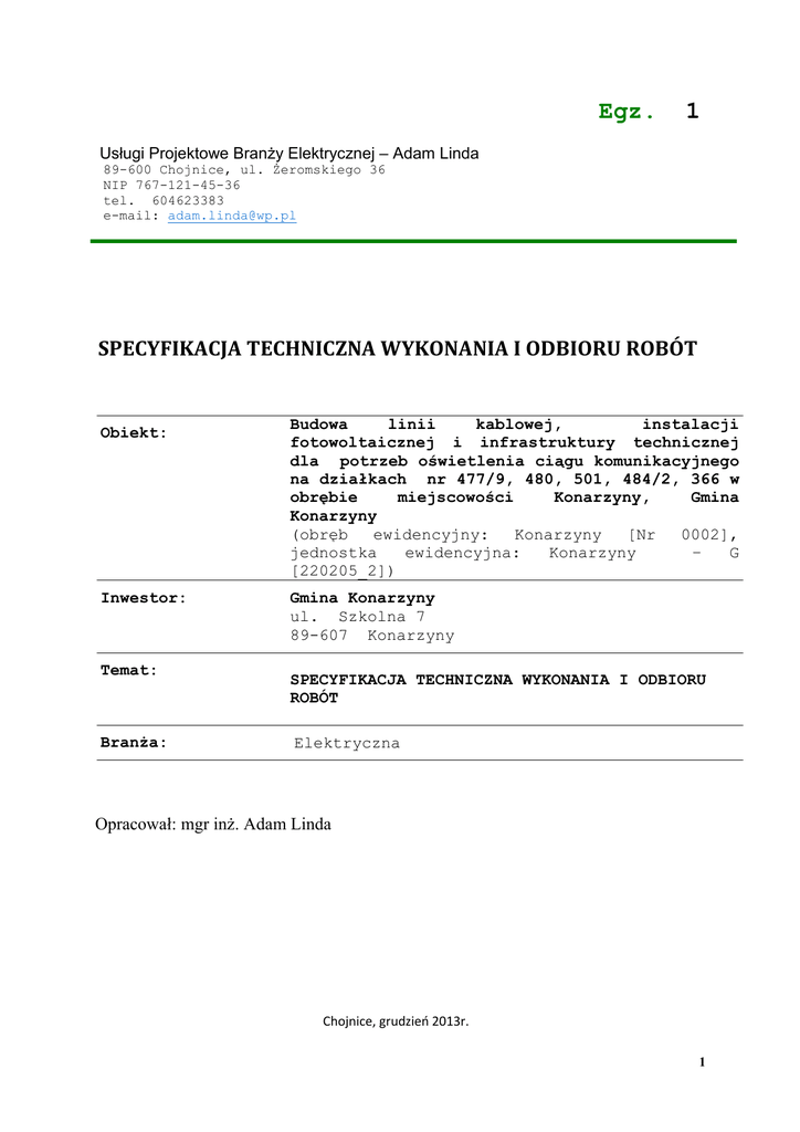 Egz. 1 Usługi Projektowe Branży Elektrycznej – Adam Linda 89-600 Chojnice, ul. Żeromskiego 36 NIP 767-121-45-36 tel. 604623383 e-mail: [email protected] SPECYFIKACJA TECHNICZNA WYKONANIA I ODBIORU ROBÓT Obiekt: Budowa linii kablowej, instalacji fotowoltaicznej i infrastruktury technicznej dla potrzeb oświetlenia ciągu komunikacyjnego na działkach nr 477/9, 480, 501, 484/2, 366 w obrębie miejscowości Konarzyny, Gmina Konarzyny (obręb ewidencyjny: Konarzyny [Nr 0002], jednostka ewidencyjna: Konarzyny – G [220205_2]) Inwestor: Gmina Konarzyny ul. Szkolna 7 89-607 Konarzyny Temat: Branża: SPECYFIKACJA TECHNICZNA WYKONANIA I ODBIORU ROBÓT Elektryczna Opracował: mgr inż. Adam Linda Chojnice, grudzień 2013r. 1 I WYMAGANIA OGÓLNE 1. 2. 3. 4. 5. 6. 7. 8. 9. 10. 11. Przedmiot ST Zakres robót objętych ST Ogólne wymagania dotyczące robót budowlanych Kwalifikacje kadry technicznej Wykonawcy Robót Przekazanie placu budowy Dokumentacja projektowa Zgodność robót z dokumentacja projektową i ST Tablice informacyjne Odbiory Ochrona przeciwpożarowa Bezpieczeństwo i higiena pracy II WYMAGANIA DOTYCZĄCE WYKONANIA I ODBIORU ROBÓT 1. 2. 3. 4. 5. 6. Roboty ziemne Konstrukcja wsporcza pod panele fotowoltaiczne Instalacja fotowoltaiczna Linia kablowa oświetleniowa Słupy i oprawy oświetleniowe Złącza i rozdzielnice I WYMAGANIA OGÓLNE 1. Przedmiot ST Przedmiotem niniejszej Specyfikacji Technicznej Wykonania i Odbioru Robót zwaną w dalszej części Specyfikacją Techniczną (ST) jest zbiór wymagań w zakresie wykonania zadania p.t. Budowa linii kablowej, instalacji fotowoltaicznej i infrastruktury technicznej dla potrzeb oświetlenia ciągu komunikacyjnego Gmina Konarzyny działki nr 477/9, 480, 501, 484/2, 366 Wszędzie tam, gdzie przy opisie przedmiotu zamówienia powołane są normy, aprobaty, specyfikacje techniczne i systemy odniesienia, bądź wskazane są znaki towarowe, patenty lub źródło pochodzenia (nazwy producentów lub urządzeń), postanowienia te należy odczytywać jako przykładowe, a wykonawca ma każdorazowo prawo zastosowania rozwiązania równoważnego. 2 2. Zakres robót objętych ST Zakres opracowania obejmuje następujące roboty: 1. roboty ziemne, 2. budowa sieci elektroenergetycznej i złącz kablowych, 3. wykonanie i montaż konstrukcji wsporczej na prefabrykowanym fundamencie betonowym, 4. montaż paneli fotowoltaicznych na konstrukcji wsporczej, 5. wykonanie instalacji elektrycznej, 6. wykonanie oświetlenia terenu. 3. Ogólne wymagania dotyczące robót budowlanych 1. Wykonawca jest odpowiedzialny za: prowadzenie Robót zgodnie z Kontraktem, jakość zastosowanych materiałów i wykonanych robót, bezpieczeństwo na budowie, metody organizacyjne przy wykonywaniu robót, zgodność z Dokumentacją Projektową, Specyfikacją Techniczną i zasadami sztuki budowlanej. 2. Decyzje Inwestora dotyczące akceptacji lub odrzucenia rozwiązań i elementów Robót będą oparte na wymaganiach sformułowanych w Kontrakcie, Dokumentacji Projektowej i ST a także w odpowiednich normach. 4. Kwalifikacje kadry technicznej Wykonawcy Robót Kierownik budowy, kierownicy poszczególnych rodzajów robót (budowlanych i elektrycznych) muszą posiadać uprawnienia do pełnienia samodzielnej funkcji technicznej w budownictwie oraz być członkami Izby Inżynierów budownictwa. Wymagany jest ciągły nadzór kadry technicznej nad prowadzonymi robotami. 5. Przekazanie placu budowy Zamawiający w terminie określonym w umowie przekaże Wykonawcy plac budowy wraz z Dziennikiem Budowy oraz Specyfikacją Techniczną (ST) i Projektem Budowlanym. Roboty związane z budową ogniw fotowoltaicznych tj. konstrukcja stalowa pod mocowanie ogniw, montaż ogniw fotowoltaicznych, instalacja elektryczna wraz z oświetleniem, zgodnie z Projektem Zagospodarowania Terenu. 3 6. Dokumentacja Projektowa Do kompleksowej realizacji zadania przygotowano dokumentacje projektową: 1. Projekt 2. Przedmiar robót 3. Specyfikacje Techniczne Wykonania i Odbioru Robót 7. Zgodność robót z dokumentacją projektową i ST Dokumentacja projektowa, ST i wszystkie dodatkowe dokumenty przekazane Wykonawcy przez Zamawiającego stanowią część umowy i są obowiązujące. 8. Tablice informacyjne Wykonawca zobowiązany jest do oznakowania placu budowy poprzez zabezpieczenie terenu budowy zgodnie z zasadami BHP. 9. Odbiory 1. Warunki i tryb przeprowadzenia odbiorów technicznych wykonania robót określają odpowiednie przepisy. 2. Odbiór robót zanikających i ulegających zakryciu polega na ocenie jakości wykonanych robót, które w dalszym procesie realizacji nie będą widoczne. 3. Odbiór robót zanikających i ulegających zakryciu będzie dokonany w czasie umożliwiającym wykonanie korekt i poprawek bez hamowania ogólnego postępu robót. 4. Gotowość danej części robót do odbioru zgłasza Wykonawca wpisem do Dziennika Budowy i jednoczesnym powiadomieniu Inwestora. Odbiór będzie przeprowadzony niezwłocznie, nie później jednak niż w ciągu trzech dni roboczych od daty zgłoszenia wpisem do Dziennika Budowy, a dla robót zanikowych w następnym dniu po zgłoszeniu gotowości. 5. Całkowite zakończenie Robót oraz gotowość do odbioru końcowego będzie stwierdzone przez Wykonawcę wpisem do Dziennika Budowy i jednoczesnym powiadomieniu Inspektora Nadzoru. 6. Odbiór końcowy Robót nastąpi w terminie wyznaczonym przez Zamawiającego w Dokumentach Kontraktowych. 7. Odbioru końcowego dokona komisja wyznaczona przez Zamawiającego w obecności Inspektora Nadzoru i Wykonawcy. Komisja dokona jakościowej oceny Robót na podstawie przedłożonych dokumentów, wyników badań i pomiarów, ocenie wizualnej oraz zgodności wykonania robót z Dokumentacją Projektową i ST. 8. W trakcie odbioru instalacji należy przedstawić następujące dokumenty: dokumentację techniczną z naniesionymi zmianami dokonanymi w czasie 4 budowy; -Dziennik budowy (oryginał); -protokoły z wykonanych pomiarów,