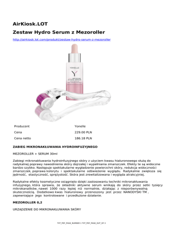 AirKiosk.LOT Zestaw Hydro Serum z Mezoroller http://airkiosk.lot.com/produkt/zestaw-hydro-serum-z-mezoroller Producent Yonelle Cena 229.00 PLN Cena netto 186.18 PLN ZABIEG MIKRONAKŁUWANIA HYDROINFUZYJNEGO MEZOROLLER + SERUM 30ml Zabiegi mikronakłuwania hydroinfuzyjnego skóry z użyciem kwasu hialuronowego służą do radykalnej poprawy nawodnienia skóry dojrzałej i wypełniania zmarszczek. Efekty te są widoczne bardzo szybko. Następuje spektakularne wygładzenie powierzchni skóry, redukcja widoczności zmarszczek, poprawa kolorytu i spektakularne odświeżenie wyglądu. Radykalnie zwiększa się jędrność, elastyczność, sprężystość. Skóra jest zrewitalizowana i wygląda atrakcyjniej. Radykalne efekty kosmetyczne osiągnięto dzięki zastosowaniu techniki mikronakłuwania infuzyjnego, która sprawia, że składniki aktywne serum wnikają do skóry przez setki tysięcy mikrokanalików, nawet 1000 razy lepiej niż normalnie, działając z nieporównywalną skutecznością. Dodatkowo kwas hialuronowy przenoszony jest przez NANODYSKI TM , zapewniające jego kontrolowane i przedłużone działanie. MEZOROLLER 0,2 URZĄDZENIE DO MIKRONAKŁUWANIA SKÓRY TXT_PDF_PAGE_NUMBER 1 TXT_PDF_PAGE_OUT_OF 3 Urządzenie przeznaczone do intensywnej stymulacji skóry dojrzałej w warunkach domowych. Posiada 600 certyfikowanych, cienkich igieł o długości 0,2 mm pokrytych tytanem, osadzonych na ruchomej rolce. Służy do mikronakłuwania naskórka, które polega na przesuwaniu urządzenia w różnych kierunkach po powierzchni skóry – tak zwanym rolowaniu. HYDRO-SERUM INFUZYJNE H₂O SPEKTAKULARNY EFEKT MŁODOŚCI Serum do każdego typu cery dojrzałej 40+, do stosowania pod krem. Działa progresywnie, z narastającym w czasie efektem odmładzania stanu i wyglądu skóry. Silnie skoncentrowane składniki infuzyjnie nawilżają, rewitalizują komórki oraz chronią przed ucieczką wody z naskórka. Cera staje się młodzieńczo świeża, sprężysta, jakby „napompowana”, miękka i zachwycająco gładka w dotyku. Zmarszczki ulegają wyraźnemu spłyceniu, a te drobniejsze nawet znikają. W serum zastosowano biologiczną wodę bambusową, darutozyd i innowacyjny system nawadniający, tworzący w skórze ZASADZKĘ NA WODĘ. Dzięki niej poprawa nawilżenia naskórka jest długotrwała i rekordowo duża, nawet o 100%. Ponadprzeciętne właściwości serum uzyskano dzięki NANODYSKOM™ , zwiększającym wnikanie substancji aktywnych do skóry. Sposób użycia: 1. Oczyszczanie: Przed użyciem dokładnie umyć ręce. Oczyścić skórę twarzy i szyi za pomocą wybranego preparatu do demakijażu. Następnie przemyć ją czystą wodą w celu usunięcia resztek preparatu i dokładnie osuszyć. 2. Mikronakłuwanie: Wykonać zabieg mikronakłuwania zgodnie ze schematem, zaczynając najlepiej od policzków, poprzez okolice ust, linię żuchwy, czoła i kończąc na szyi. Rolować szybkimi ruchami 3-4 razy w jednym kierunku – poziomo, pionowo i ukośnie. Utrzymywać jednakowy, lekki nacisk na skórę. Rolowanie powinno trwać około 2-3 minuty. Należy zachować szczególną ostrożność przede wszystkim w okolicach oczu. 3. Wmasowanie serum: Odpowiednią ilość preparatu nałóż na skórę twarzy oraz szyi i rozprowadź cienką warstwą. Zalecenia: Zabiegi mikronakłuwania zalecamy wykonywać 2-3 w tygodniu wieczorem, aż do zużycia całej buteleczki serum. W przypadku cery wrażliwej lub naczynkowej zabiegi wykonywać z mniejszą częstotliwością. W okresie niekorzystnych warunków pogodowych (mróz, upały) zmniejszyć częstotliwość wykonywania zabiegów. W początkowej fazie kuracji może pojawić się delikatne zaczerwienienie oraz zwiększona suchość skóry. Dlatego po zaaplikowaniu serum należy nałożyć krem pielęgnacyjny nocny lub dzienno-nocny YONELLE. Następnego dnia rano polecamy stosowanie Ekstranawilżającego Kremu Infuzyjnego H₂O lub Przeciwzmarszczkowego Krermu CC Infuzyjnego / SPF 10. UWAGA! WAŻNE! Mezoroller 0,2 jest urządzeniem osobistym, które może być używane wyłącznie TXT_PDF_PAGE_NUMBER 2 TXT_PDF_PAGE_OUT_OF 3 przez jedną osobę. Mikronakłuwanie wykonuje się wieczorem, wyłącznie na zdrowej skórze. Przeciwwskazania do zabiegów stanowią: • podrażnienia i stany zapalne skóry • stany alergiczne • aktywny trądzik młodzieńczy Po każdym zastosowaniu urządzenie należy spłukać pod bieżącą wodą a następnie spryskać zakupionym w aptece płynem do dezynfekcji lub 75% roztworem etanolu i wysuszyć. Przechowywać w załączonym pudełku w miejscu niedostępnym dla dzieci. Mezoroller 0,2 używać do skończenia serum. Przy kontynuowaniu kuracji stosować nowe urządzenie. TXT_PDF_PAGE_NUMBER 3 TXT_PDF_PAGE_OUT_OF 3