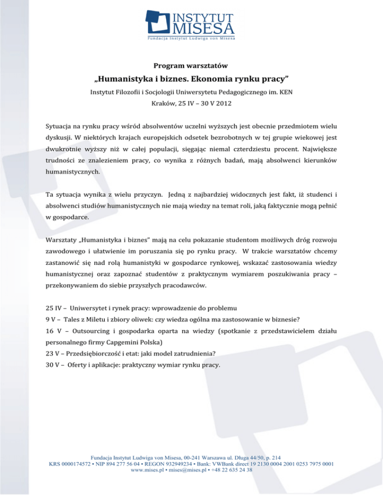 Program warsztatów „Humanistyka i biznes. Ekonomia rynku pracy” Instytut Filozofii i Socjologii Uniwersytetu Pedagogicznego im. KEN Kraków, 25 IV – 30 V 2012 Sytuacja na rynku pracy wśród absolwentów uczelni wyższych jest obecnie przedmiotem wielu dyskusji. W niektórych krajach europejskich odsetek bezrobotnych w tej grupie wiekowej jest dwukrotnie wyższy niż w całej populacji, sięgając niemal czterdziestu procent. Największe trudności ze znalezieniem pracy, co wynika z różnych badań, mają absolwenci kierunków humanistycznych. Ta sytuacja wynika z wielu przyczyn. Jedną z najbardziej widocznych jest fakt, iż studenci i absolwenci studiów humanistycznych nie mają wiedzy na temat roli, jaką faktycznie mogą pełnić w gospodarce. Warsztaty „Humanistyka i biznes” mają na celu pokazanie studentom możliwych dróg rozwoju zawodowego i ułatwienie im poruszania się po rynku pracy. W trakcie warsztatów chcemy zastanowić się nad rolą humanistyki w gospodarce rynkowej, wskazać zastosowania wiedzy humanistycznej oraz zapoznać studentów z praktycznym wymiarem poszukiwania pracy – przekonywaniem do siebie przyszłych pracodawców. 25 IV – Uniwersytet i rynek pracy: wprowadzenie do problemu 9 V – Tales z Miletu i zbiory oliwek: czy wiedza ogólna ma zastosowanie w biznesie? 16 V – Outsourcing i gospodarka oparta na wiedzy (spotkanie z przedstawicielem działu personalnego firmy Capgemini Polska) 23 V – Przedsiębiorczość i etat: jaki model zatrudnienia? 30 V – Oferty i aplikacje: praktyczny wymiar rynku pracy. Fundacja Instytut Ludwiga von Misesa, 00-241 Warszawa ul. Długa 44/50, p. 214 KRS 0000174572 ▪ NIP 894 277 56 04 ▪ REGON 932949234 ▪ Bank: VWBank direct 19 2130 0004 2001 0253 7975 0001 www.mises.pl ▪ [email protected] ▪ +48 22 635 24 38