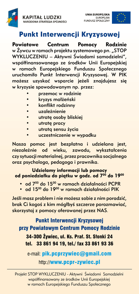 Punkt Interwencji Kryzysowej Powiatowe Centrum Pomocy Rodzinie w Żywcu w ramach projektu systemowego pn. „STOP WYKLUCZENIU – Aktywni Świadomi samodzielni”, współfinansowanego ze środków Unii Europejskiej w ramach Europejskiego Funduszu Społecznego uruchomiło Punkt Interwencji Kryzysowej. W PIK możesz uzyskać wsparcie jeżeli znajdujesz się w kryzysie spowodowanym np. przez: • przemoc w rodzinie • kryzys małżeński • konflikt rodzinny • uzależnienie • utratę osoby bliskiej • utratę pracy • utratą sensu życia • uczestniczenie w wypadku Nasza pomoc jest bezpłatna i udzielana jest, niezależnie od wieku, zawodu, wykształcenia czy sytuacji materialnej, przez pracownika socjalnego oraz psychologa, pedagoga i prawnika. Udzielamy informacji lub pomocy od poniedziałku do piątku w godz. od 700 do 1900 • od 700 do 1500 w ramach działalności PCPR • od 1500 do 1900 w ramach działalności PIK Jeśli masz problem i nie możesz sobie z nim poradzić, brak Ci kogoś z kim mógłbyś szczerze porozmawiać, skorzystaj z pomocy oferowanej przez NAS. Punkt Interwencji Kryzysowej przy Powiatowym Centrum Pomocy Rodzinie 34-300 Żywiec, ul. Ks. Prał. St. Słonki 24 tel. 33 861 94 19, tel./ fax 33 861 93 36 e-mail: [email protected] http://www.pcpr-zywiec.pl Projekt STOP WYKLUCZENIU - Aktywni Świadomi Samodzielni współfinansowany ze środków Unii Europejskiej w ramach Europejskiego Funduszu Społecznego Czym jest kryzys? O kryzysie mówimy wtedy, gdy osoba doznaje nadmiernego stresu, który sprawia, że niemożliwe staje się prawidłowe funkcjonowanie. Wszystkie sposoby radzenia sobie w trudnej sytuacji, które dotąd były skuteczne, teraz zawodzą i nie przynoszą ulgi. Kryzys może być odpowiedzią zarówno na pojedyncze wydarzenie jak i na kilka zdarzeń występujących w niewielkich odstępach czasu. Osoba doznająca kryzysu przeżywa ekstremalne uczucia takie jak np. lęk, złość, rozpacz, poczucie winy i krzywdy, bezradność. Odczuwane emocje są bardzo intensywne, oprócz tego mogą pojawiać się kłopoty z koncentracją i pamięcią, zaburzenia snu, koszmary senne, zmiana apetytu, zmiana aktywności (np. wycofanie się), poczucie zmęczenia, częste zmiany nastrojów, agresja. Nierozwiązany kryzys może być zagrożeniem. Ale przy właściwej pomocy możesz go pozytywnie wykorzystać dla własnego rozwoju. Kryzys jest przeżyciem, które stwarza okazję do podejmowania nowych wyborów, poszukiwania nowych sposobów działania. Tym, co decyduje o wartości doświadczenia, jest sens, jaki nadaje mu jednostka. Kryzys jest normalną reakcją człowieka na trudną sytuację, w której dotychczasowe sposoby rozwiązywania problemów stały się niewystarczające. Jeśli nie radzisz sobie z problemem możesz skorzystać z pomocy oferowanej przez PCPR i PIK. Projekt STOP WYKLUCZENIU - Aktywni Świadomi Samodzielni współfinansowany ze środków Unii Europejskiej w ramach Europejskiego Funduszu Społecznego