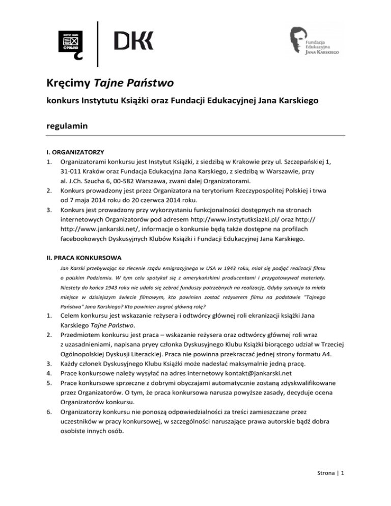 Kręcimy Tajne Państwo konkurs Instytutu Książki oraz Fundacji Edukacyjnej Jana Karskiego regulamin I. ORGANIZATORZY 1. Organizatorami konkursu jest Instytut Książki, z siedzibą w Krakowie przy ul. Szczepańskiej 1, 31-011 Kraków oraz Fundacja Edukacyjna Jana Karskiego, z siedzibą w Warszawie, przy al. J.Ch. Szucha 6, 00-582 Warszawa, zwani dalej Organizatorami. 2. Konkurs prowadzony jest przez Organizatora na terytorium Rzeczypospolitej Polskiej i trwa od 7 maja 2014 roku do 20 czerwca 2014 roku. 3. Konkurs jest prowadzony przy wykorzystaniu funkcjonalności dostępnych na stronach internetowych Organizatorów pod adresem http://www.instytutksiazki.pl/ oraz http:// http://www.jankarski.net/, informacje o konkursie będą także dostępne na profilach facebookowych Dyskusyjnych Klubów Książki i Fundacji Edukacyjnej Jana Karskiego. II. PRACA KONKURSOWA Jan Karski przebywając na zlecenie rządu emigracyjnego w USA w 1943 roku, miał się podjąć realizacji filmu o polskim Podziemiu. W tym celu spotykał się z amerykańskimi producentami i przygotowywał materiały. Niestety do końca 1943 roku nie udało się zebrać funduszy potrzebnych na realizację. Gdyby sytuacja ta miała miejsce w dzisiejszym świecie filmowym, kto powinien zostać reżyserem filmu na podstawie "Tajnego Państwa" Jana Karskiego? Kto powinien zagrać główną rolę? 1. 2. 3. 4. 5. 6. Celem konkursu jest wskazanie reżysera i odtwórcy głównej roli ekranizacji książki Jana Karskiego Tajne Państwo. Przedmiotem konkursu jest praca – wskazanie reżysera oraz odtwórcy głównej roli wraz z uzasadnieniami, napisana pryey członka Dyskusyjnego Klubu Książki biorącego udział w Trzeciej Ogólnopolskiej Dyskusji Literackiej. Praca nie powinna przekraczać jednej strony formatu A4. Każdy członek Dyskusyjnego Klubu Książki może nadesłać maksymalnie jedną pracę. Prace konkursowe należy wysyłać na adres internetowy [email protected] Prace konkursowe sprzeczne z dobrymi obyczajami automatycznie zostaną zdyskwalifikowane przez Organizatorów. O tym, że praca konkursowa narusza powyższe zasady, decyduje ocena Organizatorów konkursu. Organizatorzy konkursu nie ponoszą odpowiedzialności za treści zamieszczane przez uczestników w pracy konkursowej, w szczególności naruszające prawa autorskie bądź dobra osobiste innych osób. Strona | 1 III. ZASADY UCZESTNICTWA W KONKURSIE I OCHRONA DANYCH OSOBOWYCH 1. Konkurs ma charakter otwarty. 2. Udział w konkursie jest dobrowolny i bezpłatny. 3. Uczestnikami konkursu mogą być wyłącznie osoby fizyczne, pełnoletnie i posiadające pełną zdolność do czynności prawnych, które zgłosiły udział w konkursie poprzez przesłanie na adres internetowy wskazany w pkt II ppkt 4 niniejszego Regulaminu, pracy konkursowej wraz z podaniem imienia i nazwiska autora pracy oraz nazwy i adresu klubu, którego jest członkiem. W treści maila należy zamieścić poniższe oświadczenie: „Wyrażam zgodę na przetwarzanie przez Instytut Książki z siedzibą w Krakowie (kod pocztowy 31-011) przy ul. Szczepańskiej 1 danych osobowych, w celu uczestnictwa w konkursie Kręcimy Tajne Państwo, którego Organizatorami są Instytut Książki i Fundacja Edukacyjna Jana Karskiego, na warunkach określonych w regulaminie konkursu, który to w pełni akceptuję. Jednocześnie jestem świadomy, iż przesłana przeze mnie praca konkursowa może być upubliczniana wraz z podaniem imienia i nazwiska, jako autora pracy na zasadach określonych w regulaminie, na co niniejszym wyrażam zgodę. Wyrażenie zgody jest dobrowolne, jednakże niezbędne dla uczestnictwa w konkursie. Jestem świadomy, iż przysługuje mi prawo wglądu do treści swoich danych oraz ich poprawiania.” 4. Brak spełnienia warunków opisanych w ppkt 3 uniemożliwia rejestrację uczestników w konkursie. 5. W konkursie nie mogą brać udziału pracownicy Instytutu Książki oraz pracownicy Fundacji Edukacyjnej Jana Karskiego. 6. Przesłane prace konkursowe mogą być upublicznione na profilu facebookowym Dyskusyjnych Klubów Książki oraz Fundacji Edukacyjnej Jana Karskiego, dodatkowo przesłane prace konkursowe wraz z podaniem imion i nazwisk autorów mogą być upubliczniane pod adresem http://www.instytutksiazki.pl/ oraz http://www.jankarski.net/pl/, na co uczestnik wyraża zgodę zgłaszając swoje uczestnictwo w konkursie zgodnie z postanowieniami ppkt 3. 7. Administratorem danych osobowych zebranych na potrzeby realizacji ww. konkursu jest Instytut Książki. Pozyskane dane przetwarzane będą zgodnie z przepisami ustawy z dnia 29 sierpnia 1997 r. o ochronie danych osobowych (tekst jedn. Dz. U. z 2002 r., Nr 101 poz. 926 ze zm.), w celu przeprowadzenia i organizacji konkursu, w tym wyłonienia laureatów oraz wręczenia im nagród lub ewentualnego rozpatrzenia reklamacji. Osobie, której dane dotyczą, przysługuje prawo dostępu do treści jej danych oraz możliwość ich poprawiania. Podanie danych jest dobrowolne, jednak niezbędne do wzięcia udziału w konkursie oraz realizacji przez Organizatorów niniejszego konkursu. IV. PRZEBIEG KONKURSU I OGŁOSZENIE WYNIKÓW 1. Organizatorzy po wyłonieniu laureatów konkursu podadzą do publicznej wiadomości informacje w postaci imion i nazwisk laureatów oraz przyznanej mu nagrody oraz upublicznią treść pracy. Powyższe informacje upubliczniane będą na stronach internetowych: http://www.instytutksiazki.pl/ oraz http://www.jankarski.net/, zaś na profilu facebookowym Strona | 2 Dyskusyjnych Klubów Książki i Fundacji Edukacyjnej Jana Karskiego upublicznione zostaną wyłącznie prace konkursowe Laureatów Konkursu. V. NAGRODY 1. Prace będą oceniane przez jury składające się z przedstawicieli Instytutu Książki oraz Fundacji Edukacyjnej Jana Karskiego. 2. Jury wyłoni trzy najlepsze prace, których autorzy otrzymają nagrodę w postaci bezpłatnej wycieczki do Muzeum Historii Żydów Polskich. 3. Termin wycieczki – nagrody dla laure