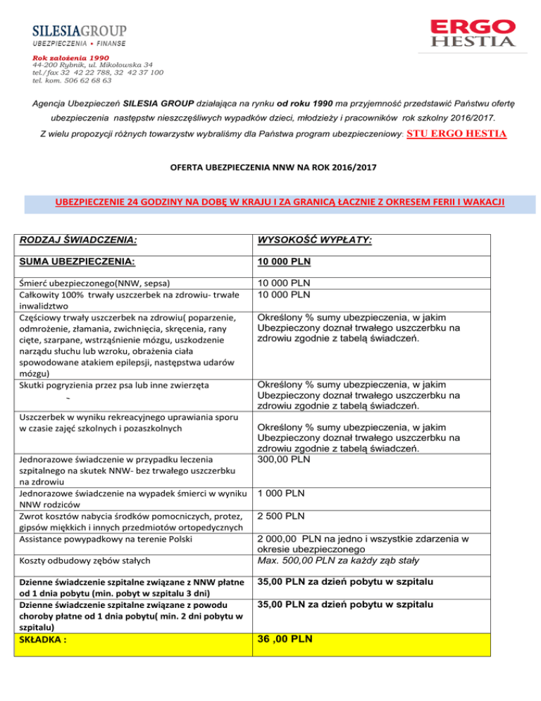 Rok założenia 1990 44-200 Rybnik, ul. Mikołowska 34 tel./fax 32 42 22 788, 32 42 37 100 tel. kom. 506 62 68 63 Agencja Ubezpieczeń SILESIA GROUP działająca na rynku od roku 1990 ma przyjemność przedstawić Państwu ofertę ubezpieczenia następstw nieszczęśliwych wypadków dzieci, młodzieży i pracowników rok szkolny 2016/2017. Z wielu propozycji różnych towarzystw wybraliśmy dla Państwa program ubezpieczeniowy: STU ERGO HESTIA OFERTA UBEZPIECZENIA NNW NA ROK 2016/2017 UBEZPIECZENIE 24 GODZINY NA DOBĘ W KRAJU I ZA GRANICĄ ŁACZNIE Z OKRESEM FERII I WAKACJI RODZAJ ŚWIADCZENIA: WYSOKOŚĆ WYPŁATY: SUMA UBEZPIECZENIA: 10 000 PLN Śmierć ubezpieczonego(NNW, sepsa) Całkowity 100% trwały uszczerbek na zdrowiu- trwałe inwalidztwo Częściowy trwały uszczerbek na zdrowiu( poparzenie, odmrożenie, złamania, zwichnięcia, skręcenia, rany cięte, szarpane, wstrząśnienie mózgu, uszkodzenie narządu słuchu lub wzroku, obrażenia ciała spowodowane atakiem epilepsji, następstwa udarów mózgu) Skutki pogryzienia przez psa lub inne zwierzęta 10 000 PLN 10 000 PLN Uszczerbek w wyniku rekreacyjnego uprawiania sporu w czasie zajęć szkolnych i pozaszkolnych Jednorazowe świadczenie w przypadku leczenia szpitalnego na skutek NNW- bez trwałego uszczerbku na zdrowiu Jednorazowe świadczenie na wypadek śmierci w wyniku NNW rodziców Zwrot kosztów nabycia środków pomocniczych, protez, gipsów miękkich i innych przedmiotów ortopedycznych Assistance powypadkowy na terenie Polski Koszty odbudowy zębów stałych Określony % sumy ubezpieczenia, w jakim Ubezpieczony doznał trwałego uszczerbku na zdrowiu zgodnie z tabelą świadczeń. Określony % sumy ubezpieczenia, w jakim Ubezpieczony doznał trwałego uszczerbku na zdrowiu zgodnie z tabelą świadczeń. Określony % sumy ubezpieczenia, w jakim Ubezpieczony doznał trwałego uszczerbku na zdrowiu zgodnie z tabelą świadczeń. 300,00 PLN 1 000 PLN 2 500 PLN 2 000,00 PLN na jedno i wszystkie zdarzenia w okresie ubezpieczonego Max. 500,00 PLN za każdy ząb stały Dzienne świadczenie szpitalne związane z NNW płatne od 1 dnia pobytu (min. pobyt w szpitalu 3 dni) Dzienne świadczenie szpitalne związane z powodu choroby płatne od 1 dnia pobytu( min. 2 dni pobytu w szpitalu) 35,00 PLN za dzień pobytu w szpitalu SKŁADKA : 36 ,00 PLN 35,00 PLN za dzień pobytu w szpitalu SILESIA GROUP 44-200, Rybnik ul. Mikołowska 34 tel. 32 42 22 788, tel. kom. 506-62-68-63 Regon 240 796 562 NIP 6423025950