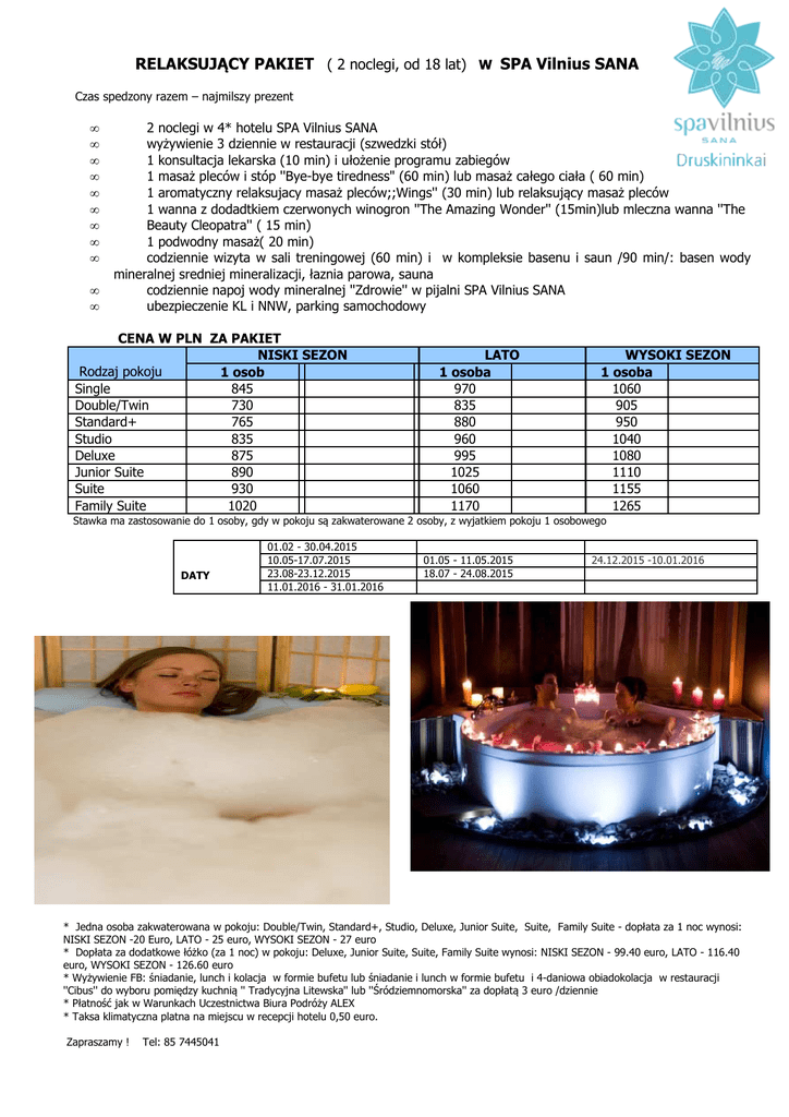 RELAKSUJĄCY PAKIET ( 2 noclegi, od 18 lat) W SPA Vilnius SANA Czas spedzony razem – najmilszy prezent • • • • • • • • • • • 2 noclegi w 4* hotelu SPA Vilnius SANA wyżywienie 3 dziennie w restauracji (szwedzki stół) 1 konsultacja lekarska (10 min) i ułożenie programu zabiegów 1 masaż pleców i stóp ''Bye-bye tiredness" (60 min) lub masaż całego ciała ( 60 min) 1 aromatyczny relaksujacy masaż pleców;;Wings'' (30 min) lub relaksujący masaż pleców 1 wanna z dodadtkiem czerwonych winogron ''The Amazing Wonder'' (15min)lub mleczna wanna ''The Beauty Cleopatra'' ( 15 min) 1 podwodny masaż( 20 min) codziennie wizyta w sali treningowej (60 min) i w kompleksie basenu i saun /90 min/: basen wody mineralnej sredniej mineralizacji, łaznia parowa, sauna codziennie napoj wody mineralnej ''Zdrowie'' w pijalni SPA Vilnius SANA ubezpieczenie KL i NNW, parking samochodowy CENA W PLN ZA PAKIET NISKI SEZON Rodzaj pokoju 1 osob Single 845 Double/Twin 730 Standard+ 765 Studio 835 Deluxe 875 Junior Suite 890 Suite 930 Family Suite 1020 LATO 1 osoba 970 835 880 960 995 1025 1060 1170 WYSOKI SEZON 1 osoba 1060 905 950 1040 1080 1110 1155 1265 Stawka ma zastosowanie do 1 osoby, gdy w pokoju są zakwaterowane 2 osoby, z wyjatkiem pokoju 1 osobowego DATY 01.02 - 30.04.2015 10.05-17.07.2015 23.08-23.12.2015 11.01.2016 - 31.01.2016 01.05 - 11.05.2015 18.07 - 24.08.2015 24.12.2015 -10.01.2016 * Jedna osoba zakwaterowana w pokoju: Double/Twin, Standard+, Studio, Deluxe, Junior Suite, Suite, Family Suite - dopłata za 1 noc wynosi: NISKI SEZON -20 Euro, LATO - 25 euro, WYSOKI SEZON - 27 euro * Dopłata za dodatkowe łóżko (za 1 noc) w pokoju: Deluxe, Junior Suite, Suite, Family Suite wynosi: NISKI SEZON - 99.40 euro, LATO - 116.40 euro, WYSOKI SEZON - 126.60 euro * Wyżywienie FB: śniadanie, lunch i kolacja w formie bufetu lub śniadanie i lunch w formie bufetu i 4-daniowa obiadokolacja w restauracji ''Cibus'' do wyboru pomiędzy kuchnią '' Tradycyjna Litewska'' lub ''Śródziemnomorska'' za dopłatą 3 euro /dziennie * Płatność jak w Warunkach Uczestnictwa Biura Podróży ALEX * Taksa klimatyczna platna na miejscu w recepcji hotelu 0,50 euro. Zapraszamy ! Tel: 85 7445041
