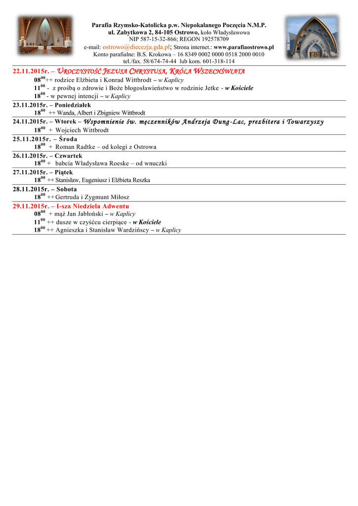 Parafia Rzymsko-Katolicka p.w. Niepokalanego Poczęcia N.M.P. ul. Zabytkowa 2, 84-105 Ostrowo, koło Władysławowa NIP 587-15-32-866; REGON 192578709 e-mail: [email protected]; Strona internet.: www.parafiaostrowo.pl Konto parafialne: B.S. Krokowa – 16 8349 0002 0000 0518 2000 0010 tel./fax. 58/674-74-44 lub kom. 601-318-114 22.11.2015r. – U ROCZYSTOŚĆ JEZUSA CHRYSTUSA, KRÓLA WSZECHŚWIATA 0800++ rodzice Elżbieta i Konrad Wittbrodt – w Kaplicy 1100 - z prośbą o zdrowie i Boże błogosławieństwo w rodzinie Jetke - w Kościele 1800 - w pewnej intencji – w Kaplicy 23.11.2015r. – Poniedziałek 1800 ++ Wanda, Albert i Zbigniew Wittbrodt 24.11.2015r. – Wtorek – Wspomnienie św. męczenników Andrzeja Dung -Lac, prezbitera i Towarzyszy 1800 + Wojciech Wittbrodt 25.11.2015r. – Środa 1800 + Roman Radtke – od kolegi z Ostrowa 26.11.2015r. – Czwartek 1800 + babcia Władysława Roeske – od wnuczki 27.11.2015r. – Piątek 1800 ++ Stanisław, Eugeniusz i Elżbieta Reszka 28.11.2015r. – Sobota 1800 ++ Gertruda i Zygmunt Miłosz 29.11.2015r. – I-sza Niedziela Adwentu 0800 + mąż Jan Jabłoński – w Kaplicy 1100 ++ dusze w czyśćcu cierpiące - w Kościele 1800 ++ Agnieszka i Stanisław Wardzińscy – w Kaplicy