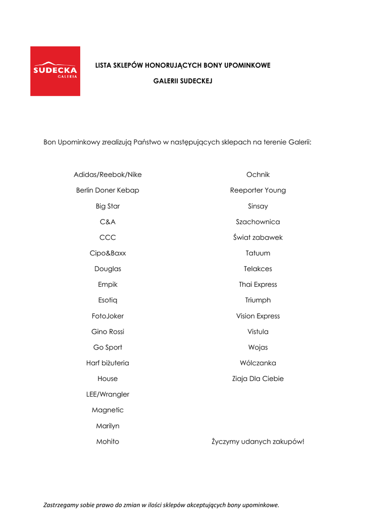 LISTA SKLEPÓW HONORUJĄCYCH BONY UPOMINKOWE GALERII SUDECKEJ Bon Upominkowy zrealizują Państwo w następujących sklepach na terenie Galerii: Adidas/Reebok/Nike Ochnik Berlin Doner Kebap Reeporter Young Big Star Sinsay C&A Szachownica CCC Świat zabawek Cipo&Baxx Tatuum Douglas Telakces Empik Thai Express Esotiq Triumph FotoJoker Vision Express Gino Rossi Vistula Go Sport Wojas Harf biżuteria Wólczanka House Ziaja Dla Ciebie LEE/Wrangler Magnetic Marilyn Mohito Życzymy udanych zakupów! Zastrzegamy sobie prawo do zmian w ilości sklepów akceptujących bony upominkowe.